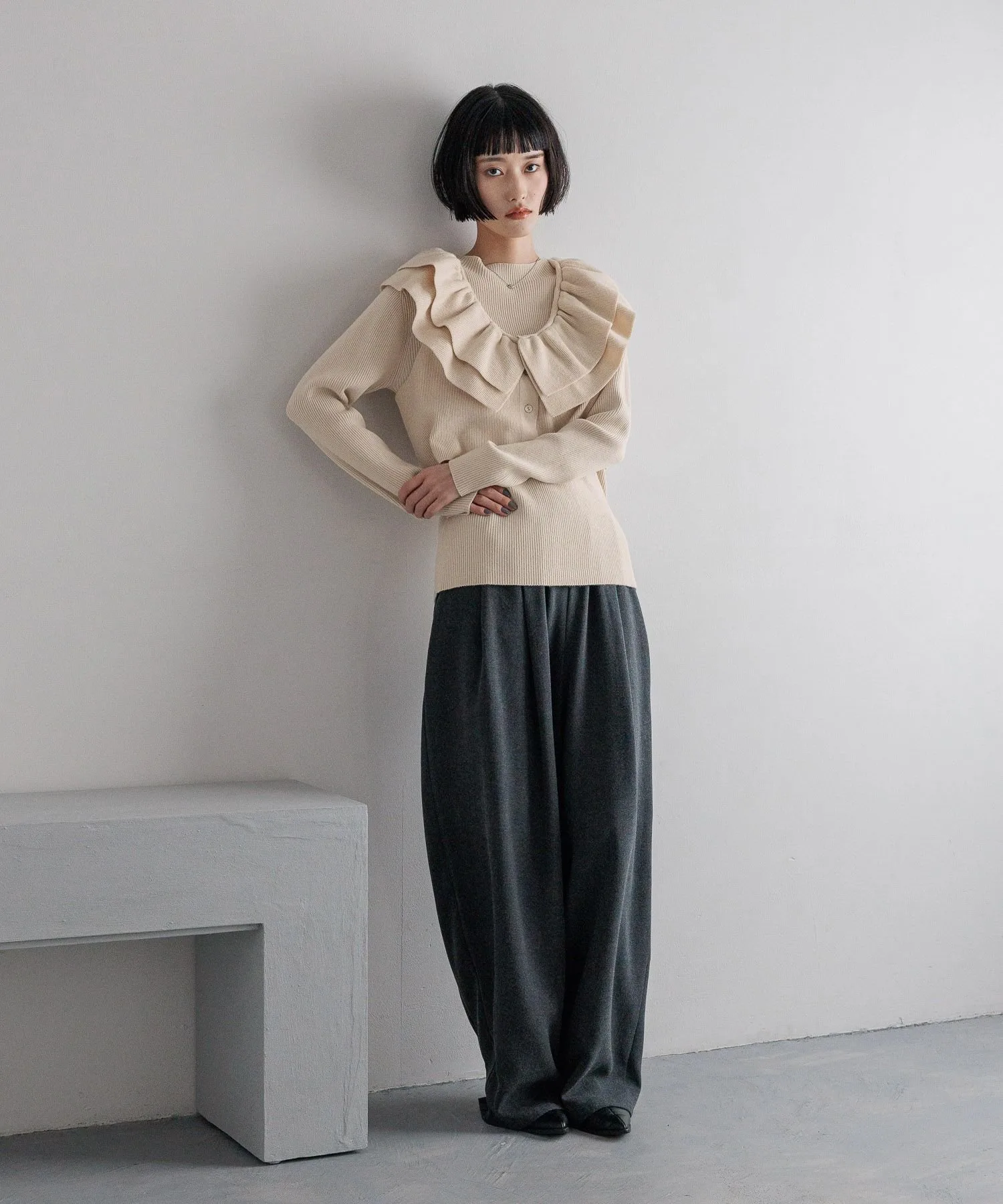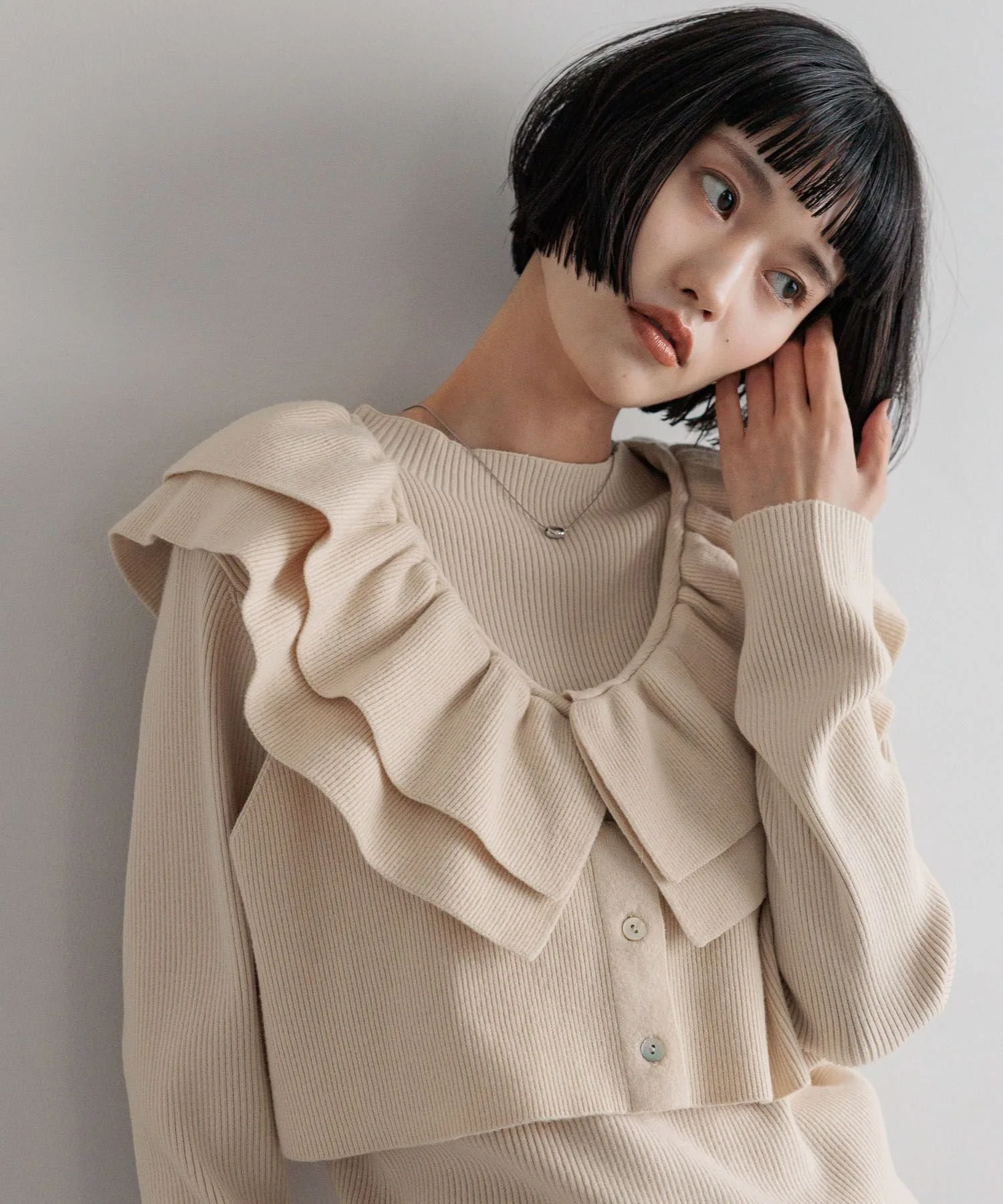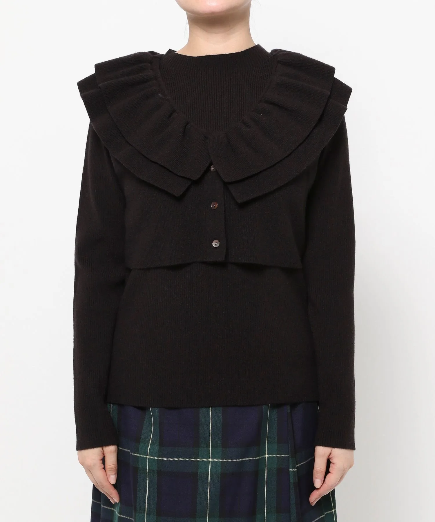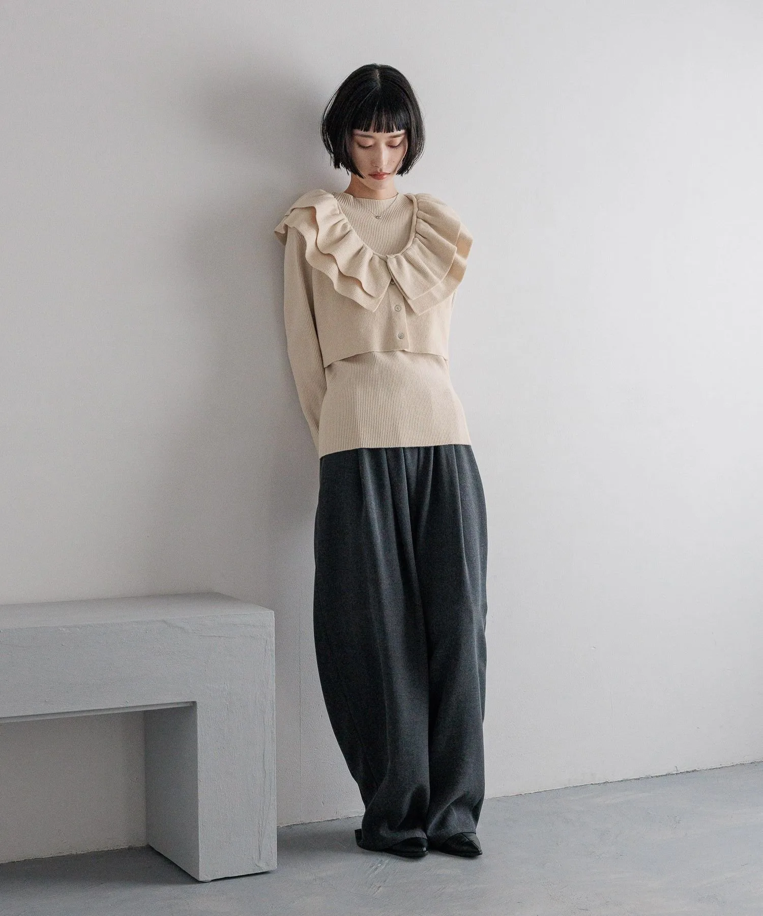 Комплект из двух предметов, состоящий из короткого жилета с оборками и ребристого пуловера с высоким воротником.