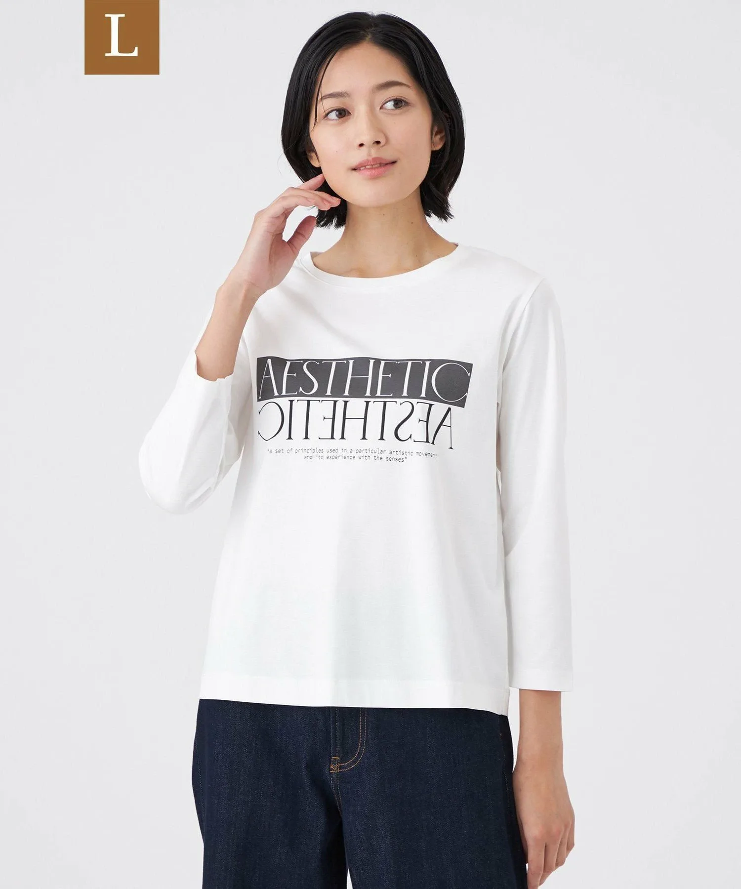 Принт "AESTHETIC" означает "чувство красоты" или "глаз на красоту". Рукава длиной три четверти делают эту футболку любимой на долгие годы. Блестящая ткань и яркий цвет поднимут вам настроение.