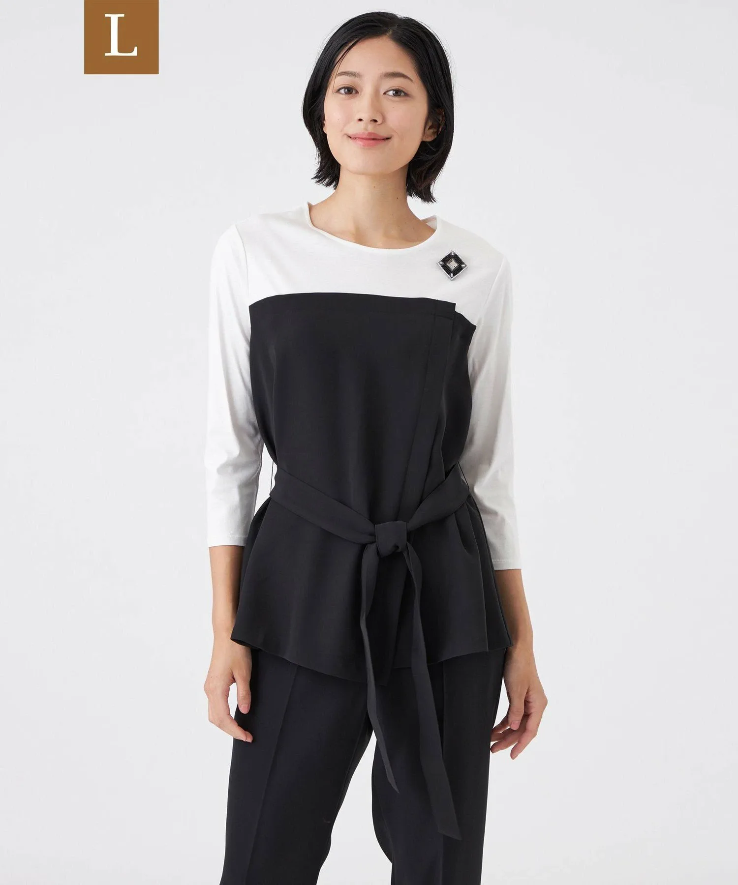 Этот пуловер сочетает в себе различные материалы, создавая впечатление модного бюстье, надетого поверх другого. Его четкий А-образный силуэт расширяется от талии до низа, а компактный размер делает его идеальным в качестве нижнего слоя под жакет. Съемная лента на талии позволяет создавать различные варианты стилизации. Мы также рекомендуем сочетать его с брюками (U1R03-643) из того же материала.