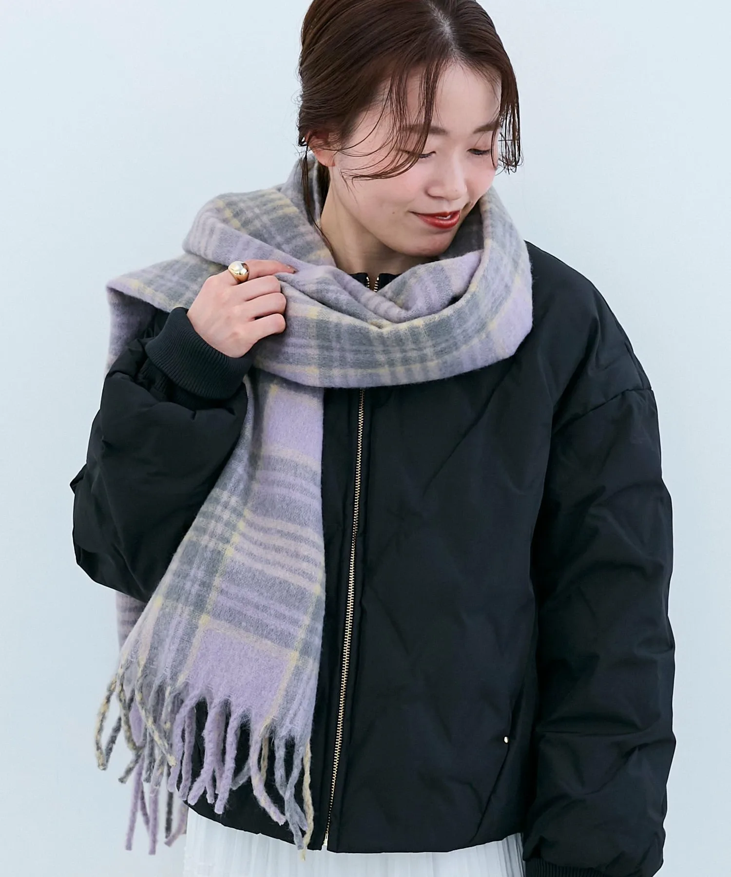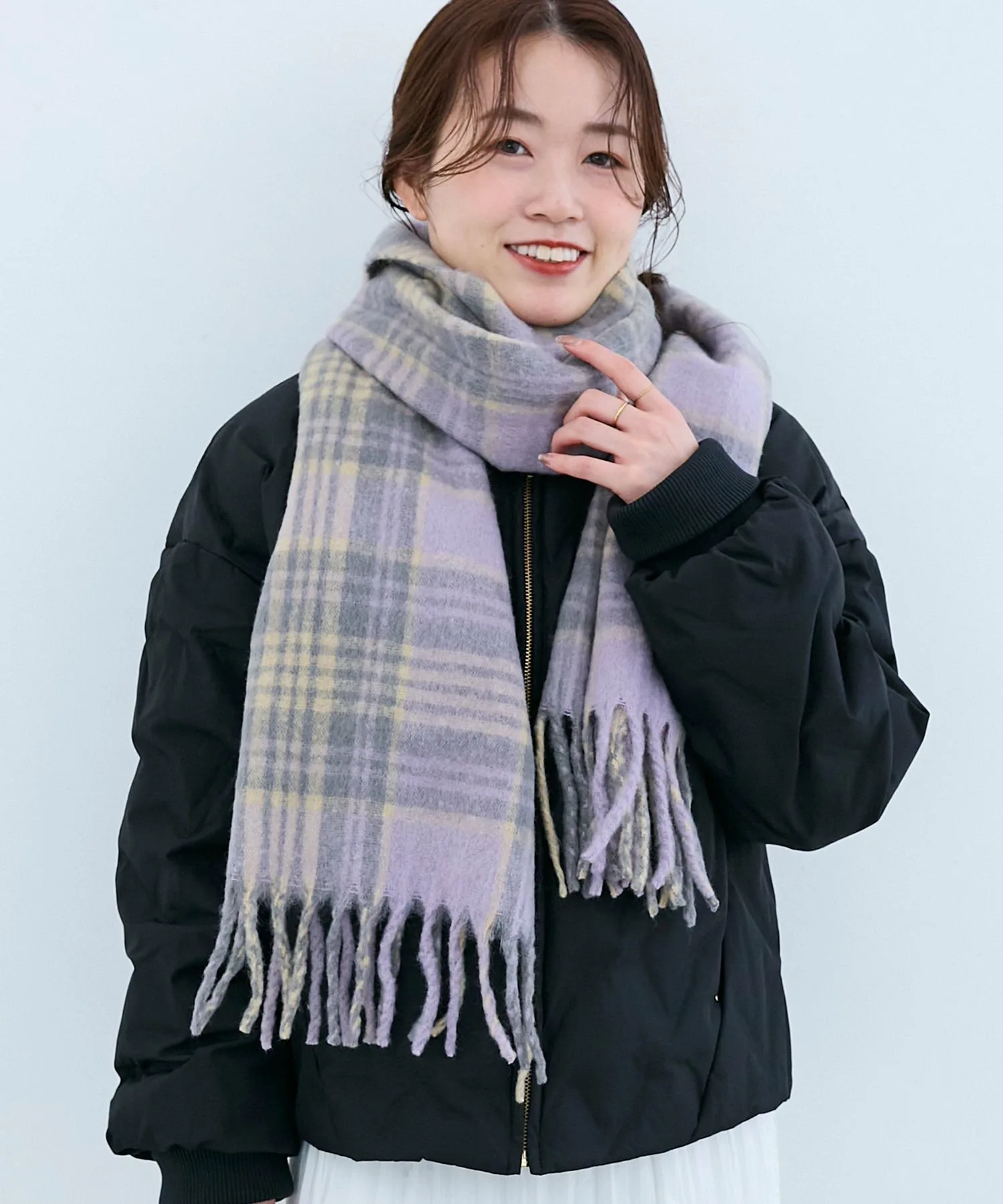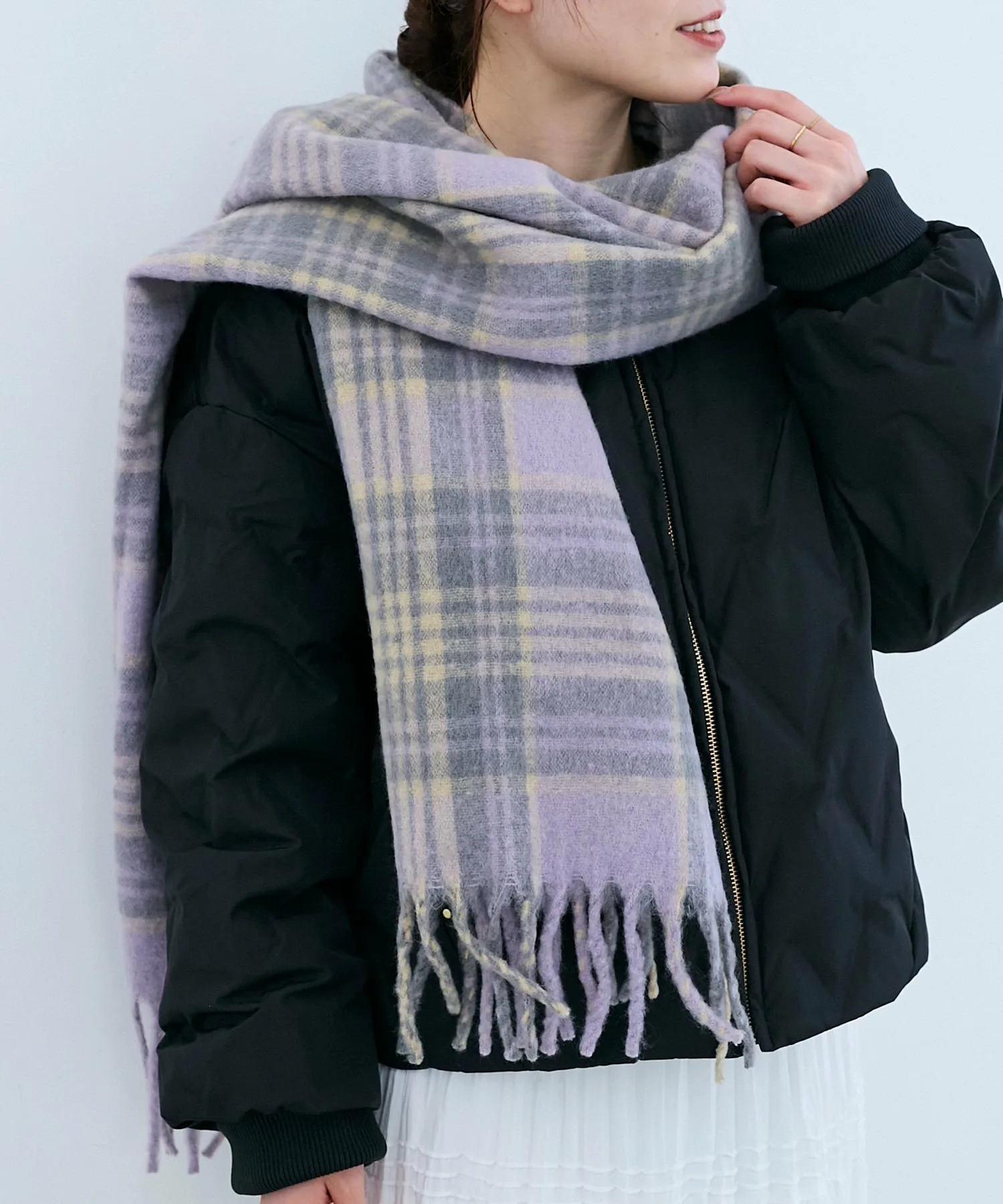 Клетчатый шарф с мягкой, пушистой и приятной на ощупь текстурой.