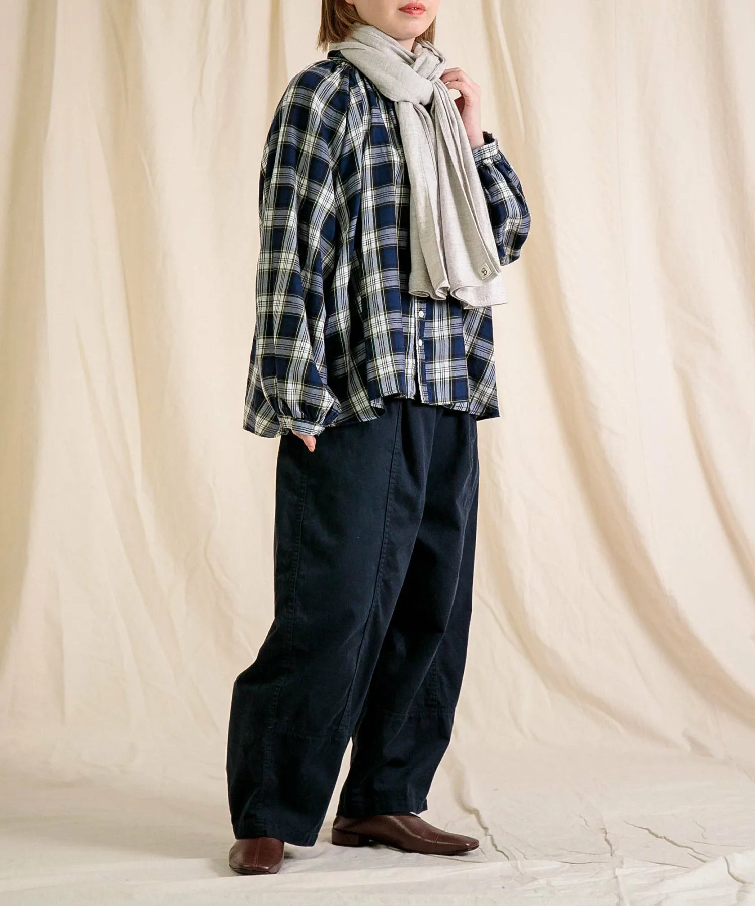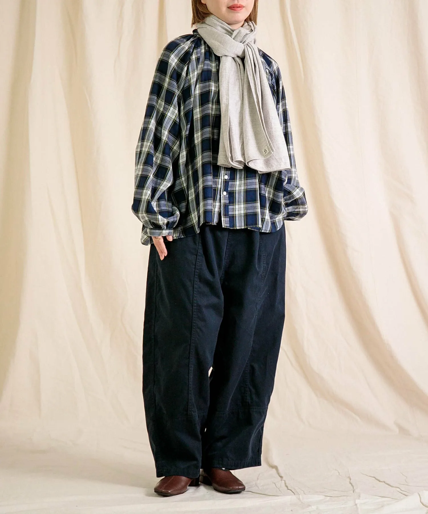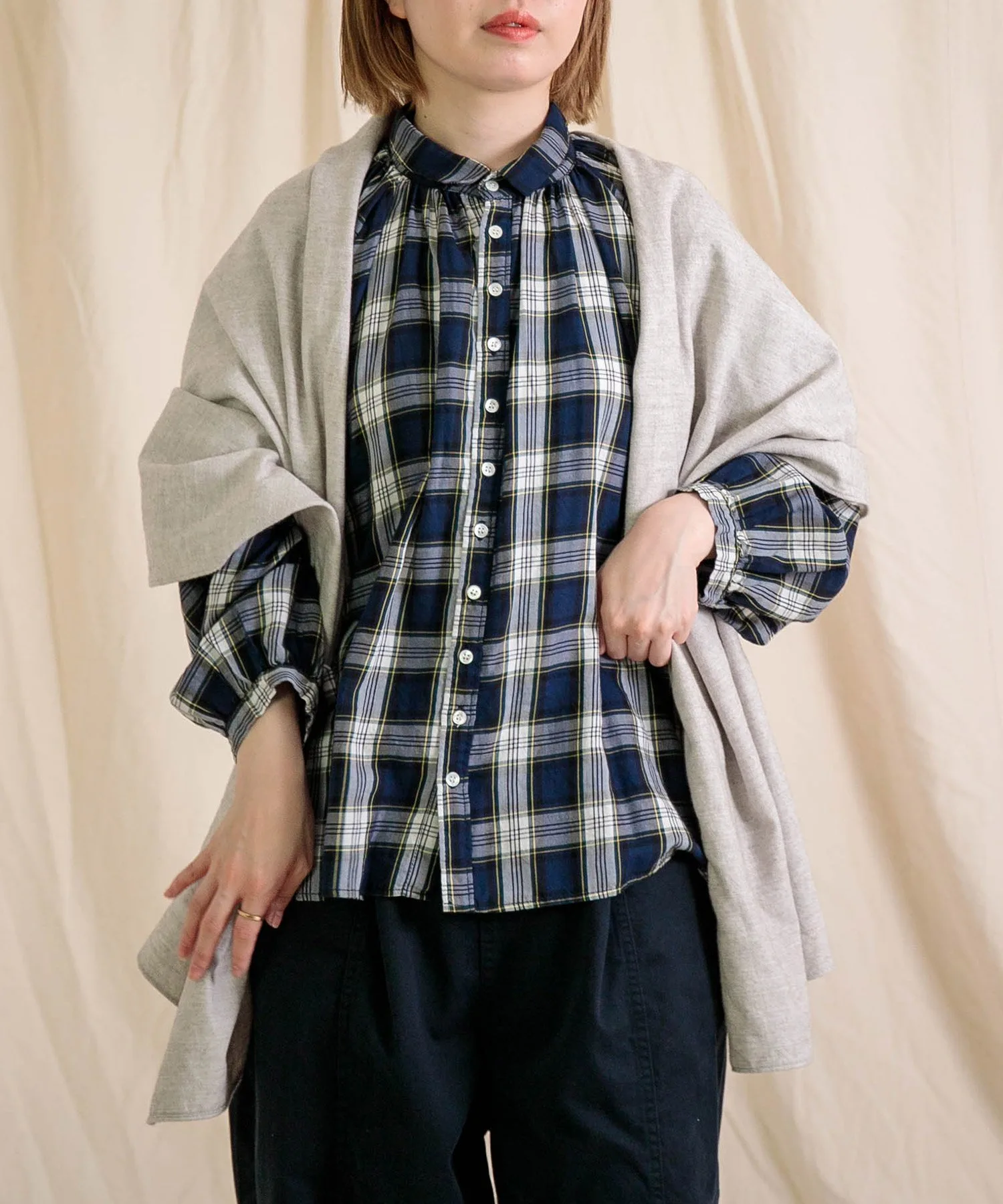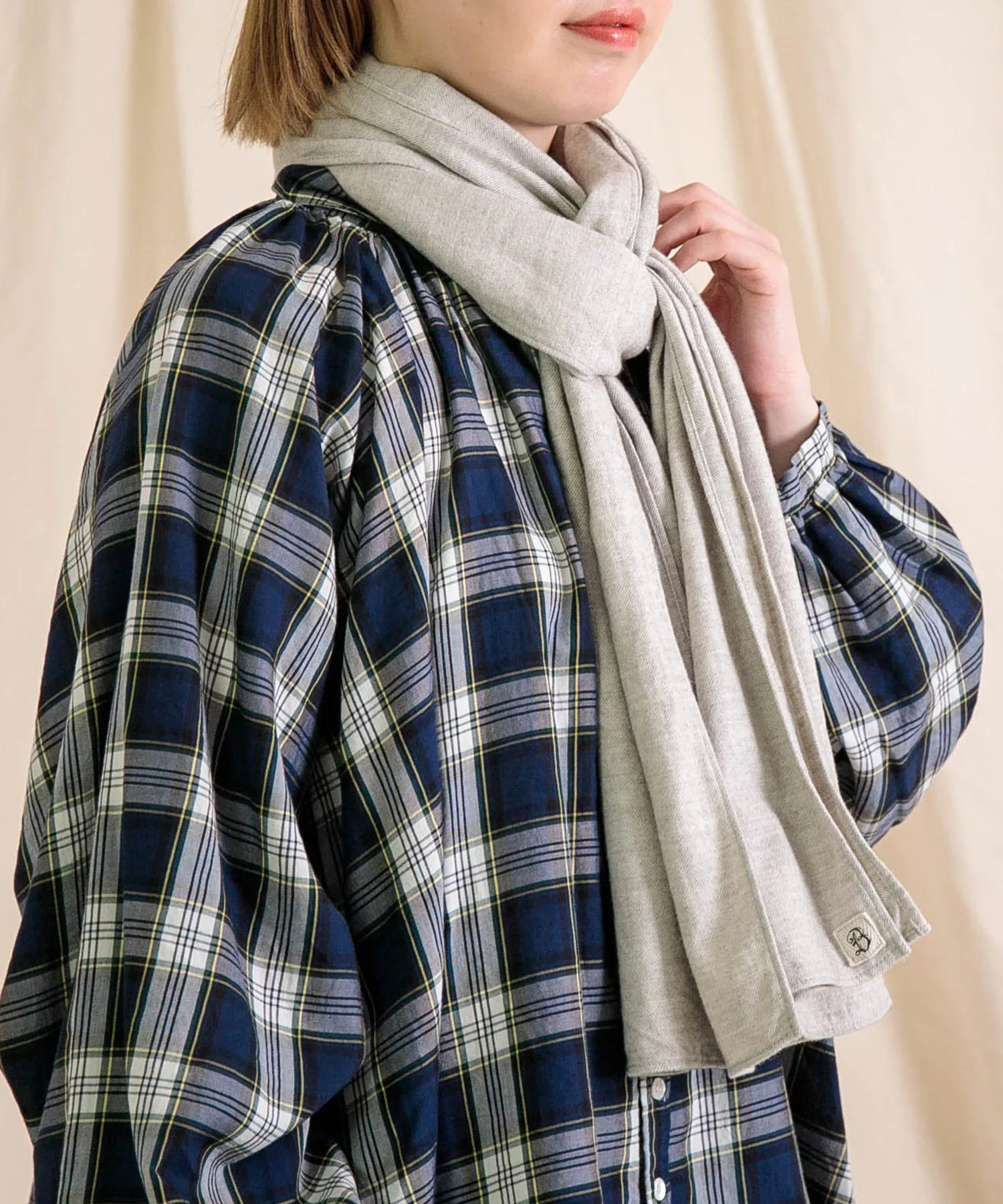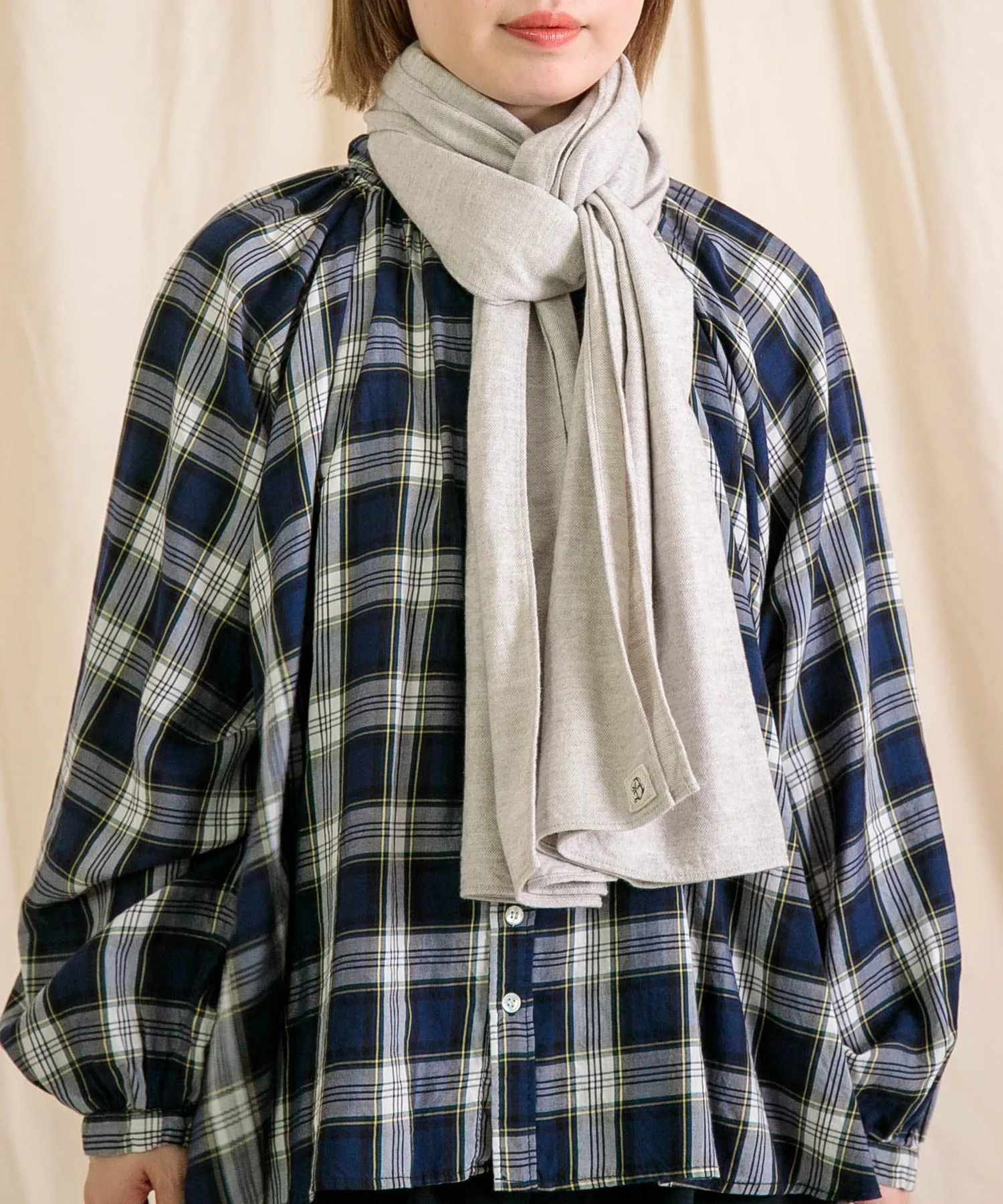 ◇ Отзыв о ношенииH155/Ношу размер 2 (свободный)Это удобный шарф. Его мягкая текстура и легкий вес позволяют легко носить его с собой. Приглушенный, натуральный цвет хорошо сочетается практически с любым нарядом, и вы можете экспериментировать с разными вариантами его ношения.
