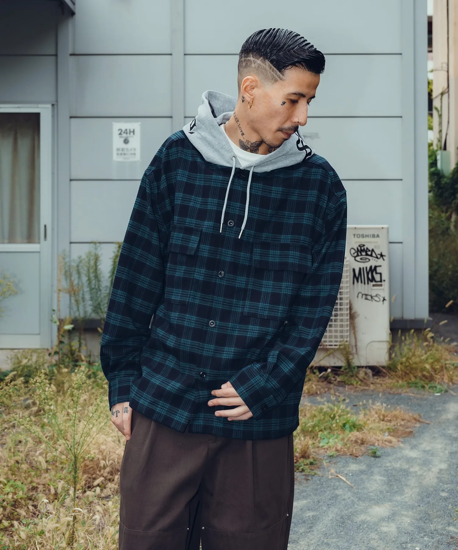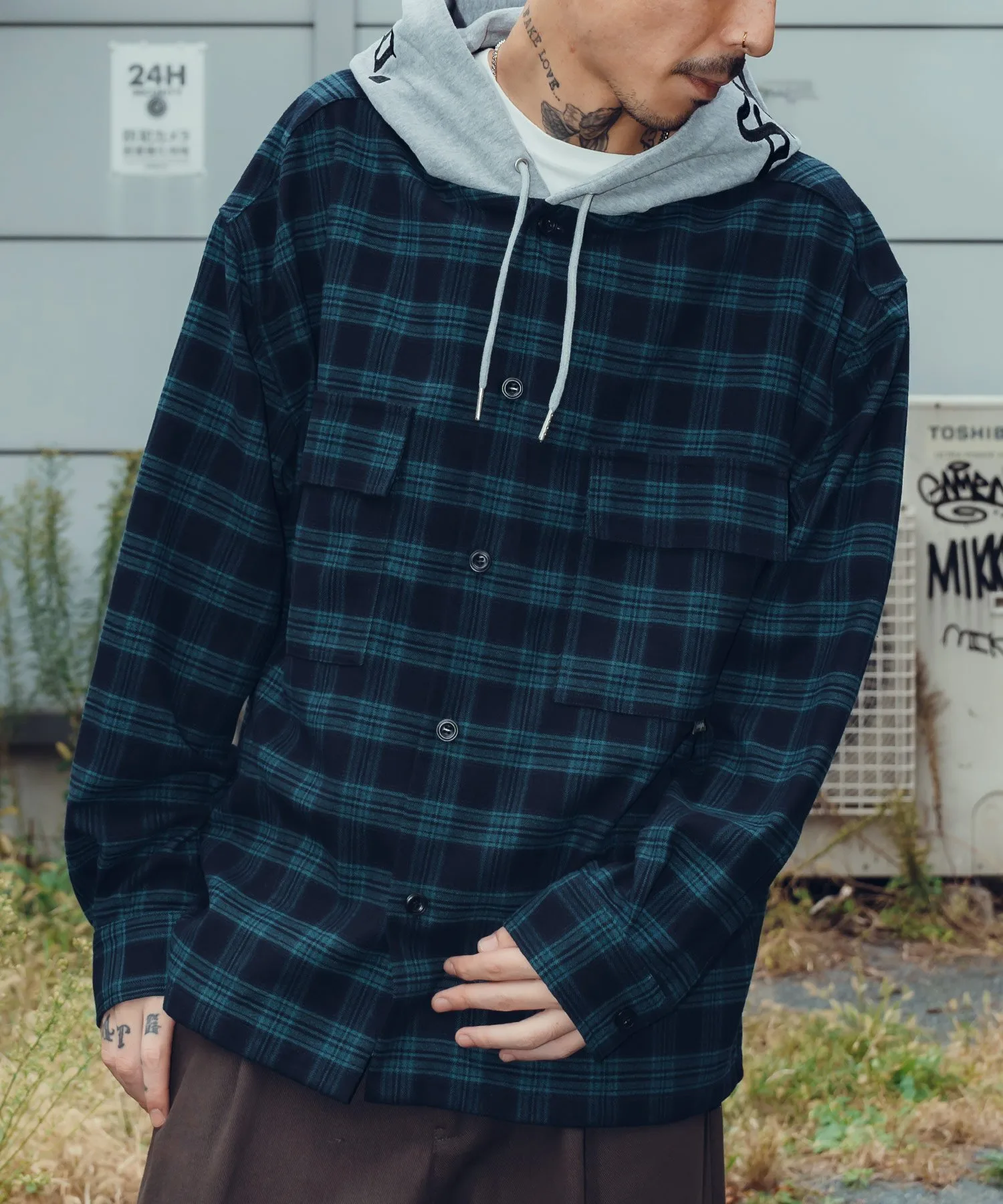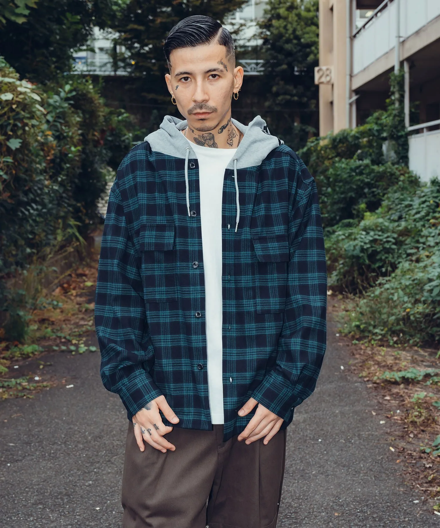 Клетчатая куртка с капюшоном, созданная по образцу военной формы.