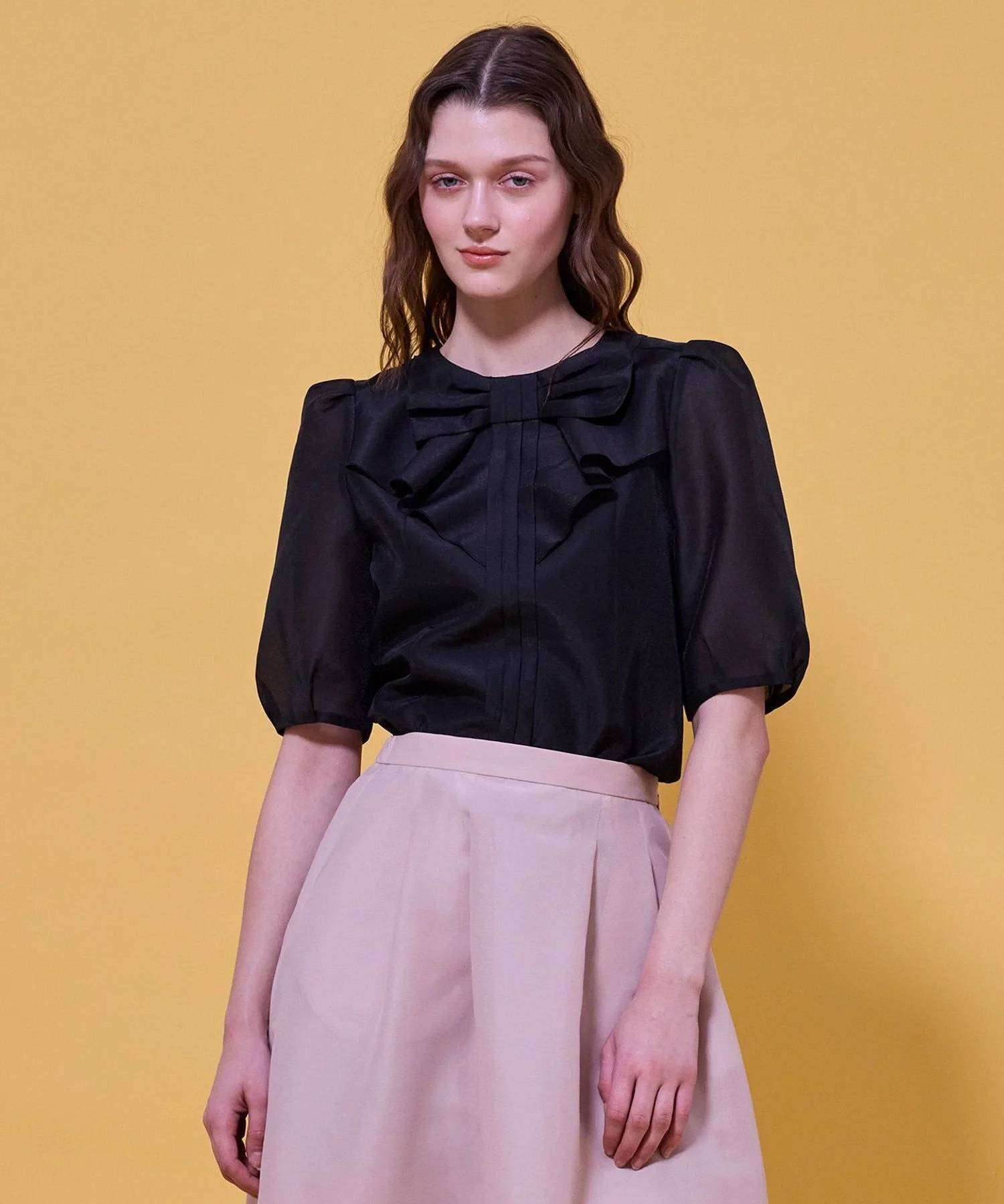Женственная и гламурная блузка с большой, привлекательной лентой. Изготовленная из плотной органзы, лента и передняя складка создают трехмерный эффект, придавая изделию элегантный вид.
