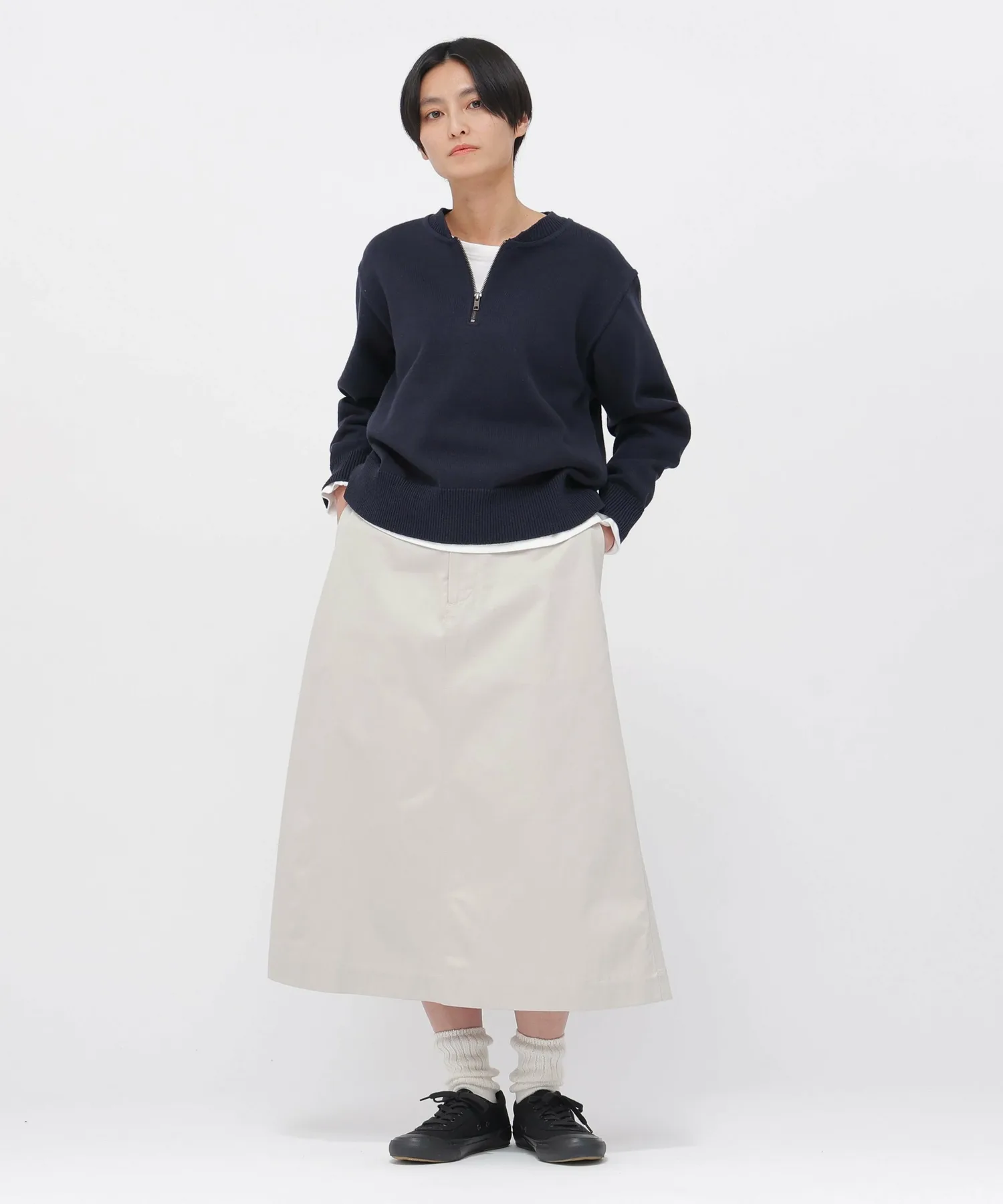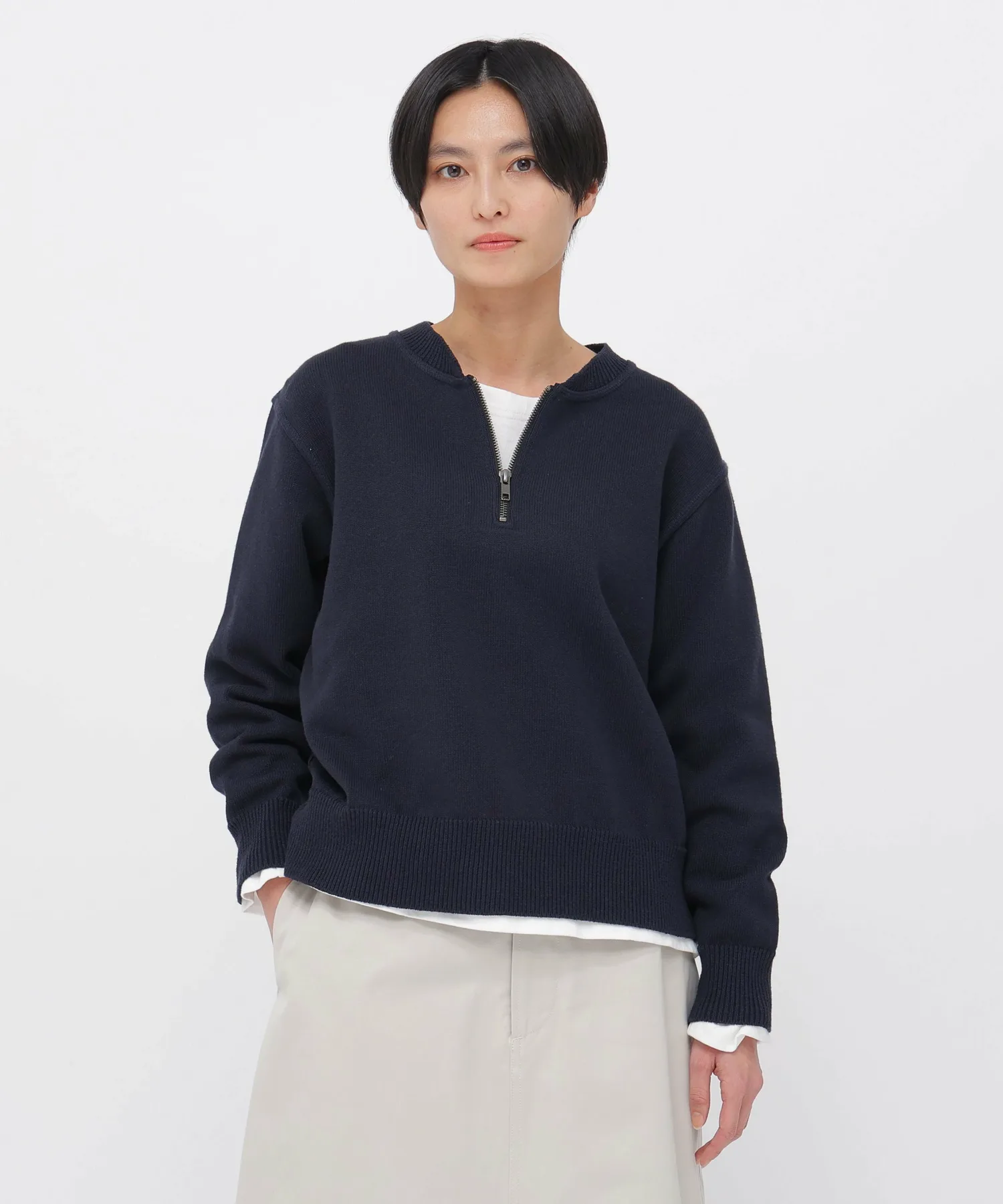 Используя особенности трикотажного полотна, эта модель имеет застежку-молнию до середины груди, как у толстовки. Детали включают в себя закругленный ребристый воротник и декоративную строчку.