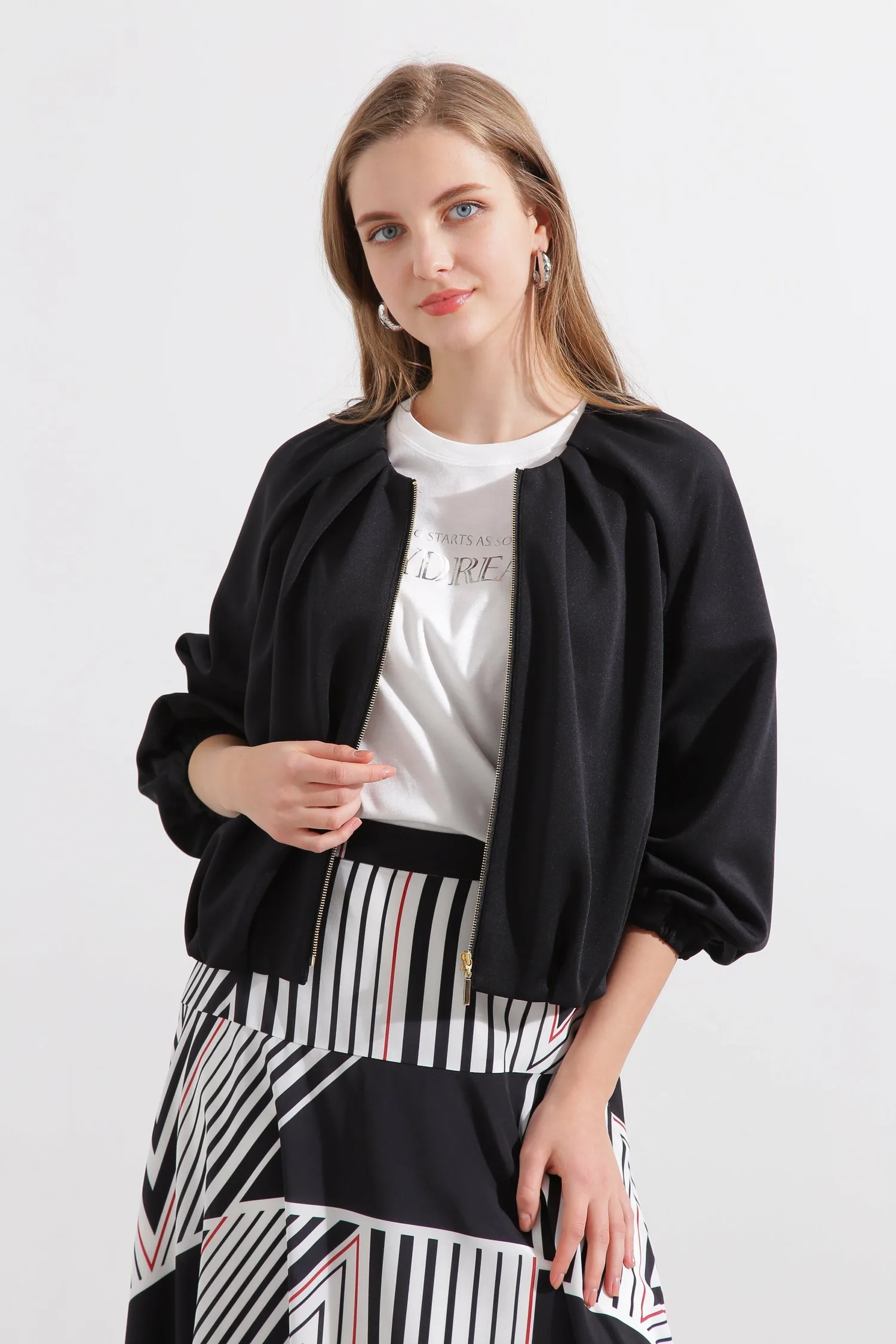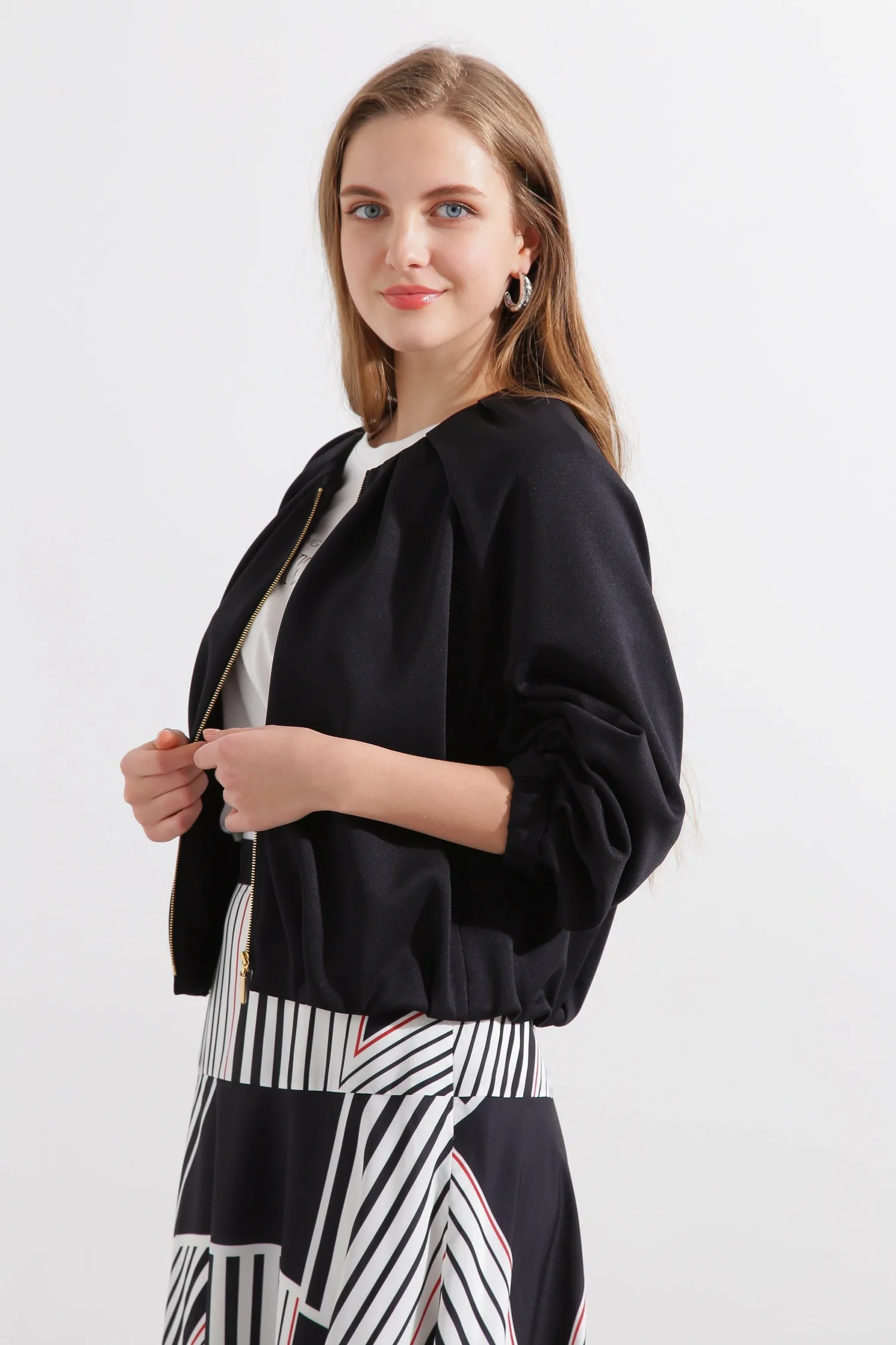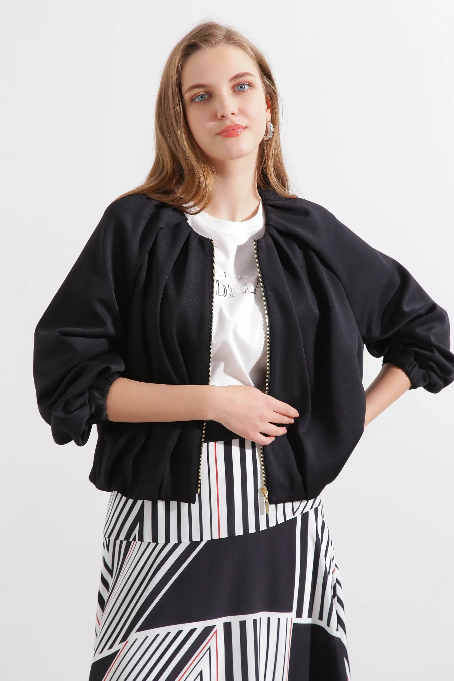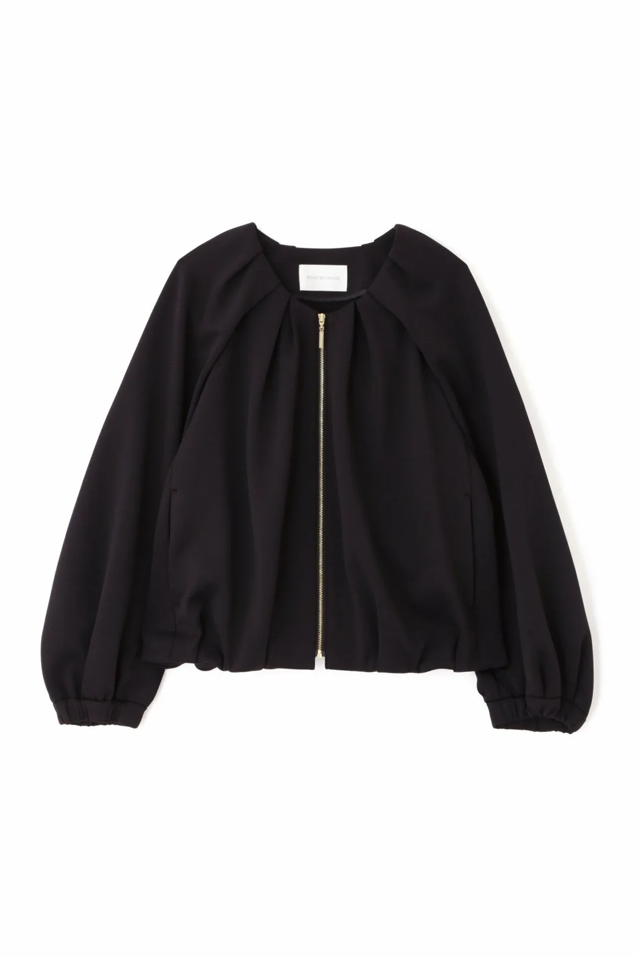 Эта блузон имеет слегка свободный крой и мягкую пышность, создаваемую складками на рукавах. Передняя молния добавляет акцент, а эластичные манжеты и нижний край создают непринужденный и игривый образ. Простой воротник подчеркивает современную красоту этой изысканной вещи.