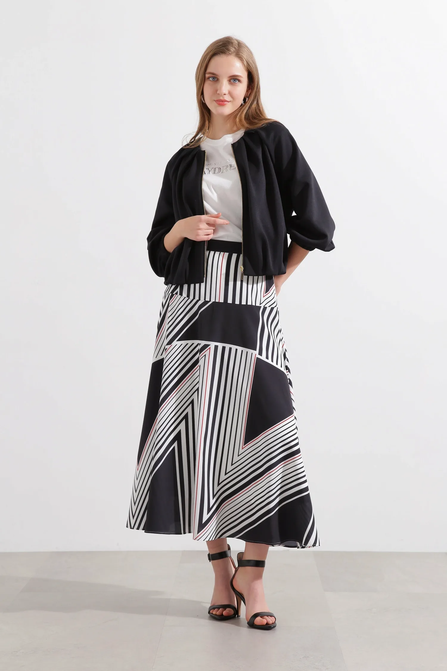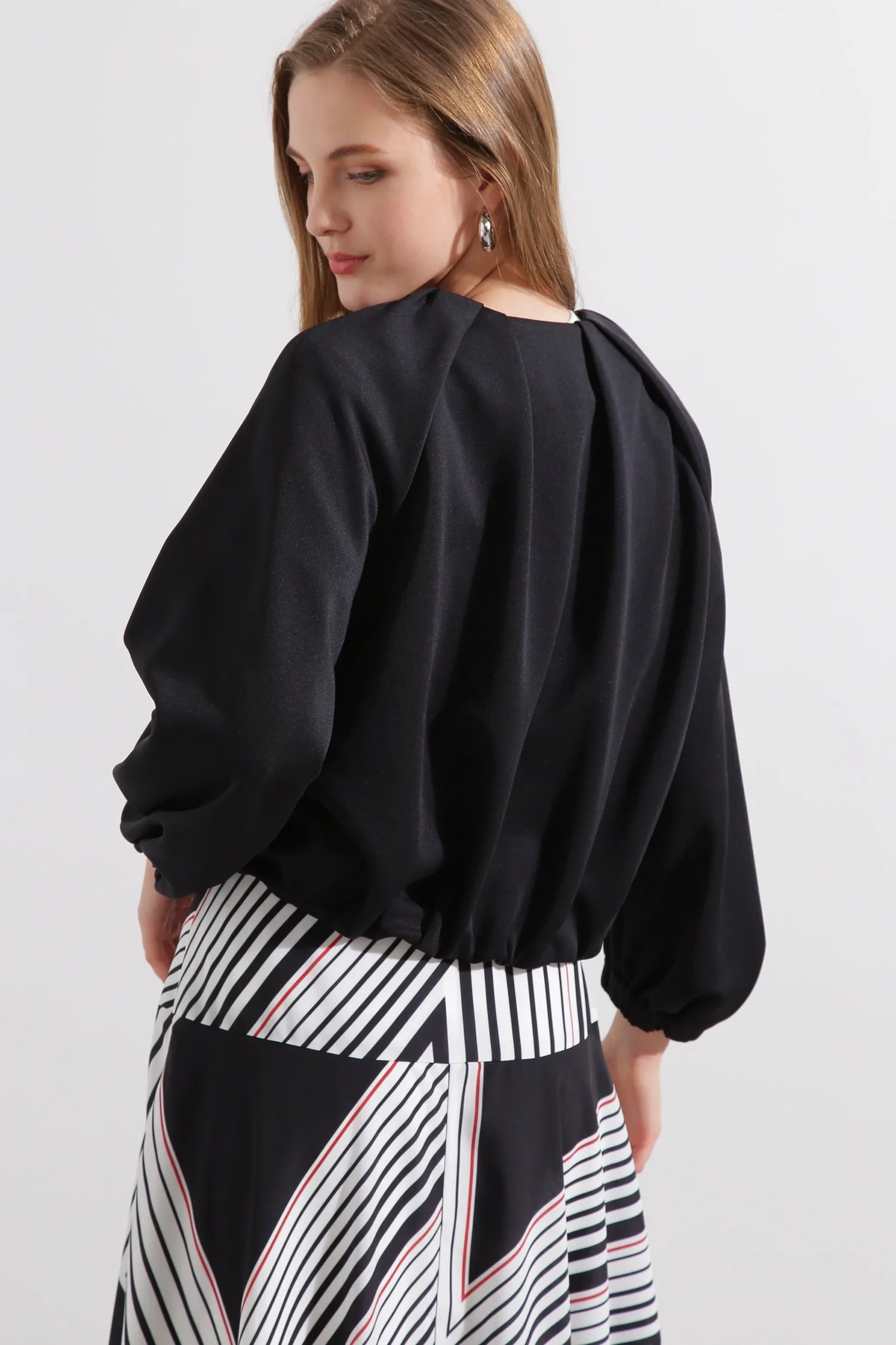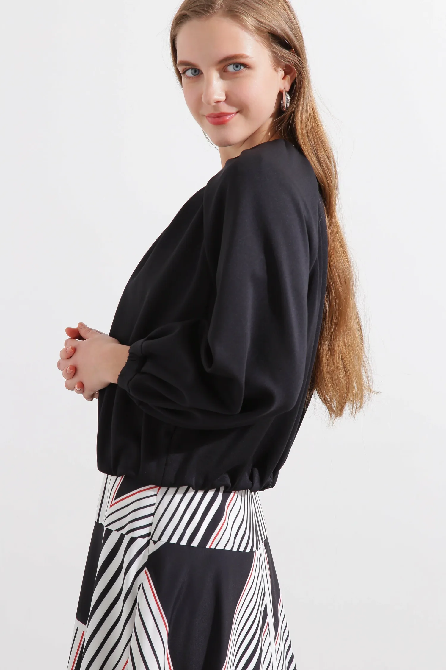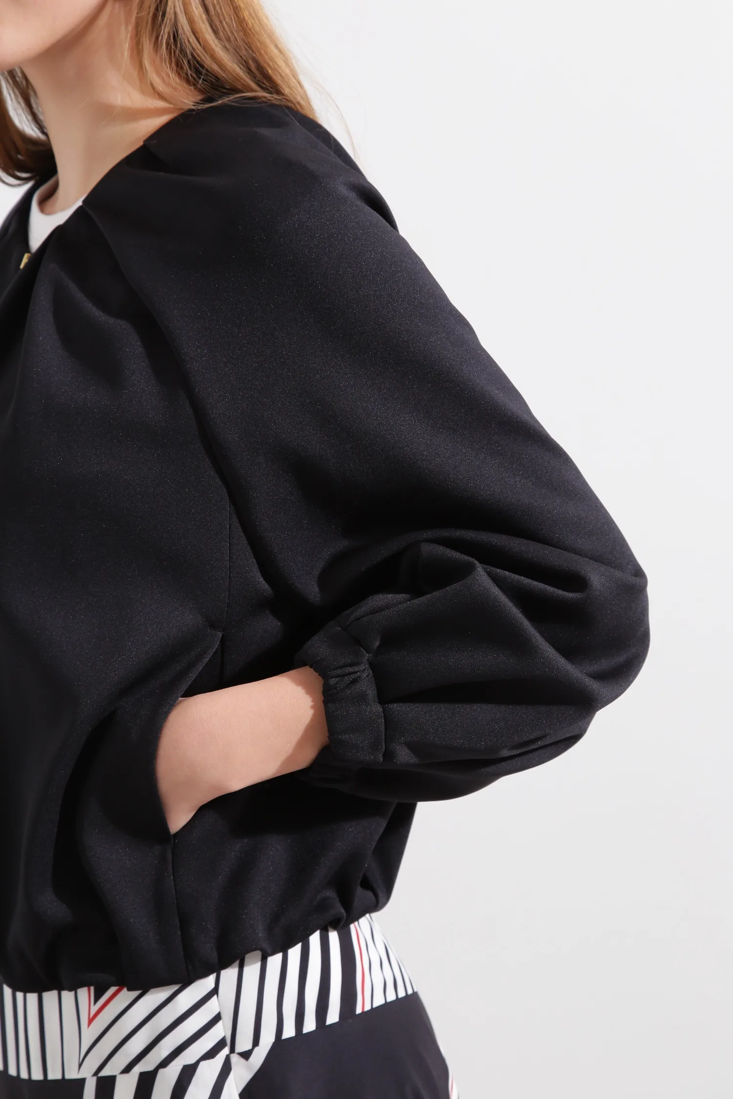 Эта блузон имеет слегка свободный крой и мягкую пышность, создаваемую складками на рукавах. Передняя молния добавляет акцент, а эластичные манжеты и нижний край создают непринужденный и игривый образ. Простой воротник подчеркивает современную красоту этой изысканной вещи.