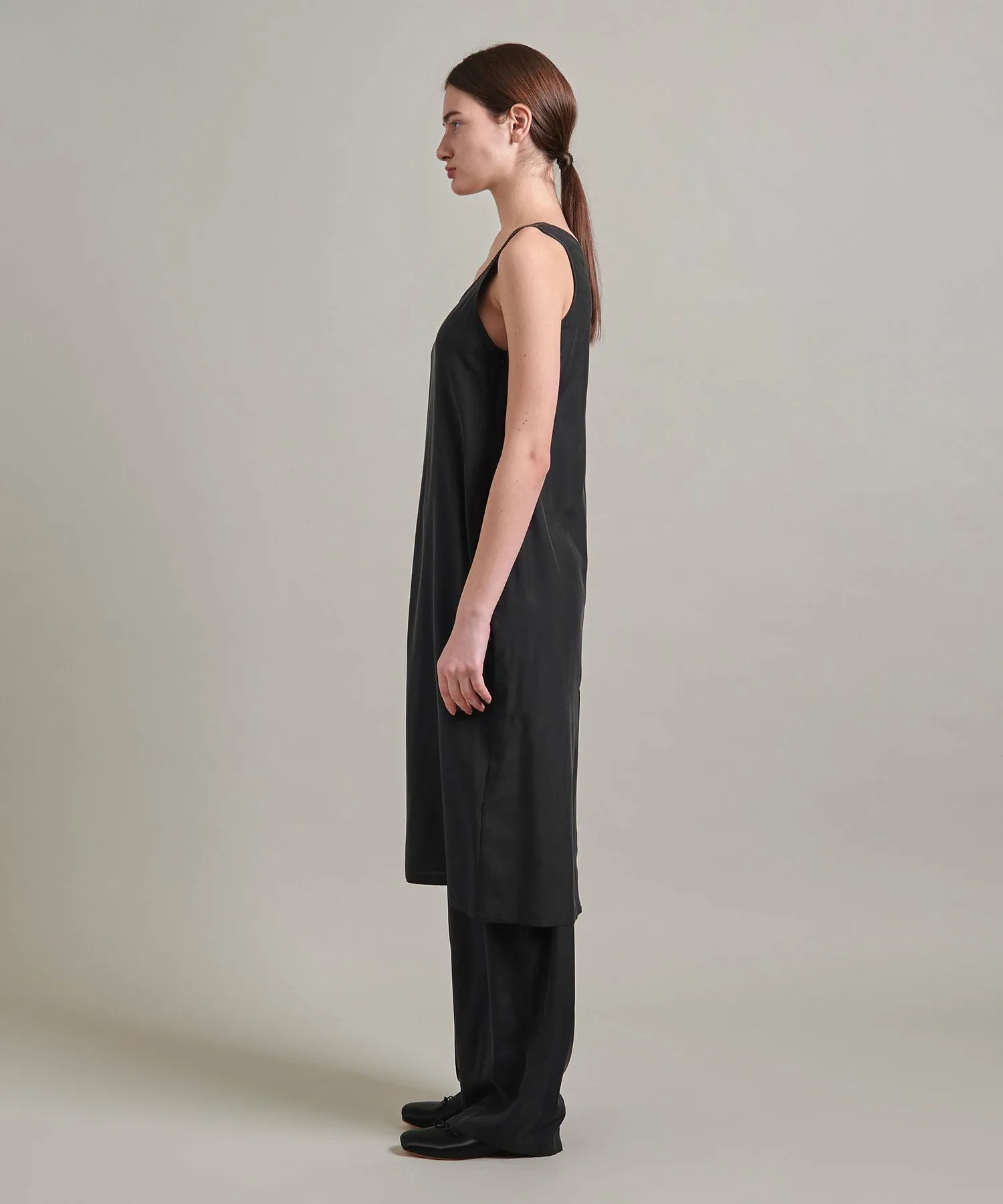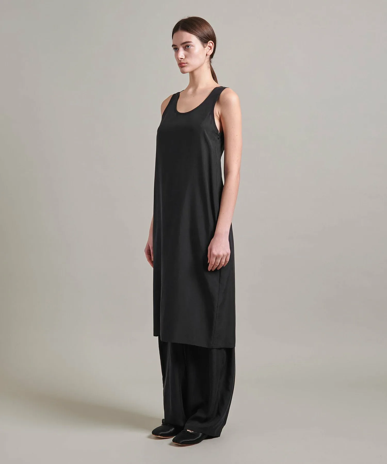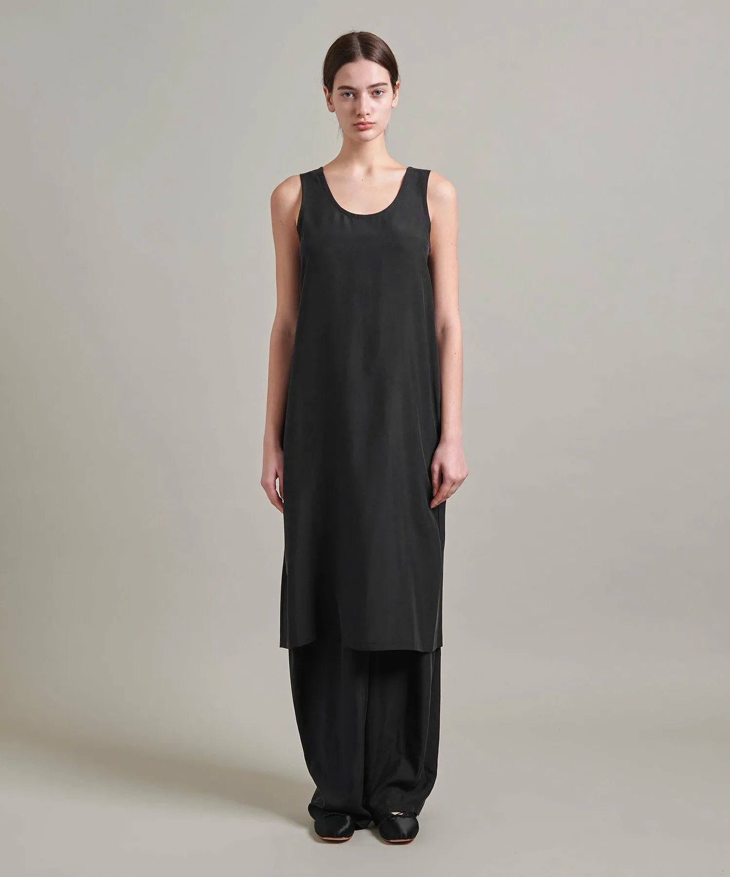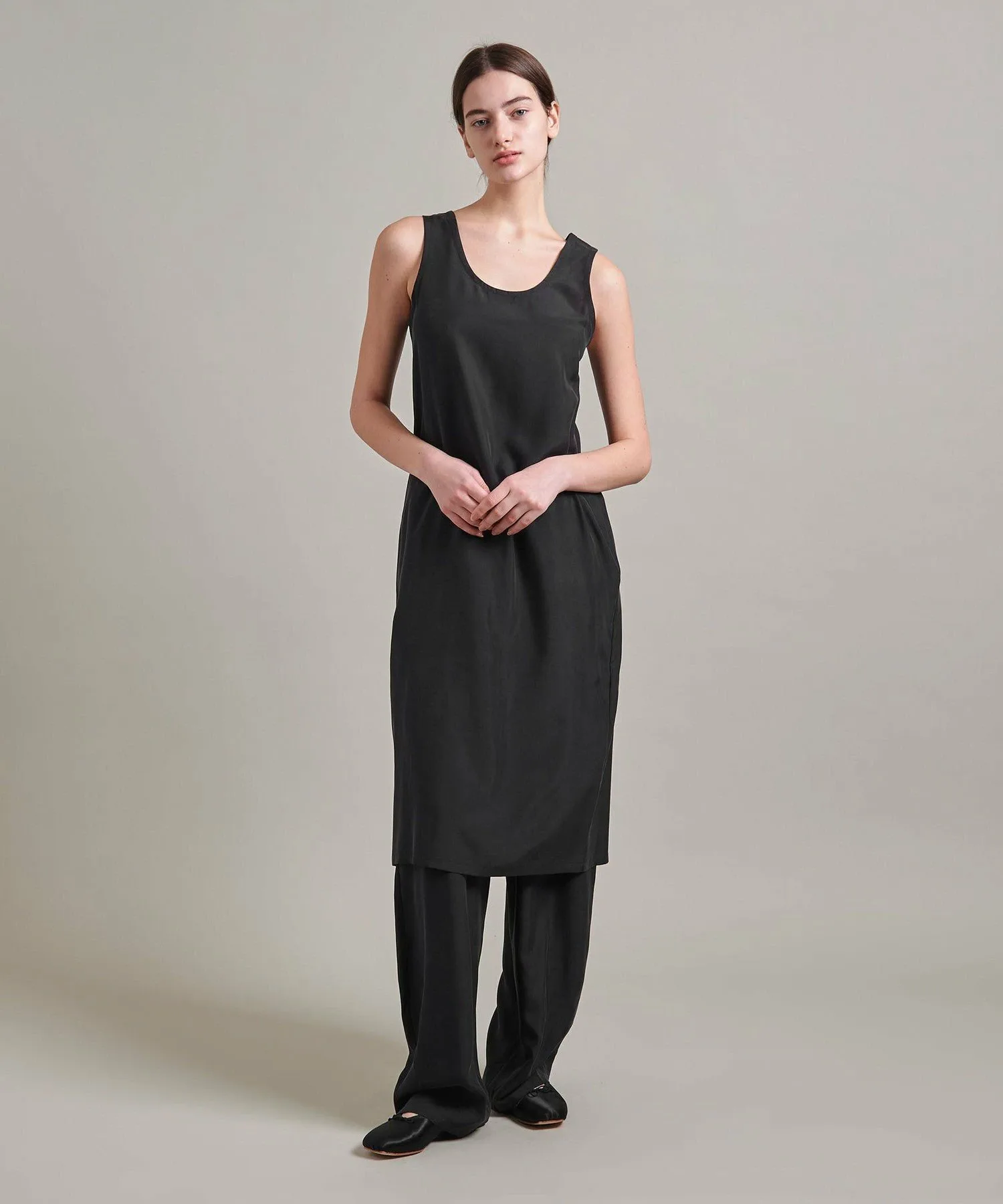 Это платье-майка имеет облегающий силуэт и рекомендуется носить в сочетании с брюками из того же материала.