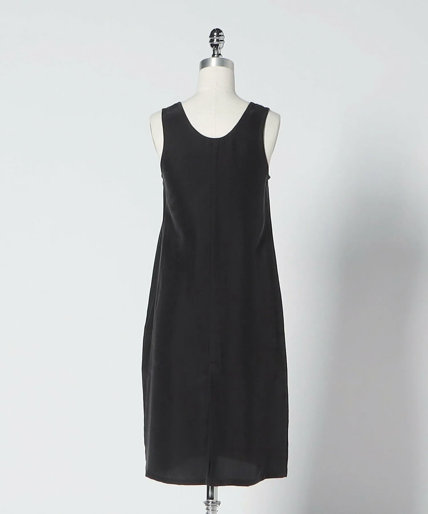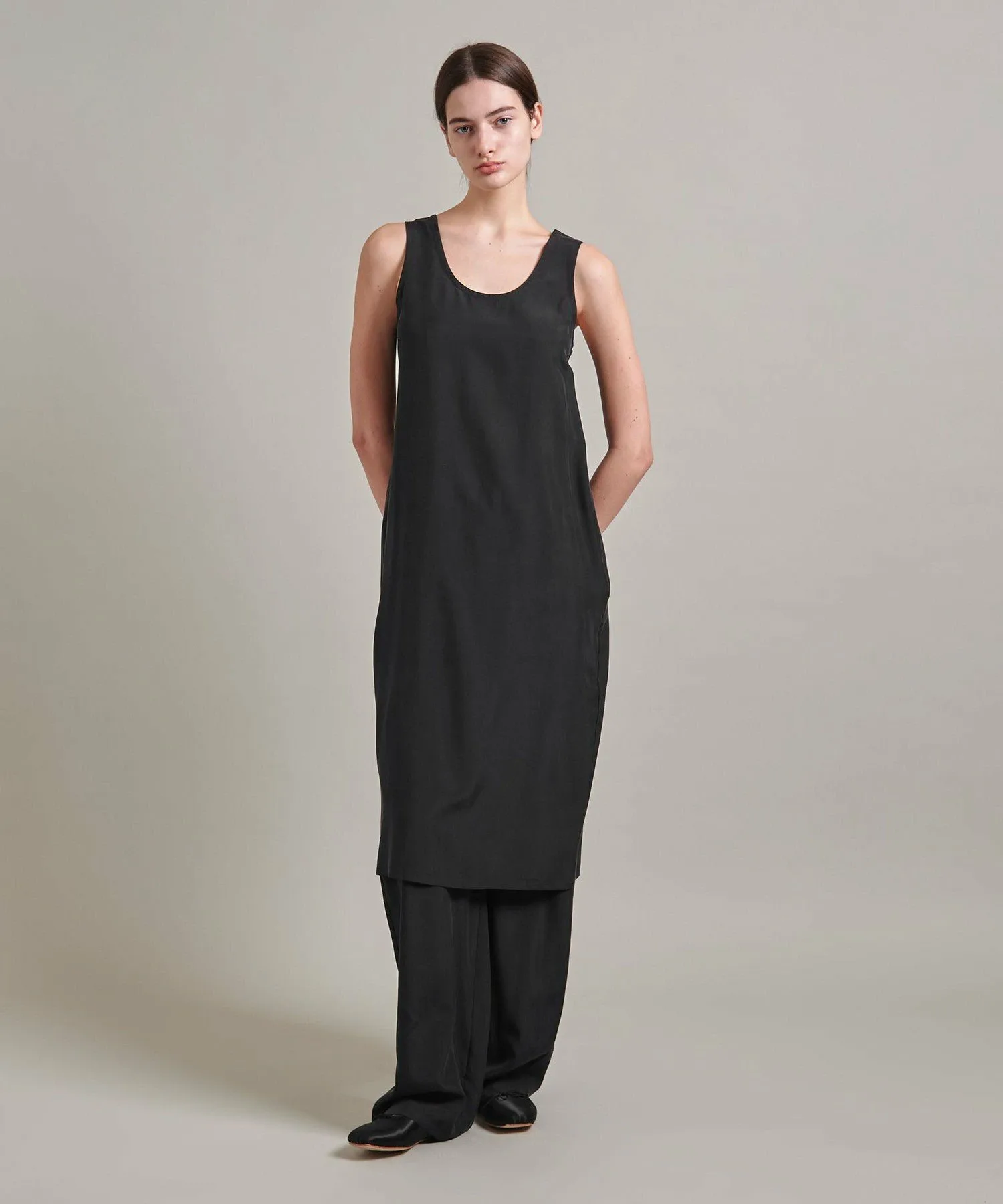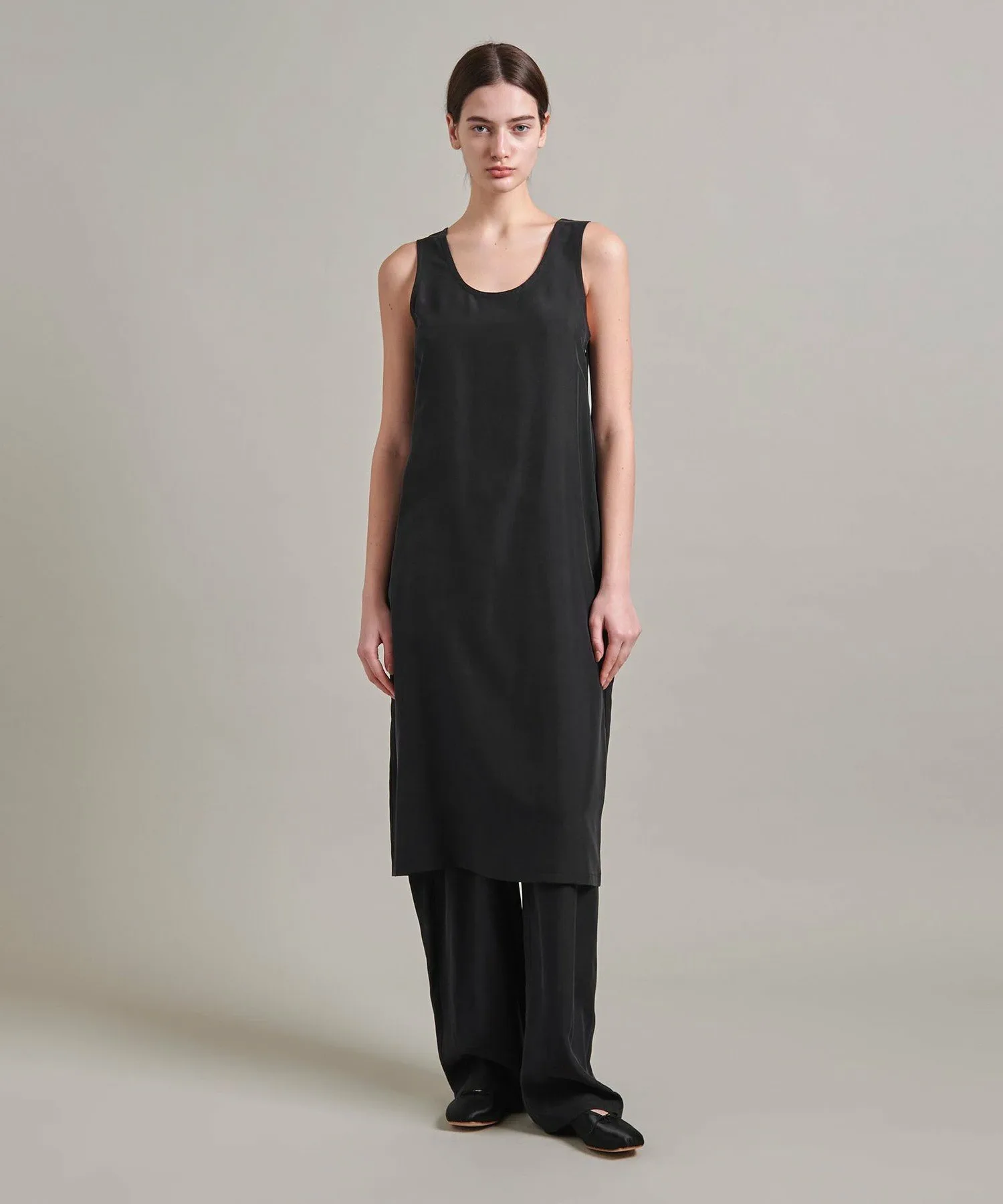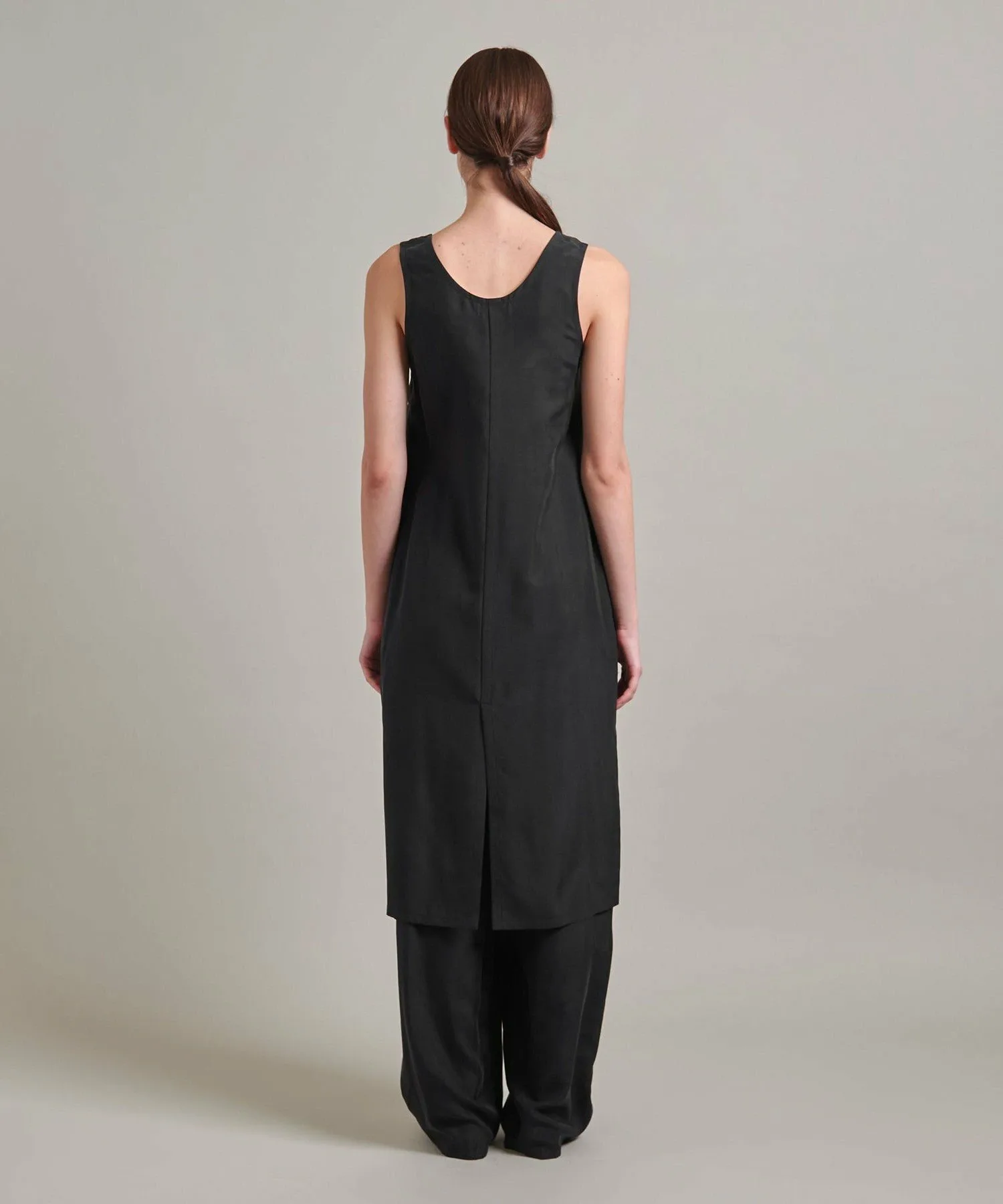 Это платье-майка имеет облегающий силуэт и рекомендуется носить в сочетании с брюками из того же материала.