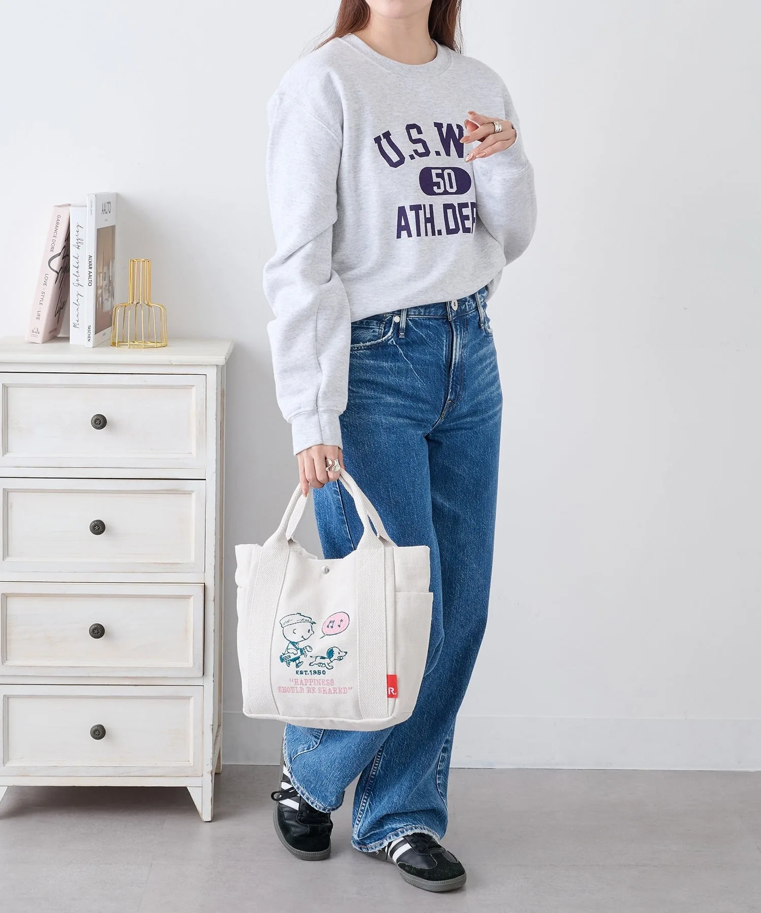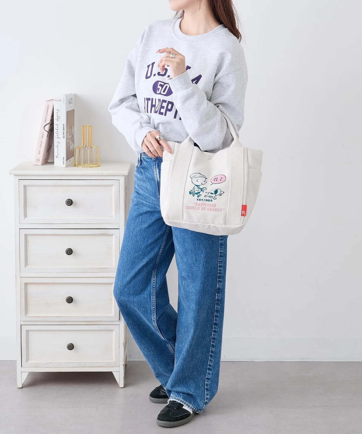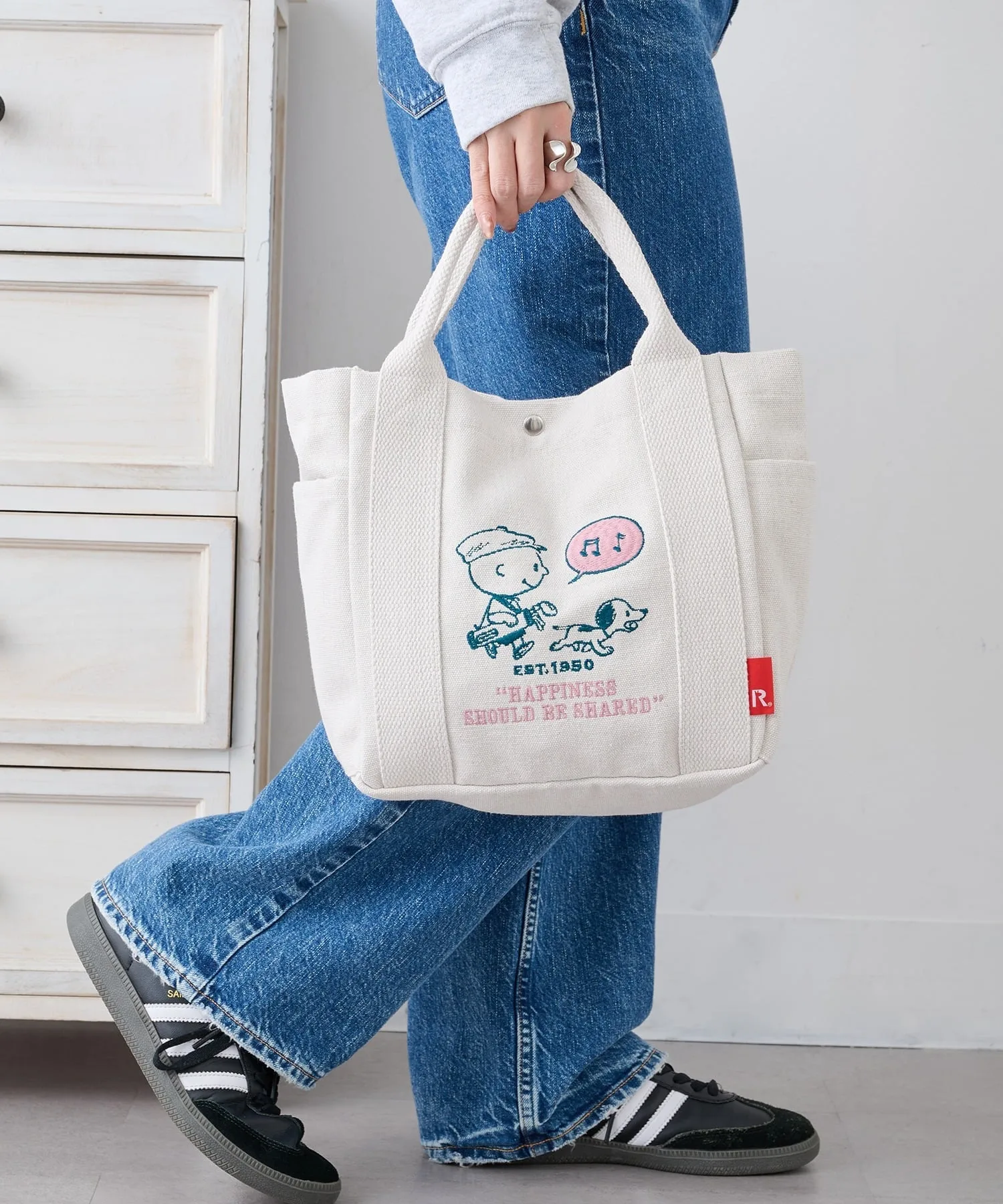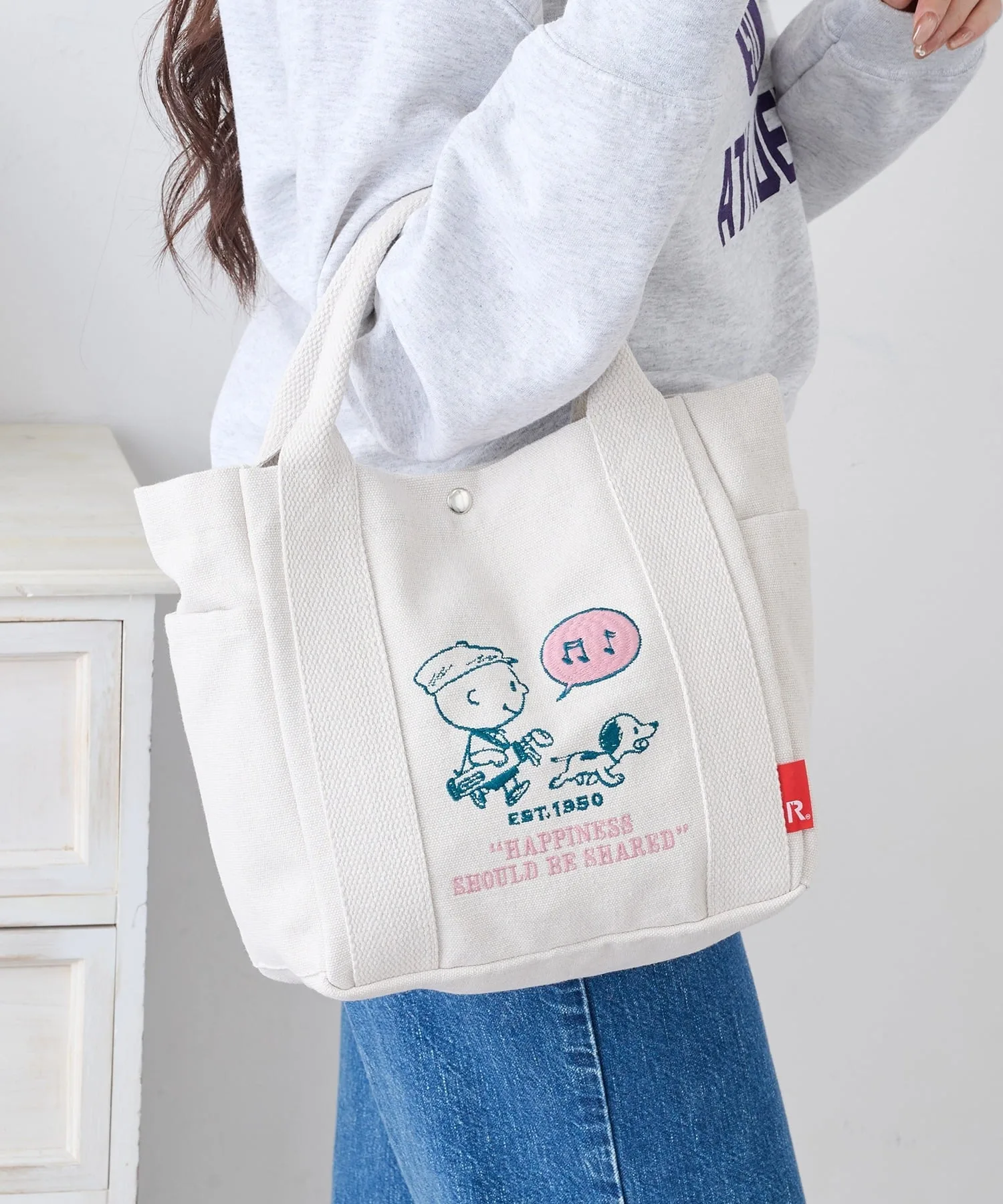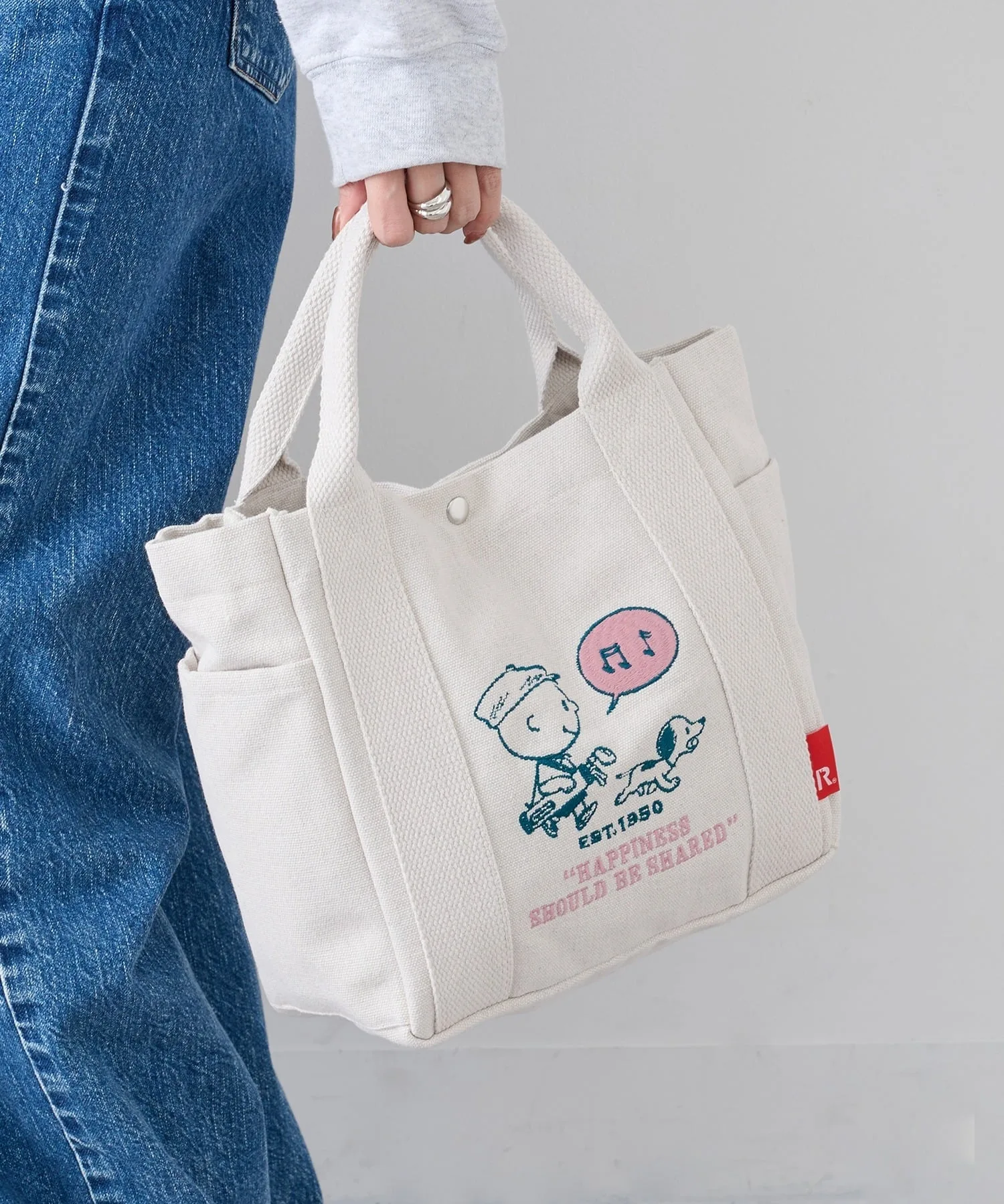 Сочетайте・Иллюстрация на сумке добавляет игривости повседневному стилю, сочетающему простую футболку и джинсы. ・Сочетайте с льняным платьем или длинной юбкой для естественного, нежного образа. ・Сочетайте с повседневной одеждой, такой как толстовки и худи, для милого образа для прогулки на одну милю. ・Сочетайте с элегантной рубашкой и чиносами для повседневного, смешанного стиля с рисунками персонажей.