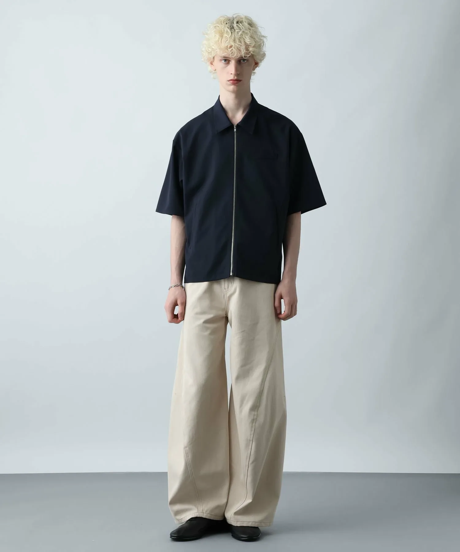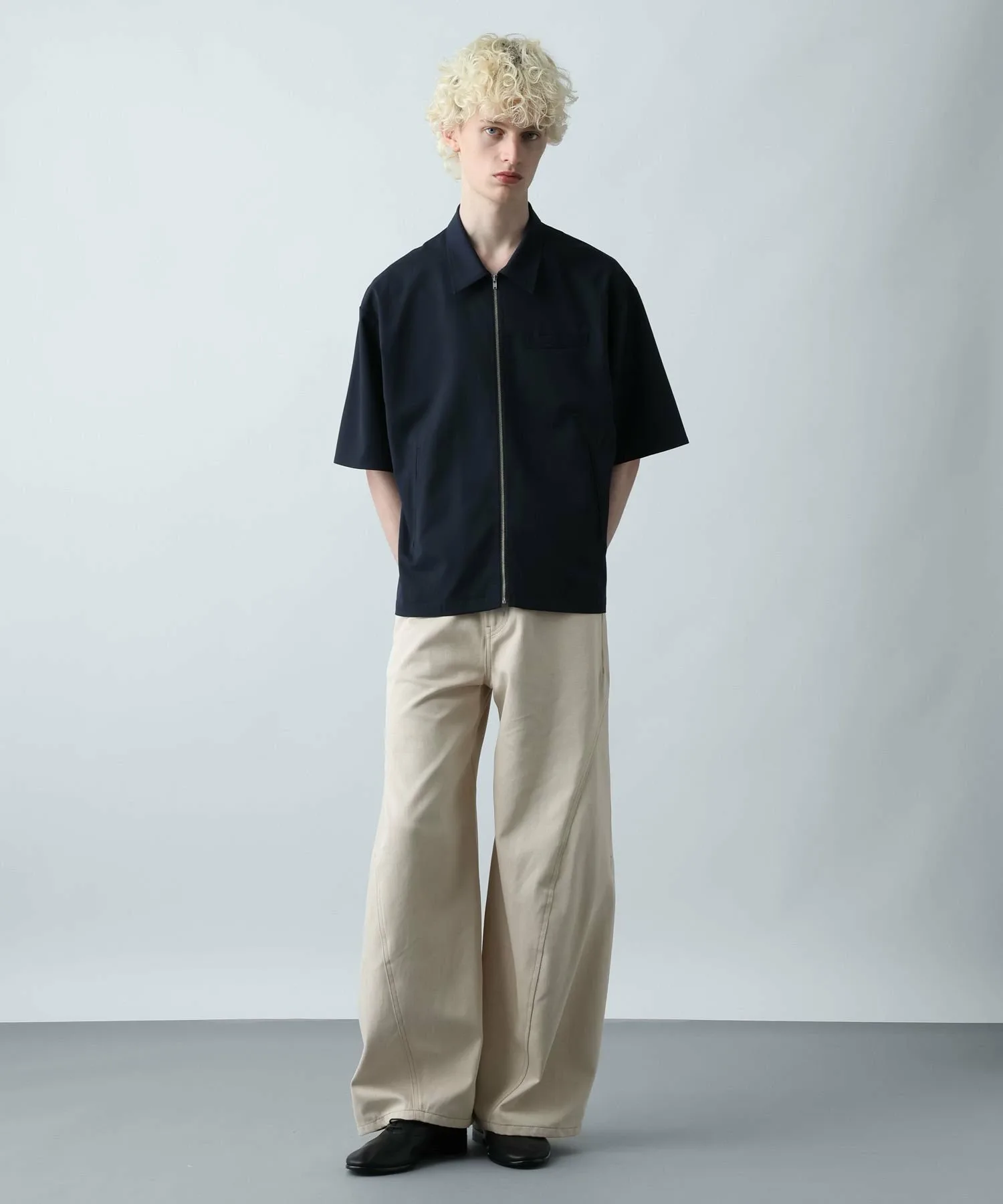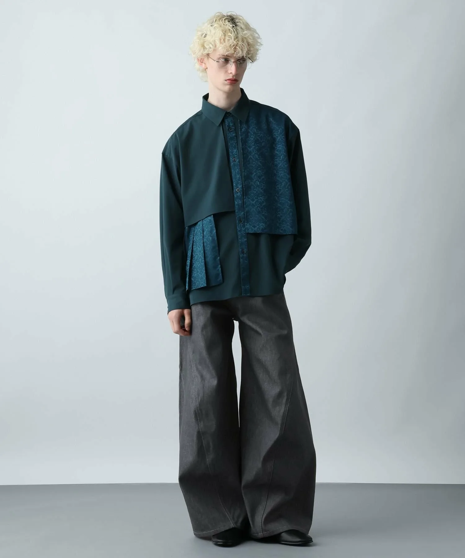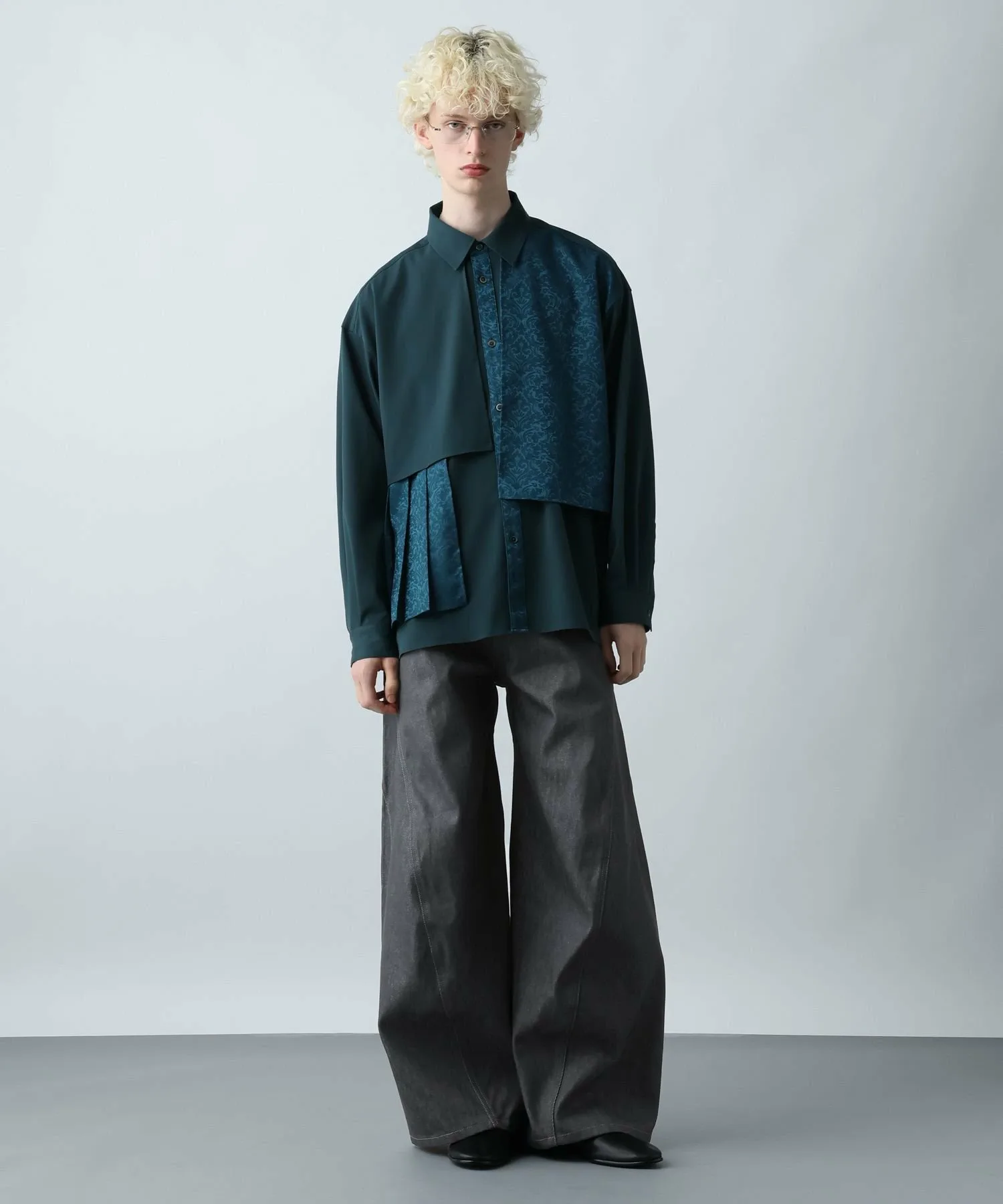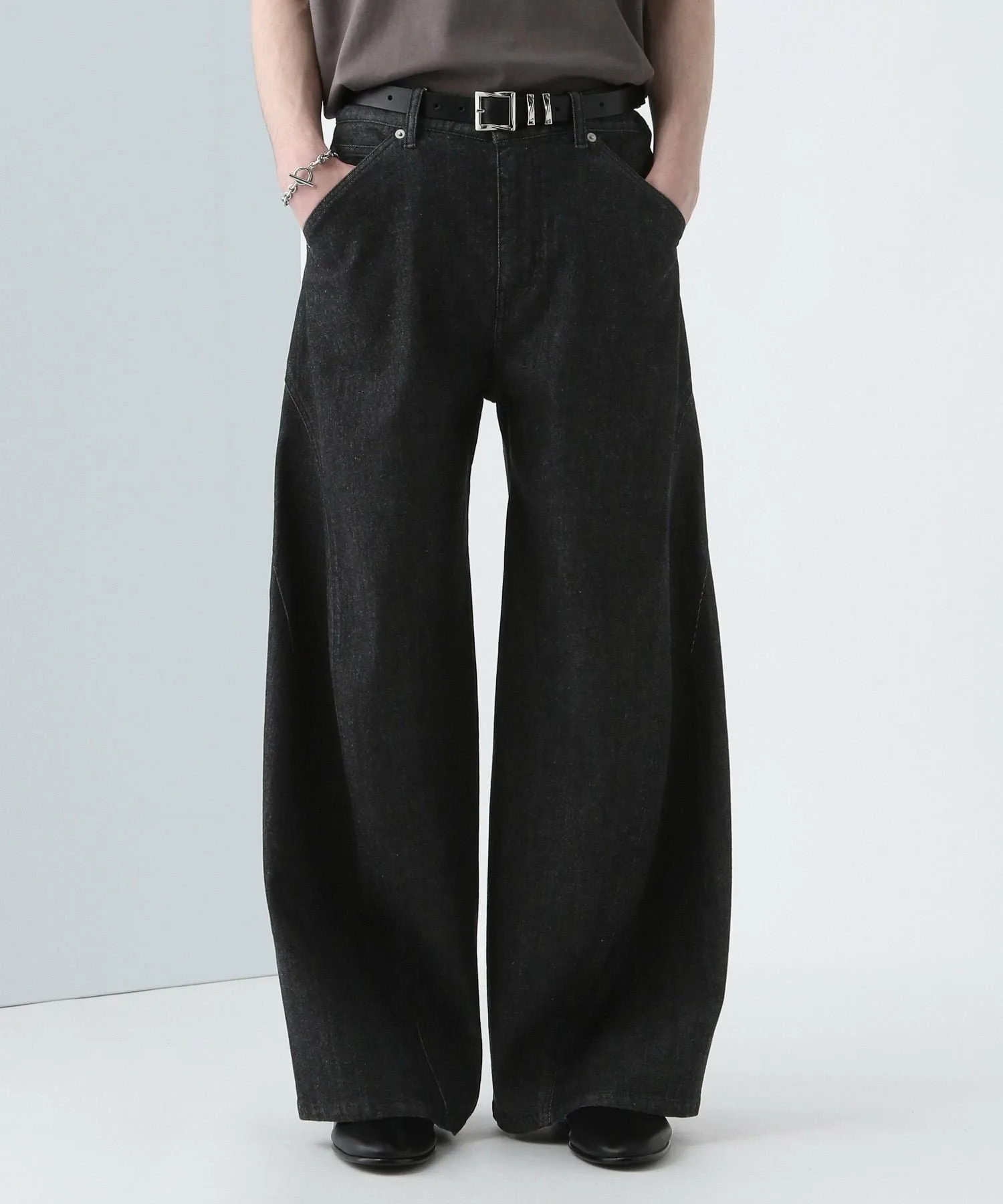 Трехмерный, широкий силуэт изгибается от колена, создавая уникальный, деформированный силуэт, который выделяется среди других джинсовых брюк и позволяет выразить вашу индивидуальность.