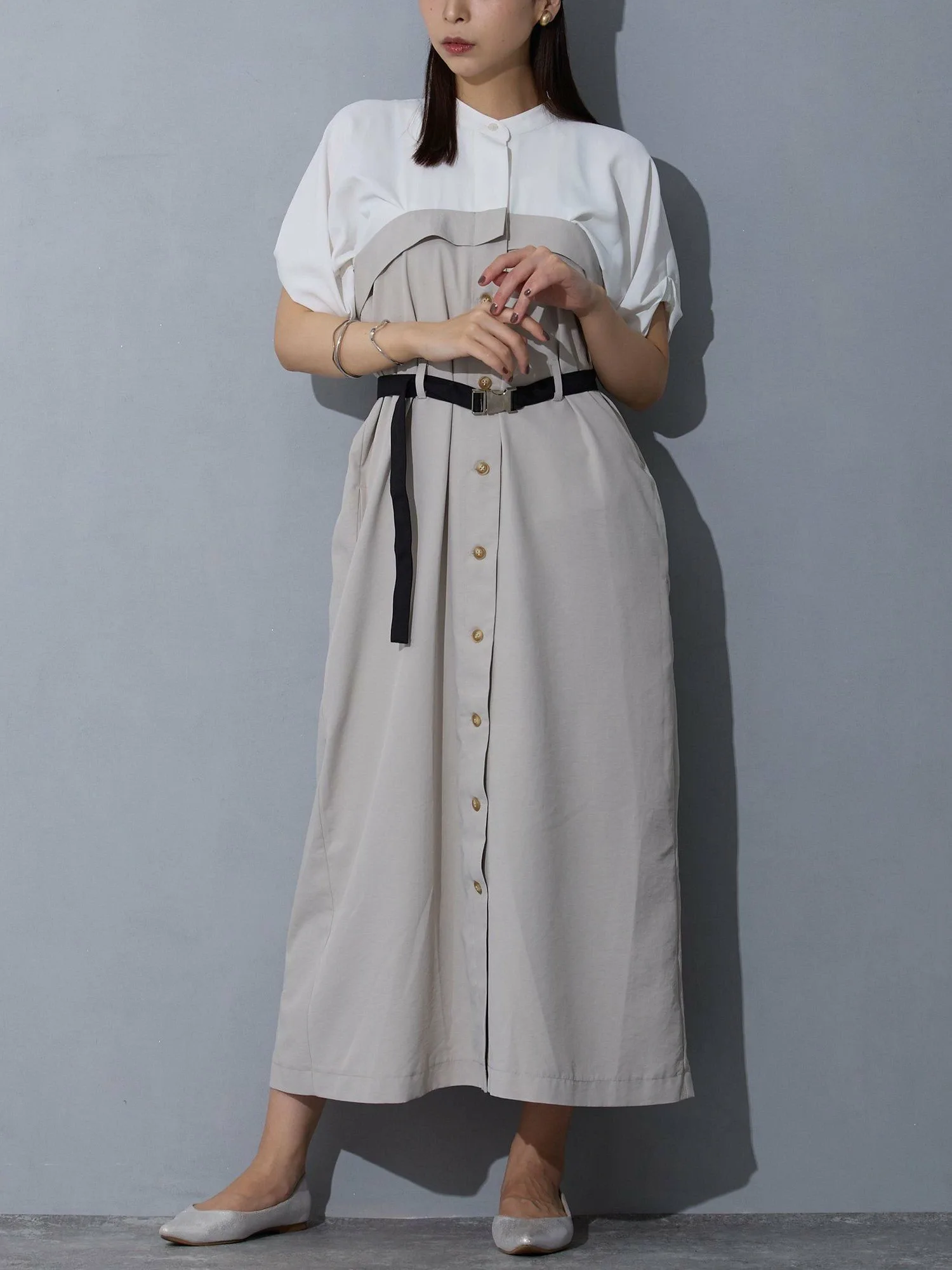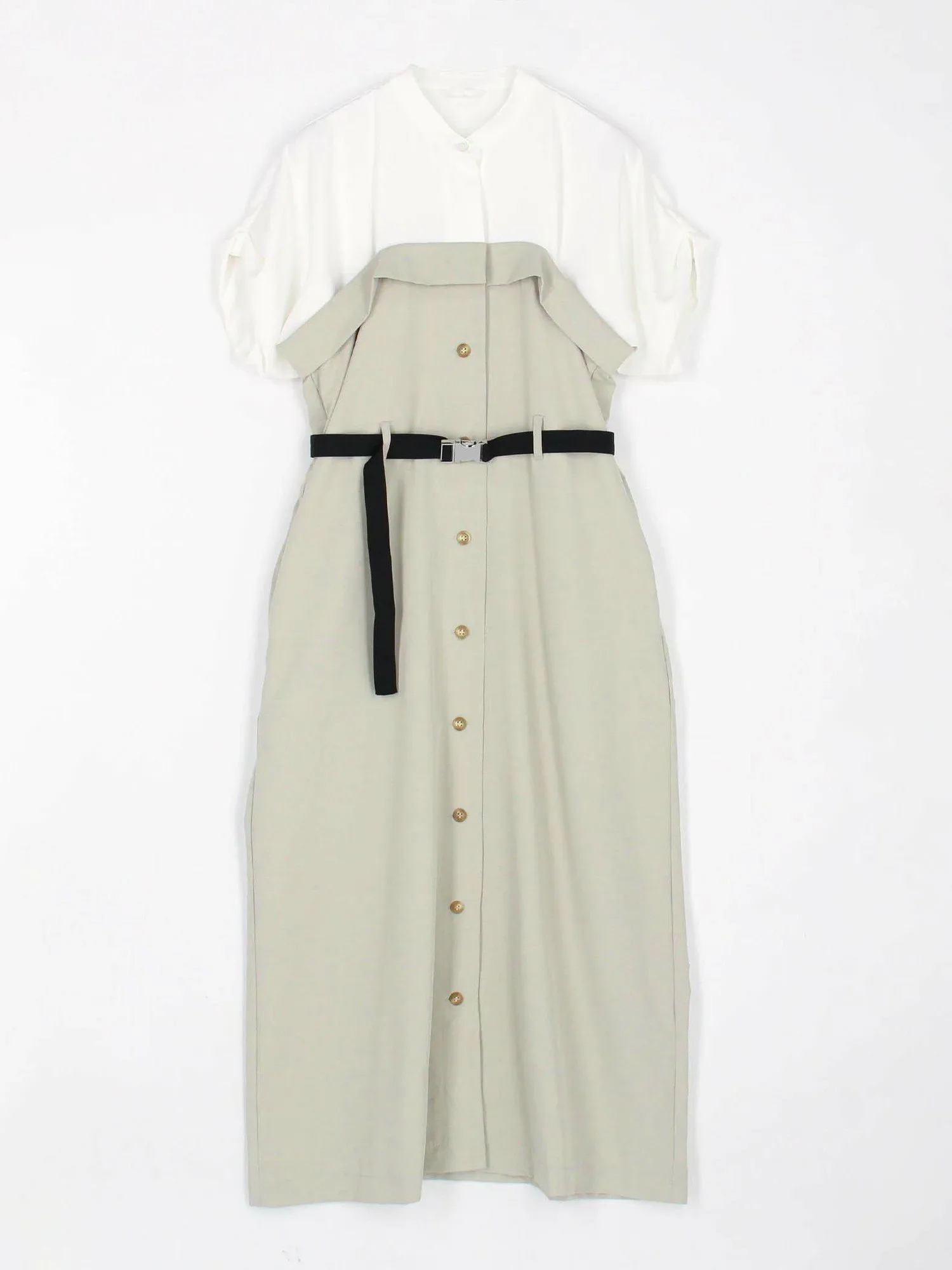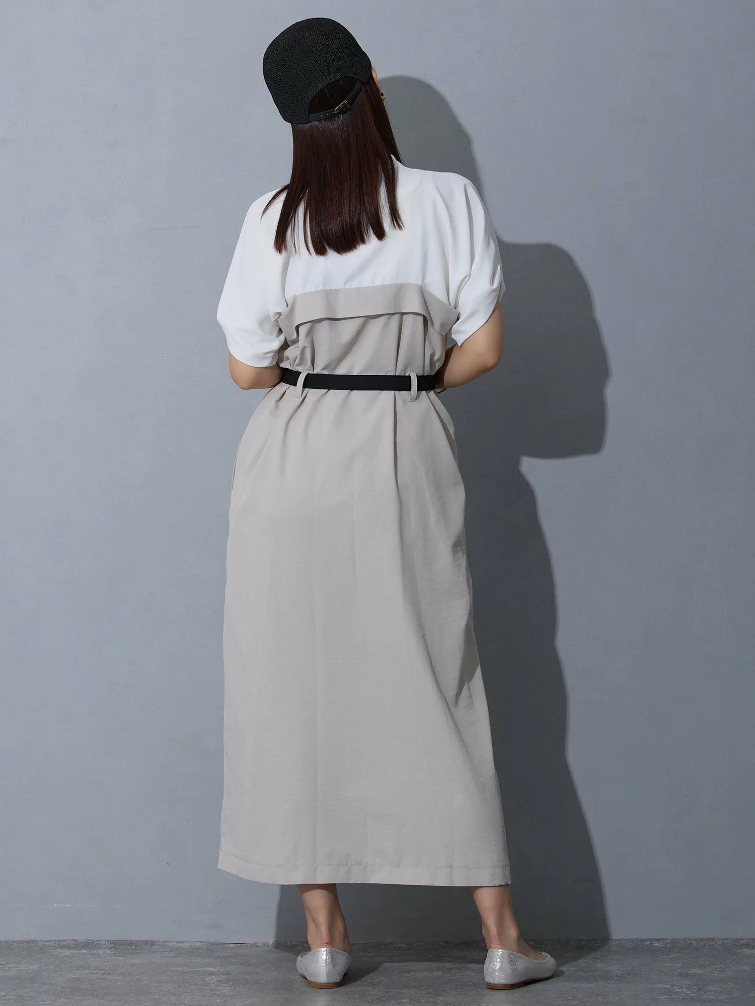 Это многослойное платье-докинг — удобная вещь, которую можно носить и без него. Пояс на талии делает образ более стройным.
