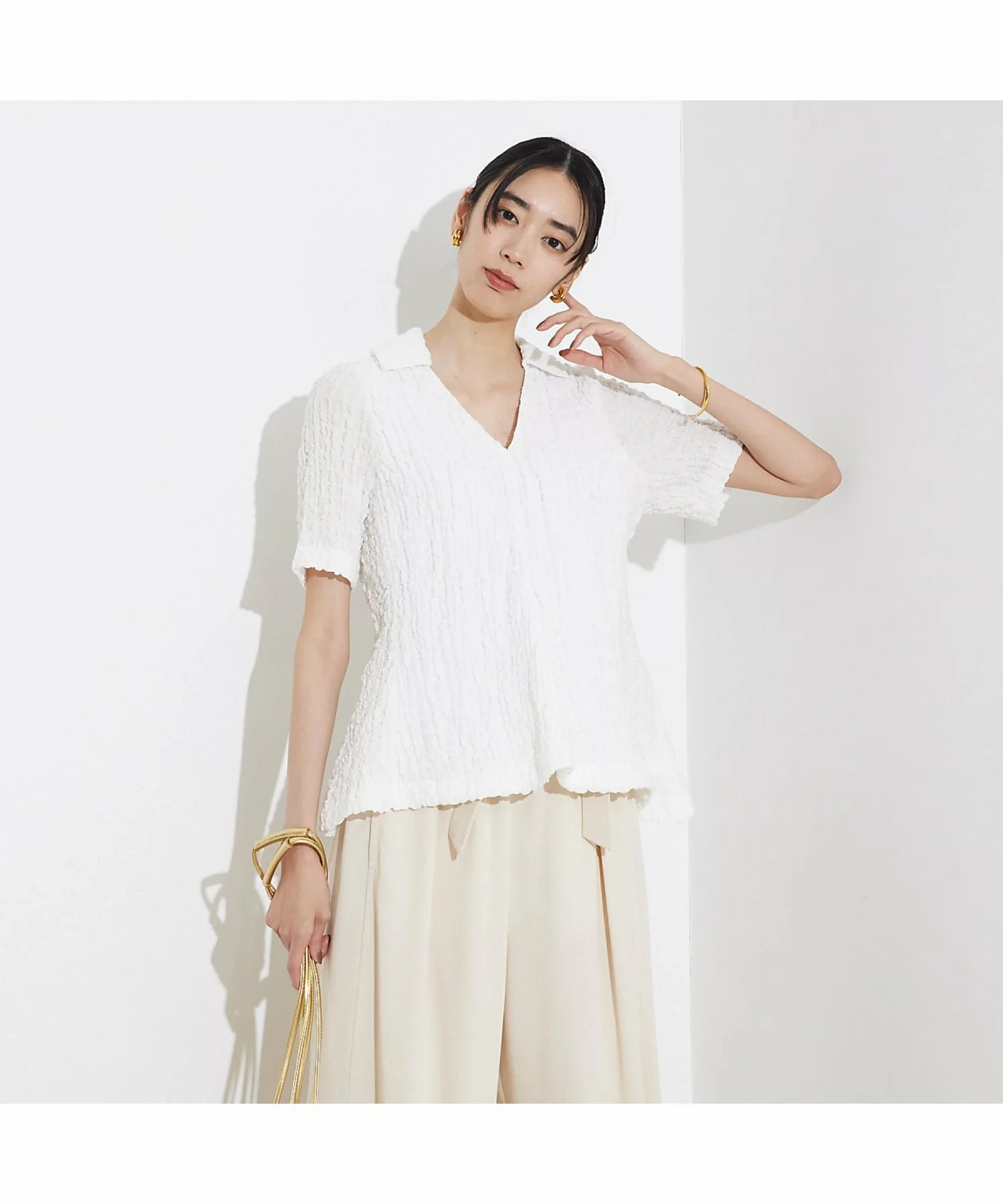 V-образный вырез и компактный воротник создают аккуратный силуэт.