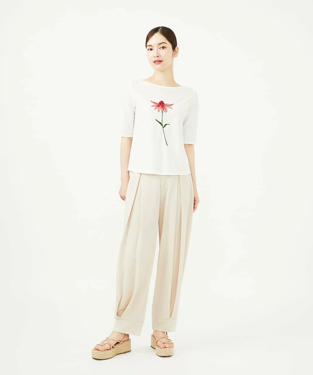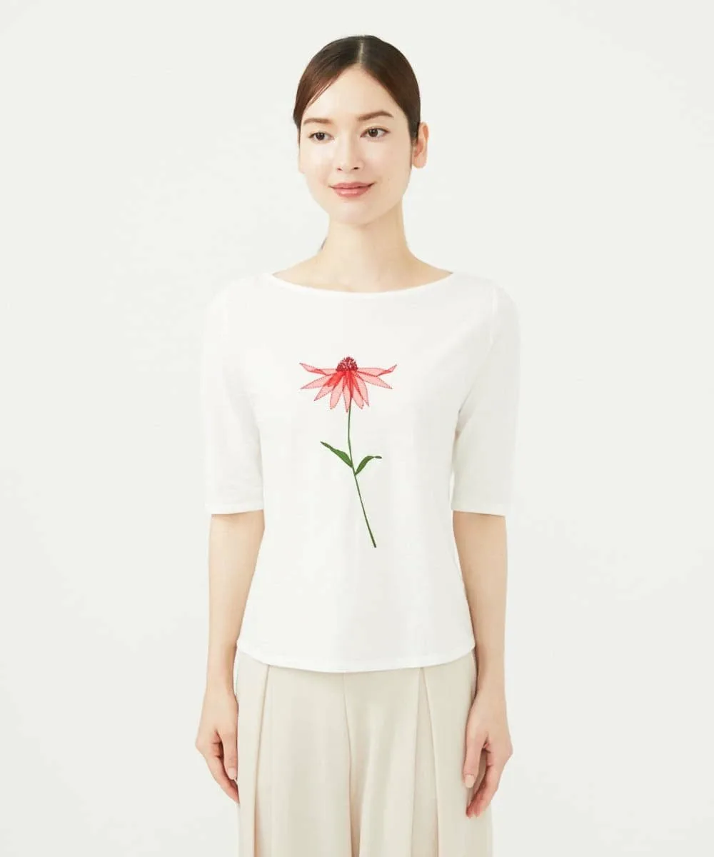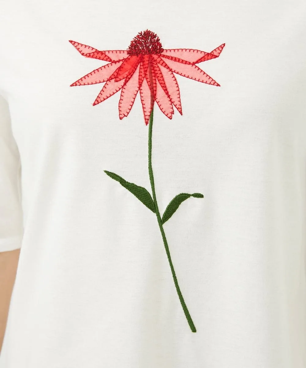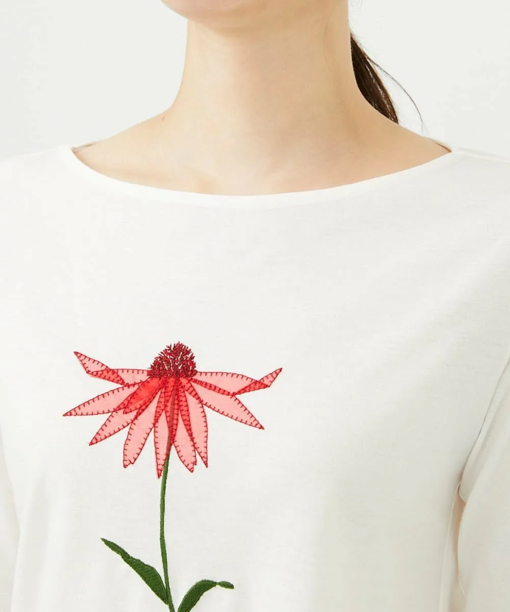 Топ, сшитый по индивидуальному заказу, украшен аппликацией в виде одного нежного цветка эхинацеи.