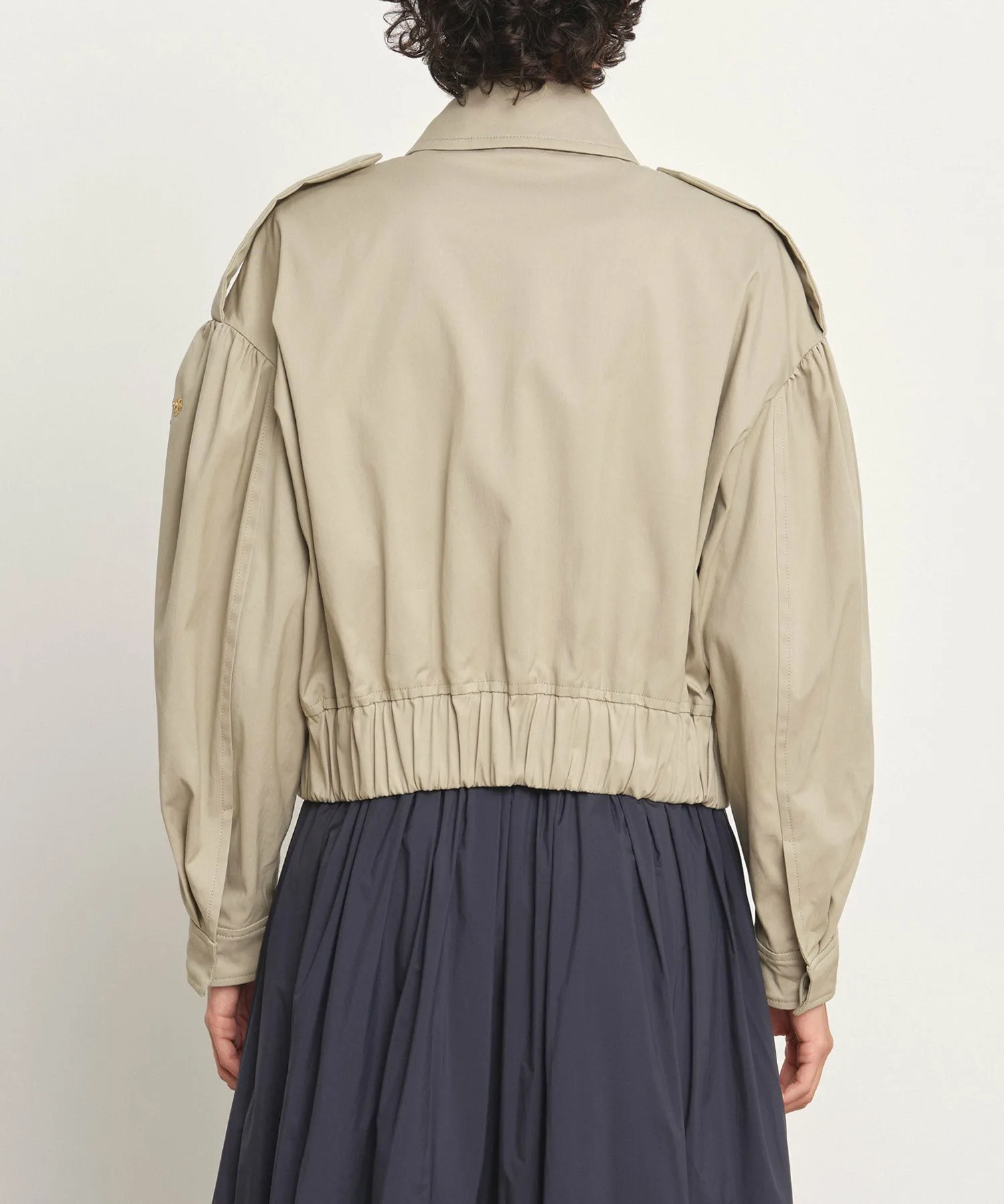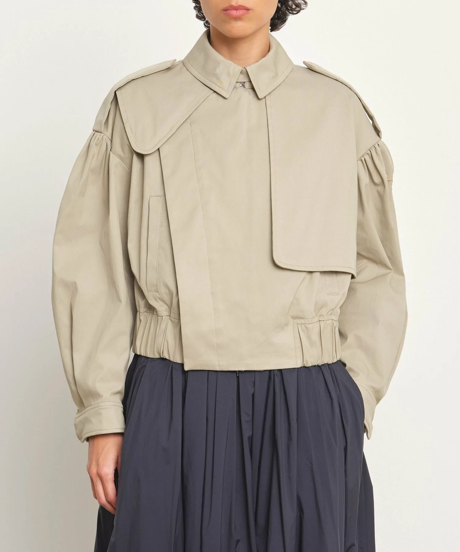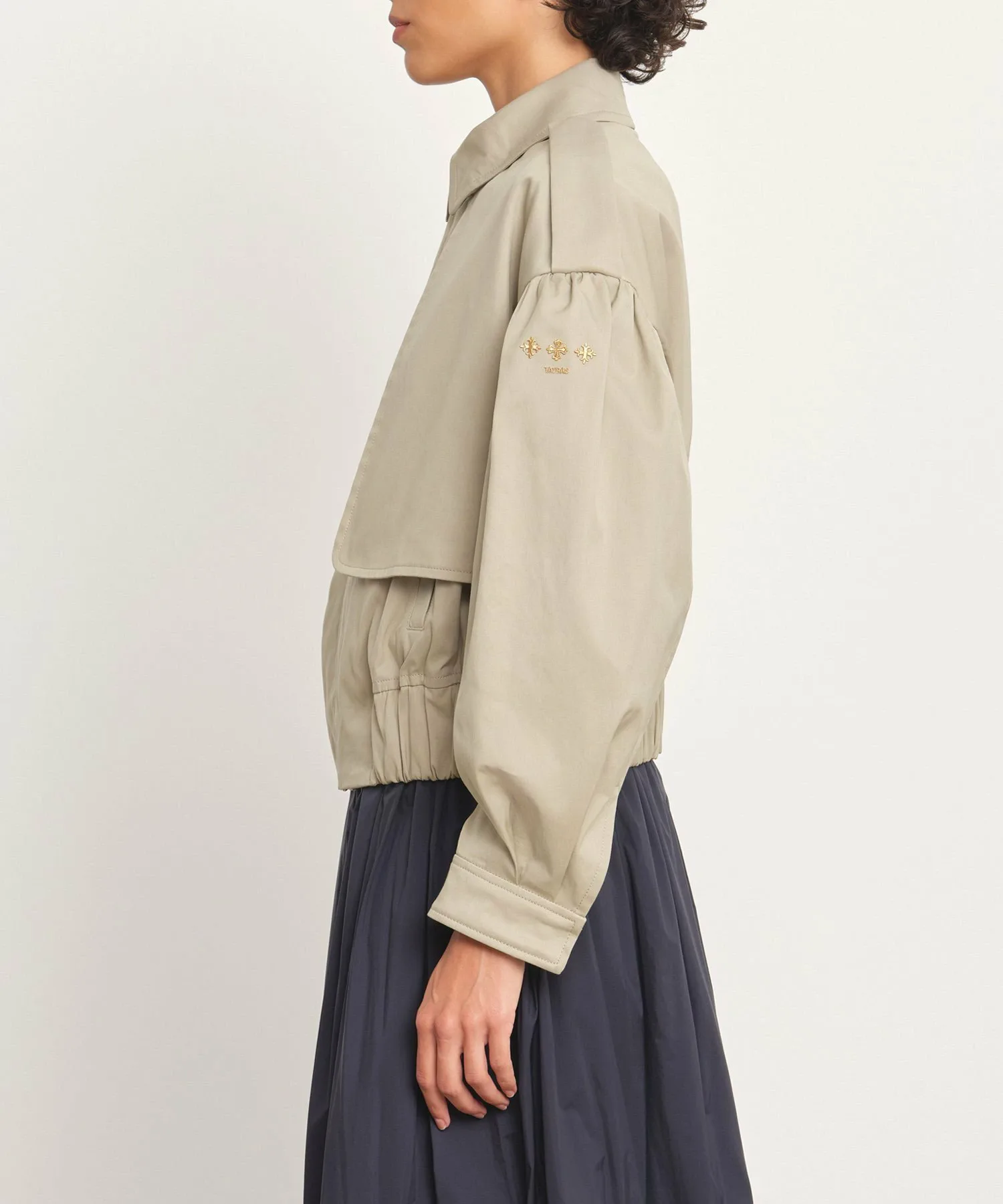 TATRAS MATALA — лёгкая блузоновая куртка укороченной длины в стиле тренча. Детали в стиле милитари, такие как асимметричные клапаны для пистолетов спереди и петлицы в виде эполет на рукавах, привлекают внимание. В комплект также входит утеплитель для подбородка. Складки на плечах и широкий эластичный низ создают трёхмерный силуэт, придавая изделию выразительный и эффектный вид. Ткань — мягкий, эластичный твил средней плотности. Это идеально сбалансированное изделие сочетает в себе классические и женственные элементы. [Примечание] Изображения товара являются образцами и могут отличаться от реального продукта. Таблица размеров основана на выкройке и может отличаться от реального продукта. В комплект входит только вешалка TATRAS.