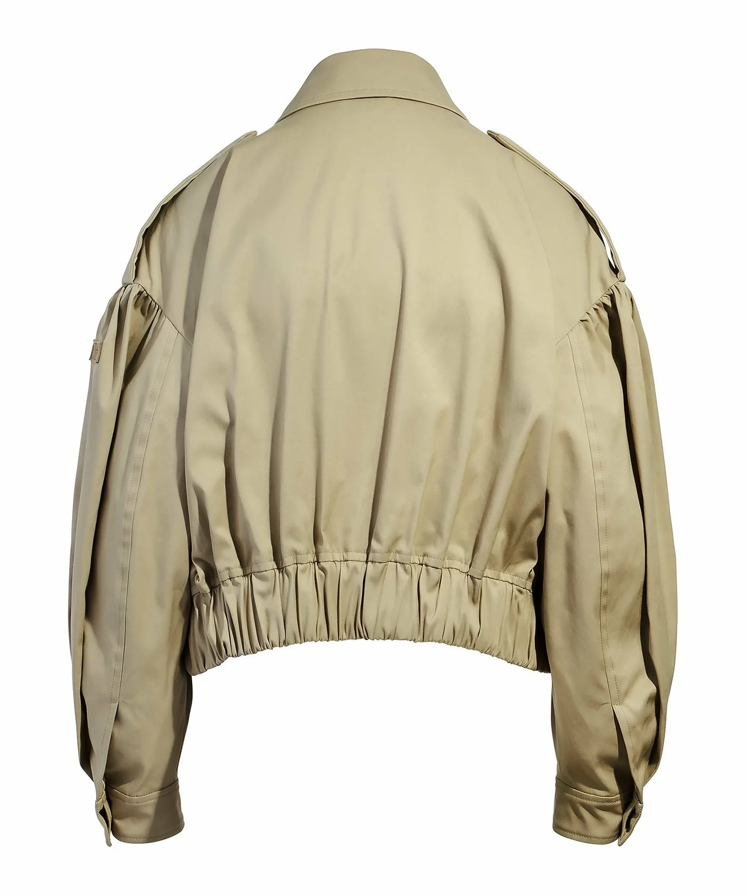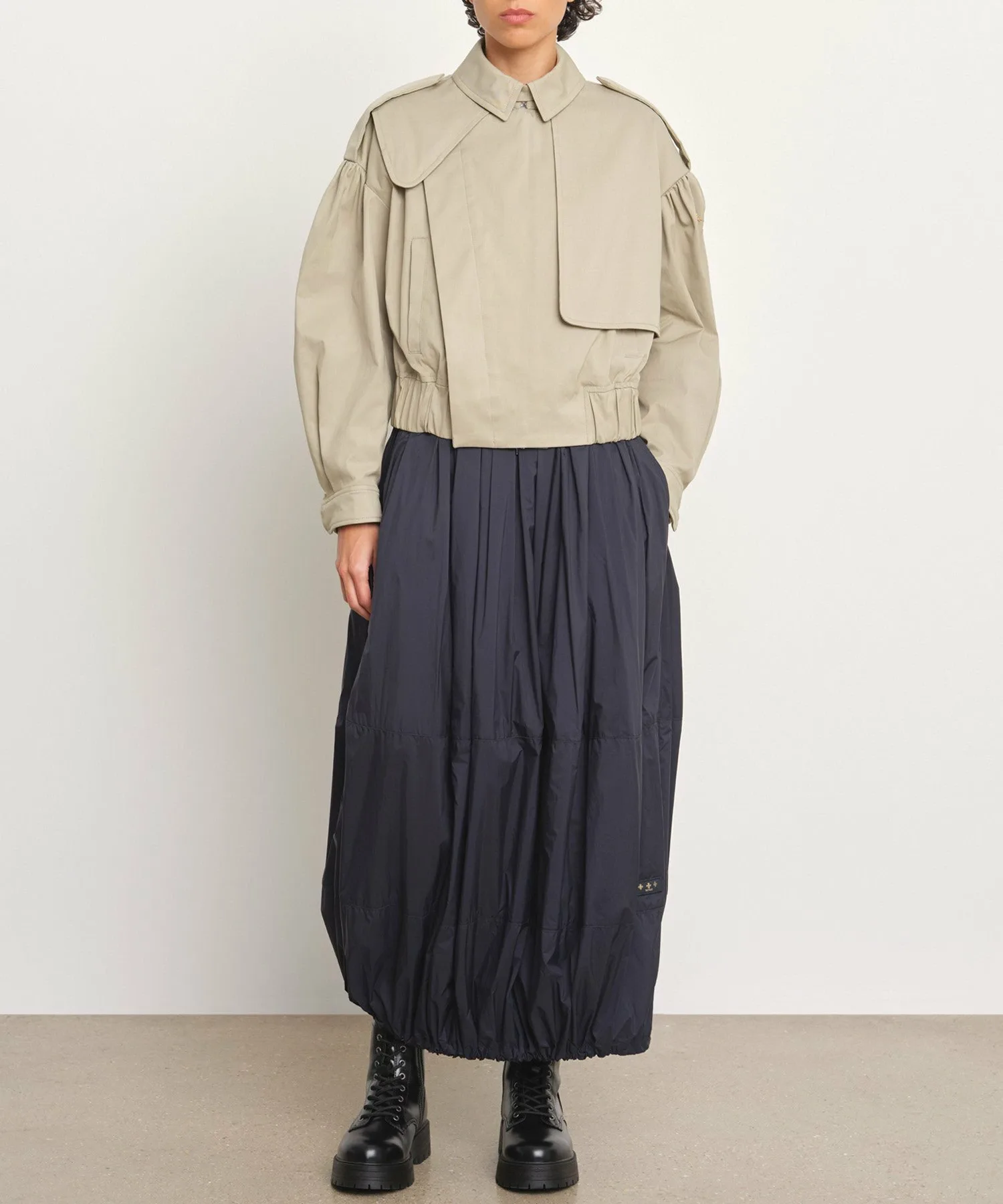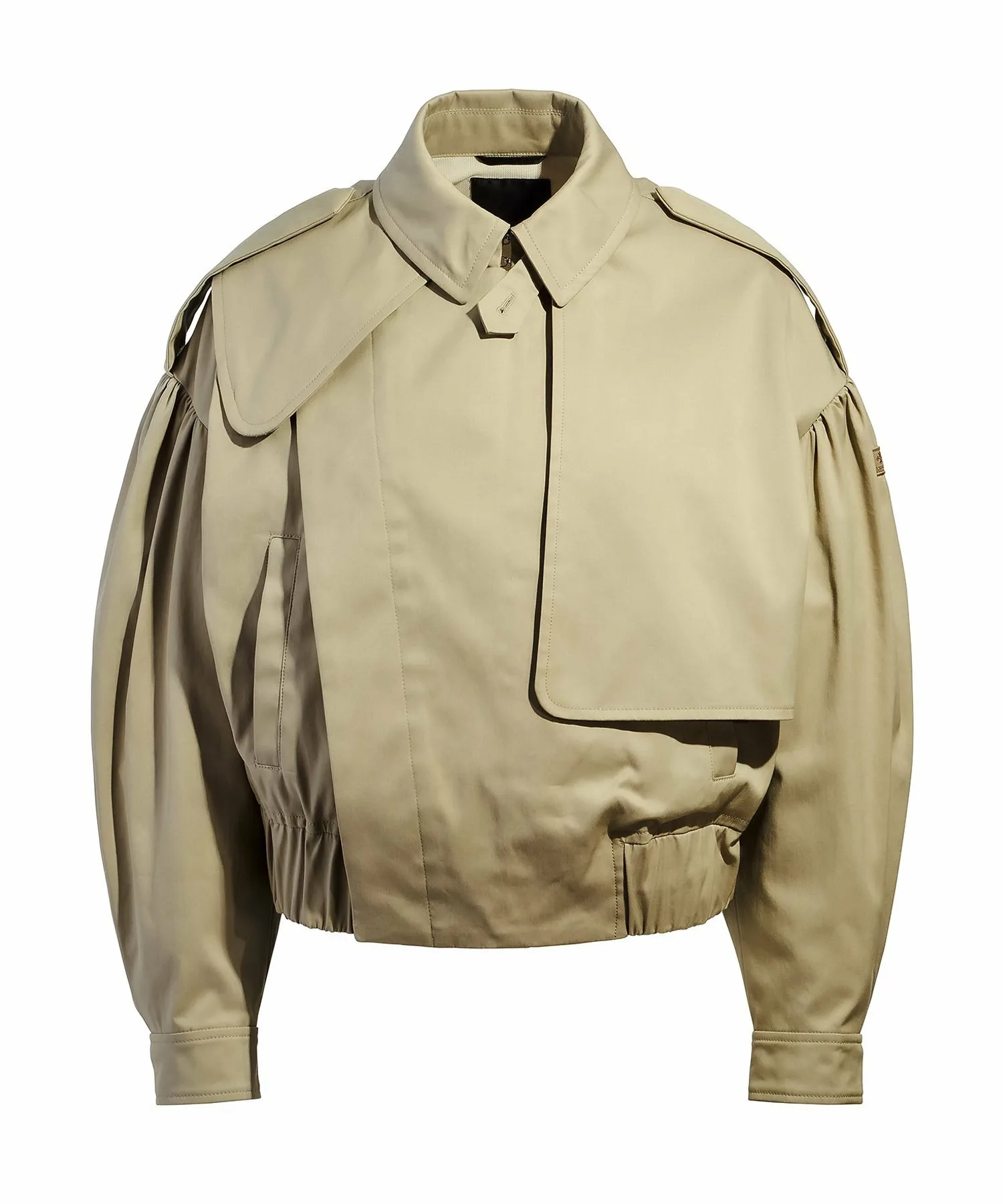 TATRAS MATALA — лёгкая блузоновая куртка укороченной длины в стиле тренча. Детали в стиле милитари, такие как асимметричные клапаны для пистолетов спереди и петлицы в виде эполет на рукавах, привлекают внимание. В комплект также входит утеплитель для подбородка. Складки на плечах и широкий эластичный низ создают трёхмерный силуэт, придавая изделию выразительный и эффектный вид. Ткань — мягкий, эластичный твил средней плотности. Это идеально сбалансированное изделие сочетает в себе классические и женственные элементы. [Примечание] Изображения товара являются образцами и могут отличаться от реального продукта. Таблица размеров основана на выкройке и может отличаться от реального продукта. В комплект входит только вешалка TATRAS.