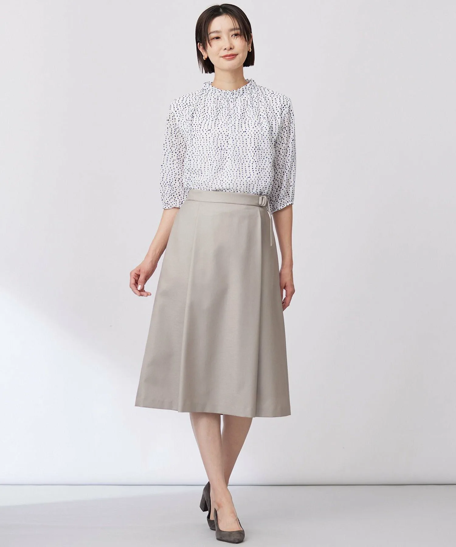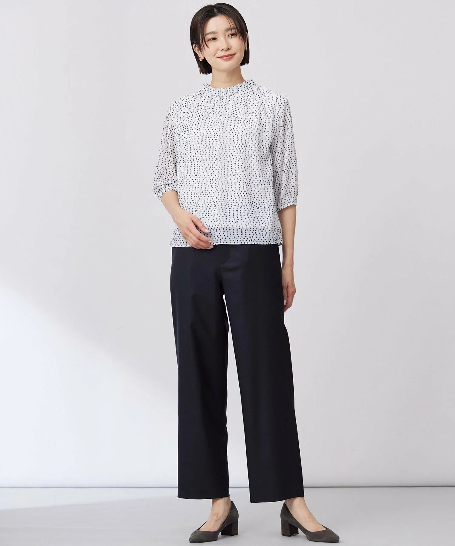 Дизайн: Пуловер с вырезом-бутылкой и складками на горловине. Верхняя ткань тканая, а основная часть выполнена из двойного трикотажа, поэтому его можно носить, не опасаясь просвечивания. Гладкая ткань создает ощущение свежести и привлекает внимание. Сочетайте его с простыми брюками или юбкой для изысканного и освежающего весеннего образа.