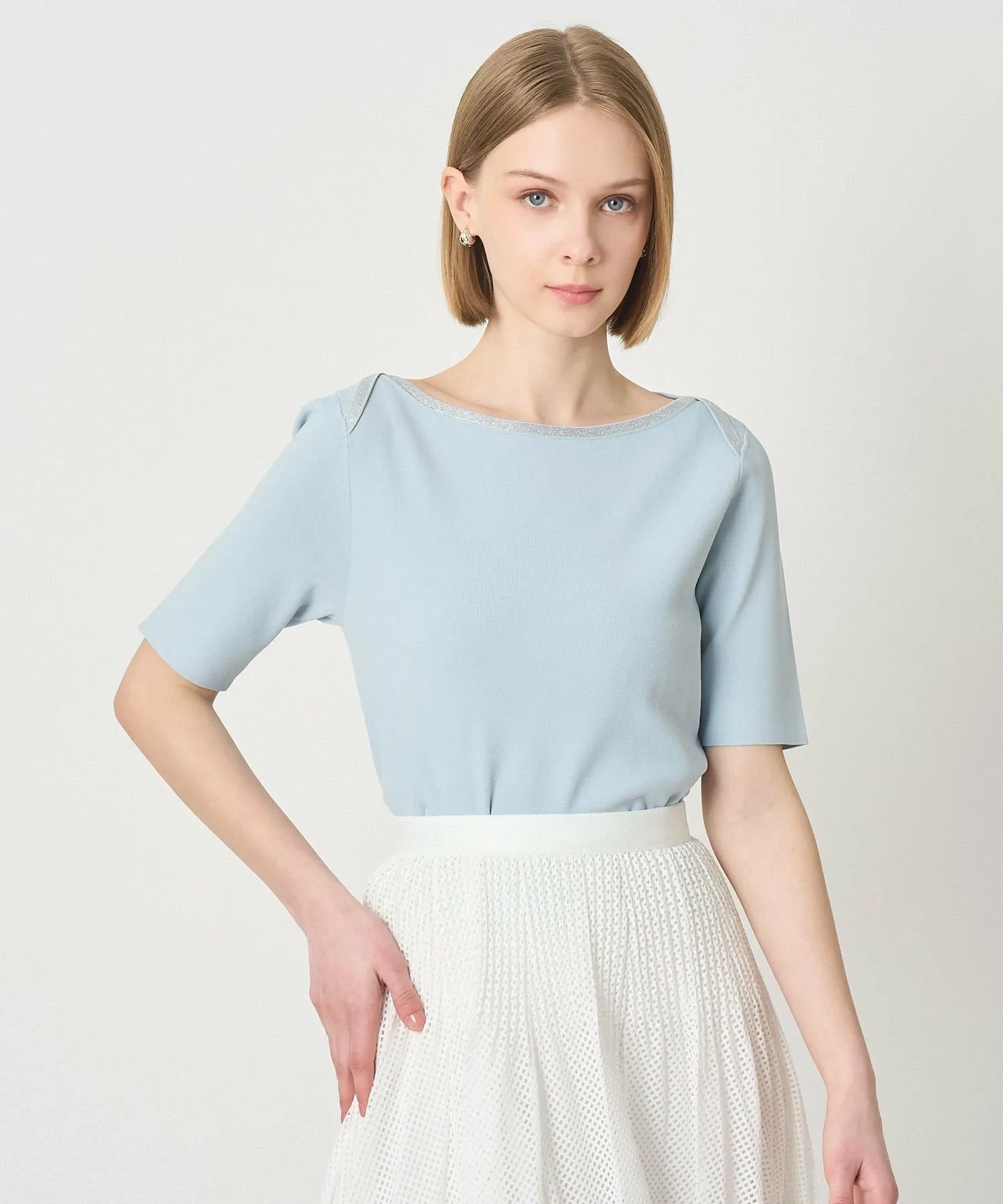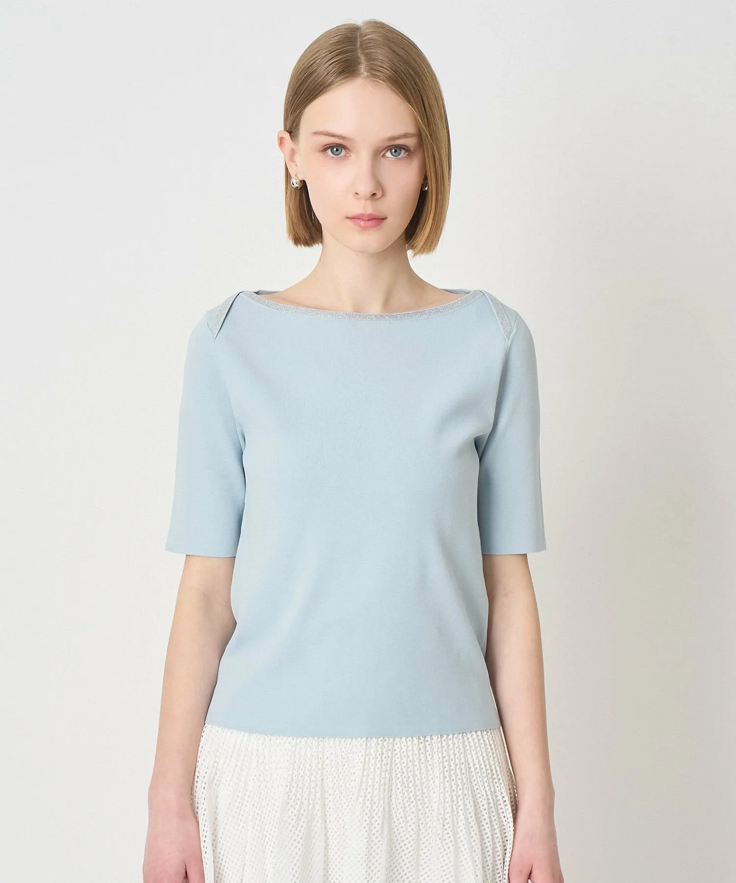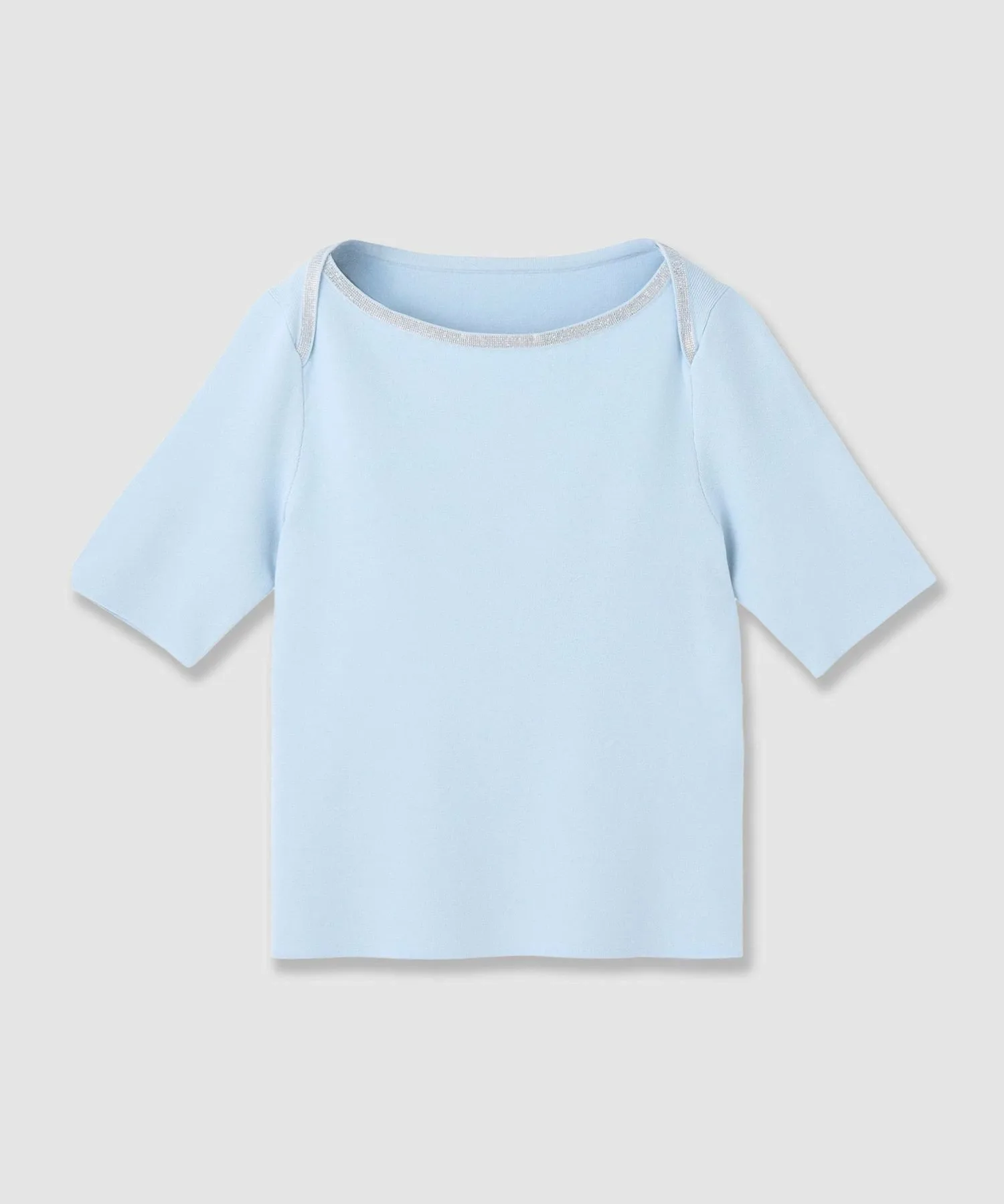 Пуловер с классическим морским вырезом-лодочкой, ненавязчиво украшенный драгоценными камнями.