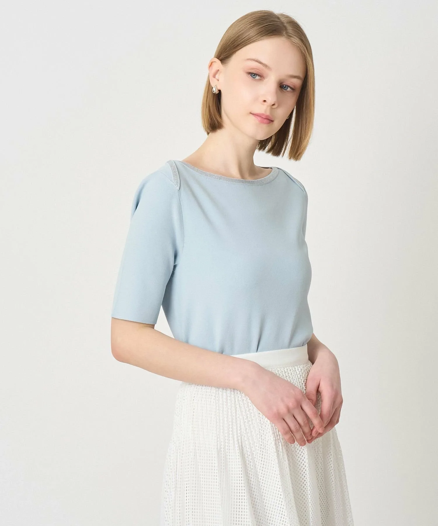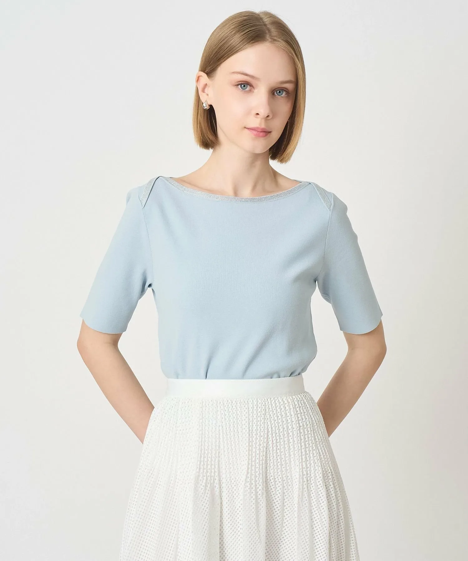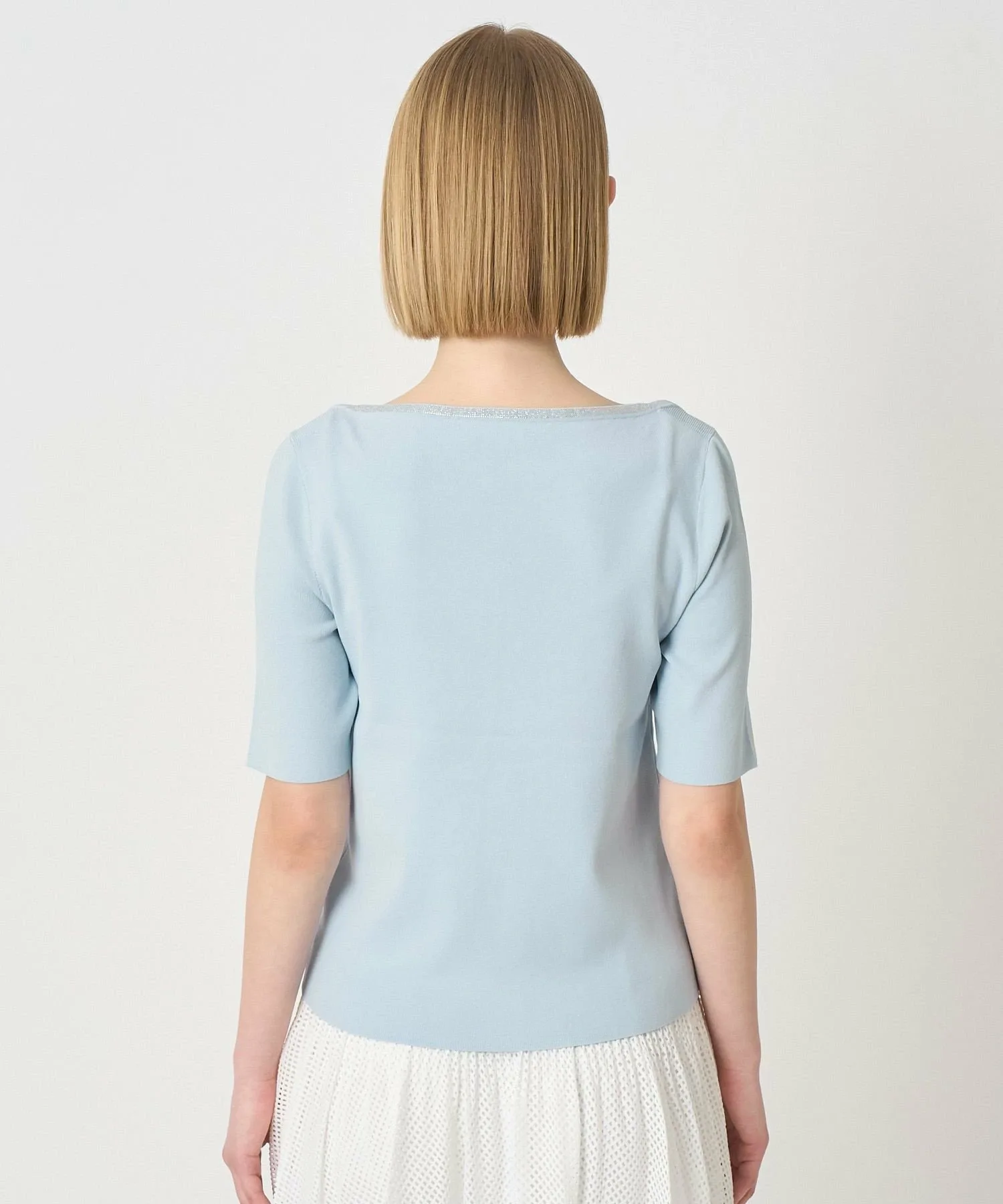 Пуловер с классическим морским вырезом-лодочкой, ненавязчиво украшенный драгоценными камнями.
