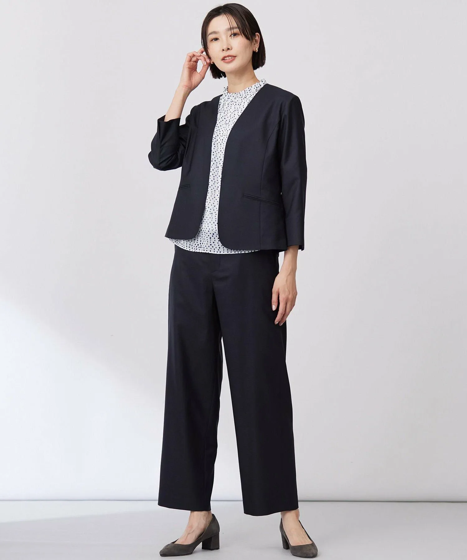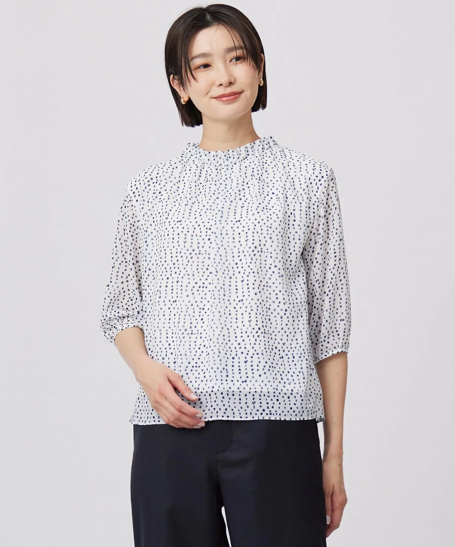 Дизайн: Пуловер с вырезом-бутылкой и складками на горловине. Верхняя ткань тканая, а основная часть выполнена из двойного трикотажа, поэтому его можно носить, не опасаясь просвечивания. Гладкая ткань создает ощущение свежести и привлекает внимание. Сочетайте его с простыми брюками или юбкой для изысканного и освежающего весеннего образа.