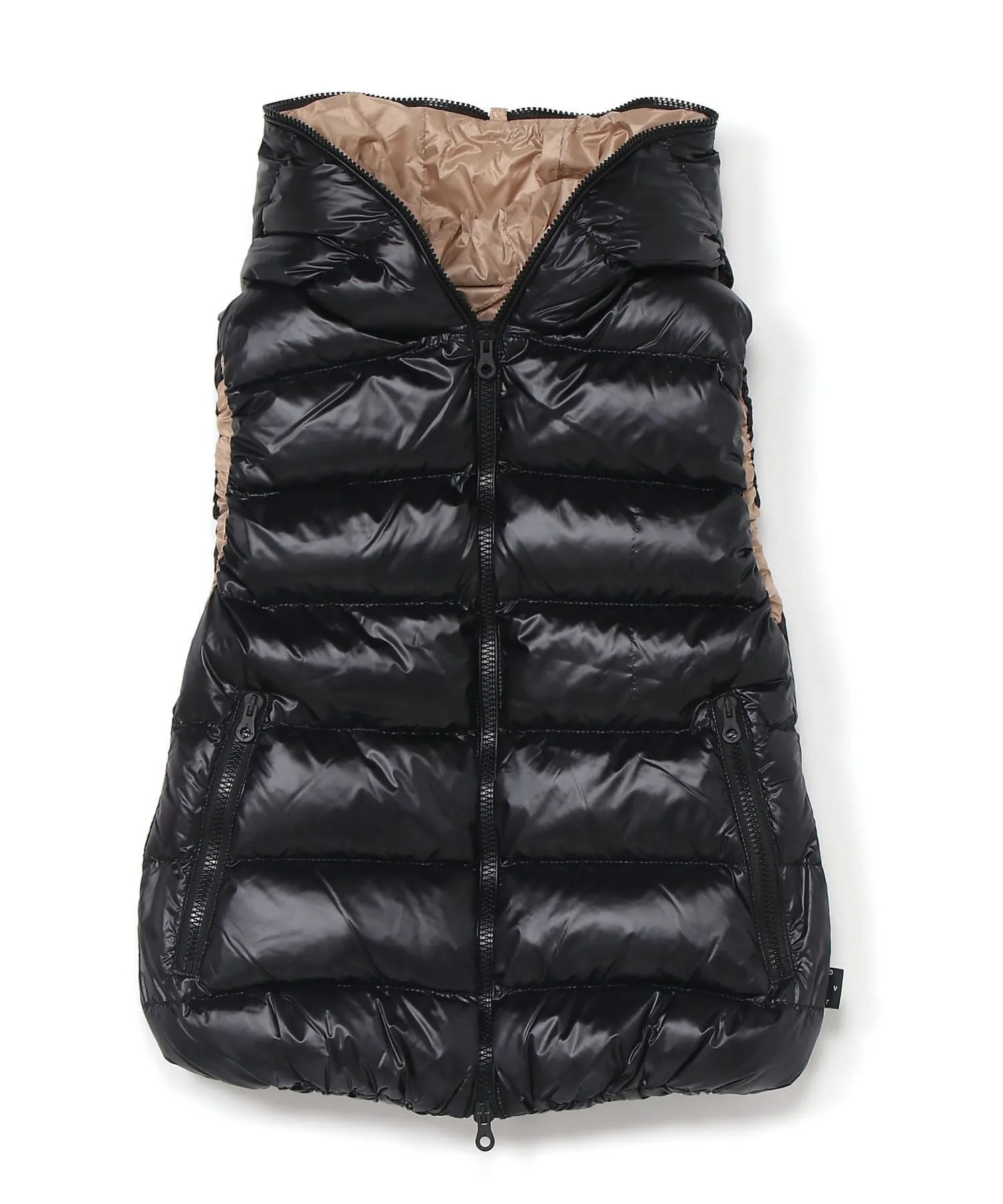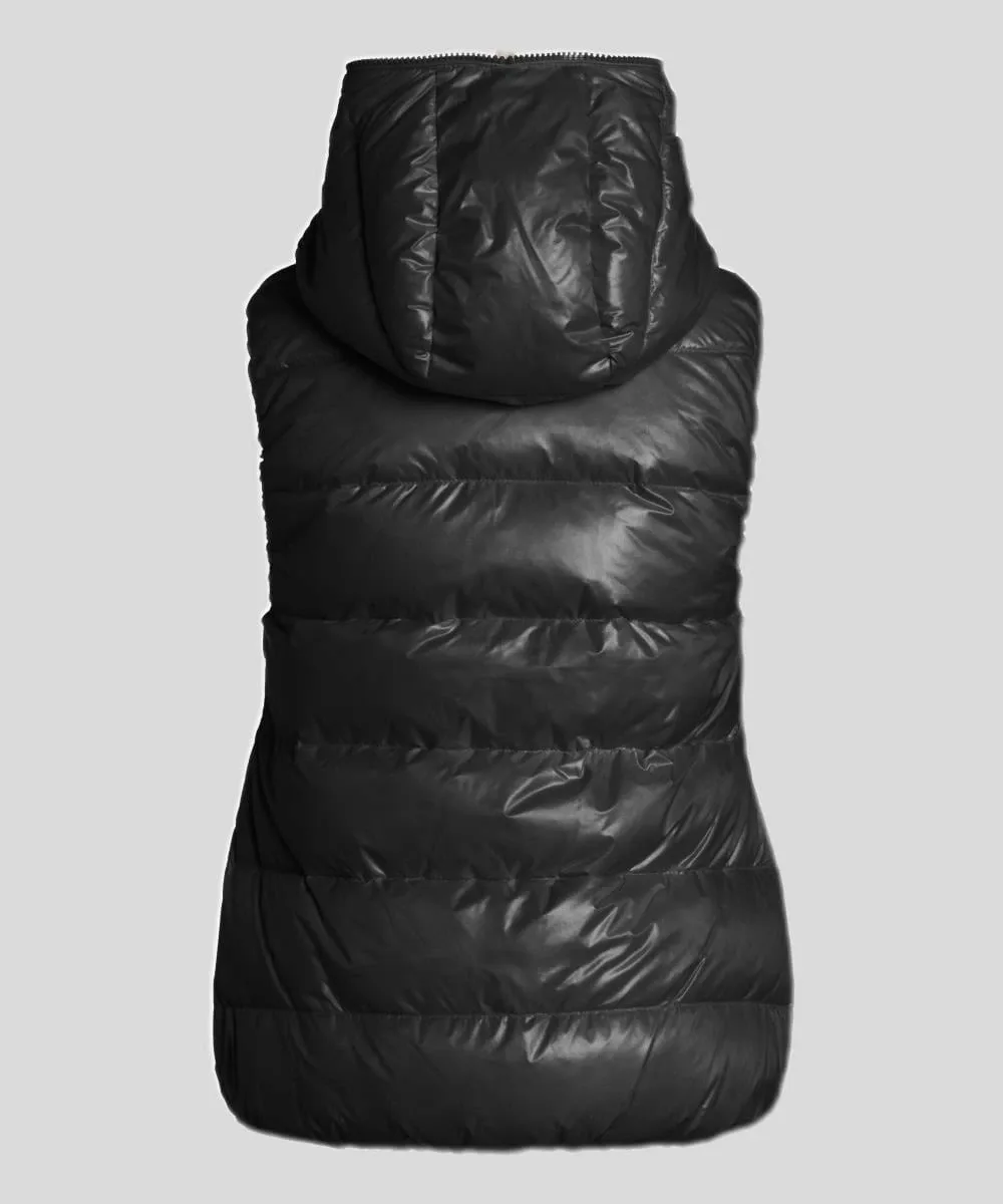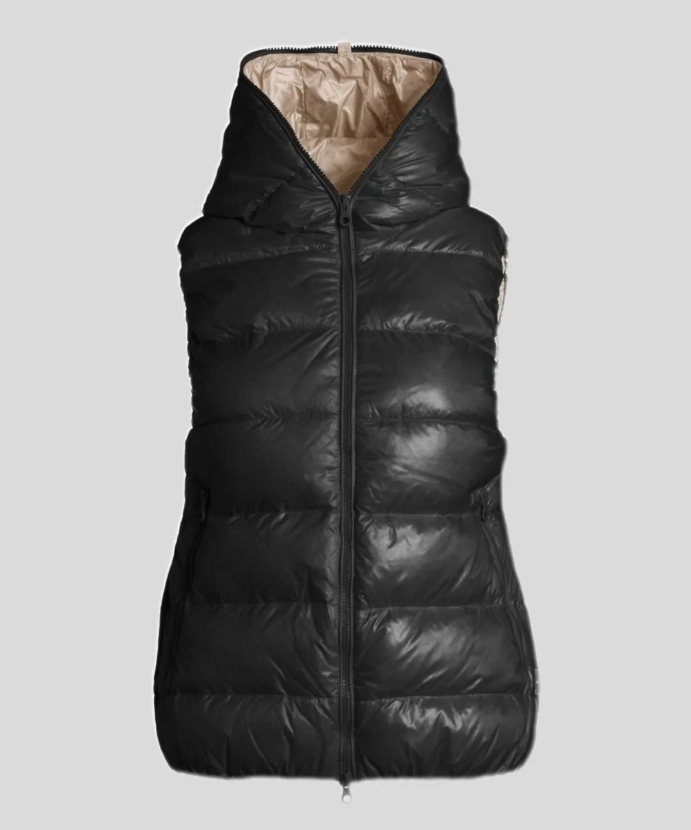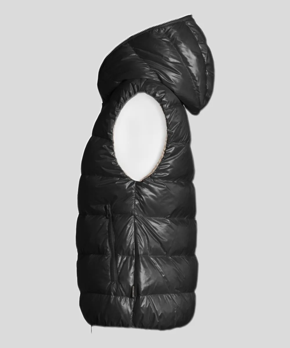 Материал имеет умеренный блеск, и, несмотря на то, что это пуховый жилет, его дизайн не предполагает активного отдыха на природе, что делает его удобным для повседневной носки.