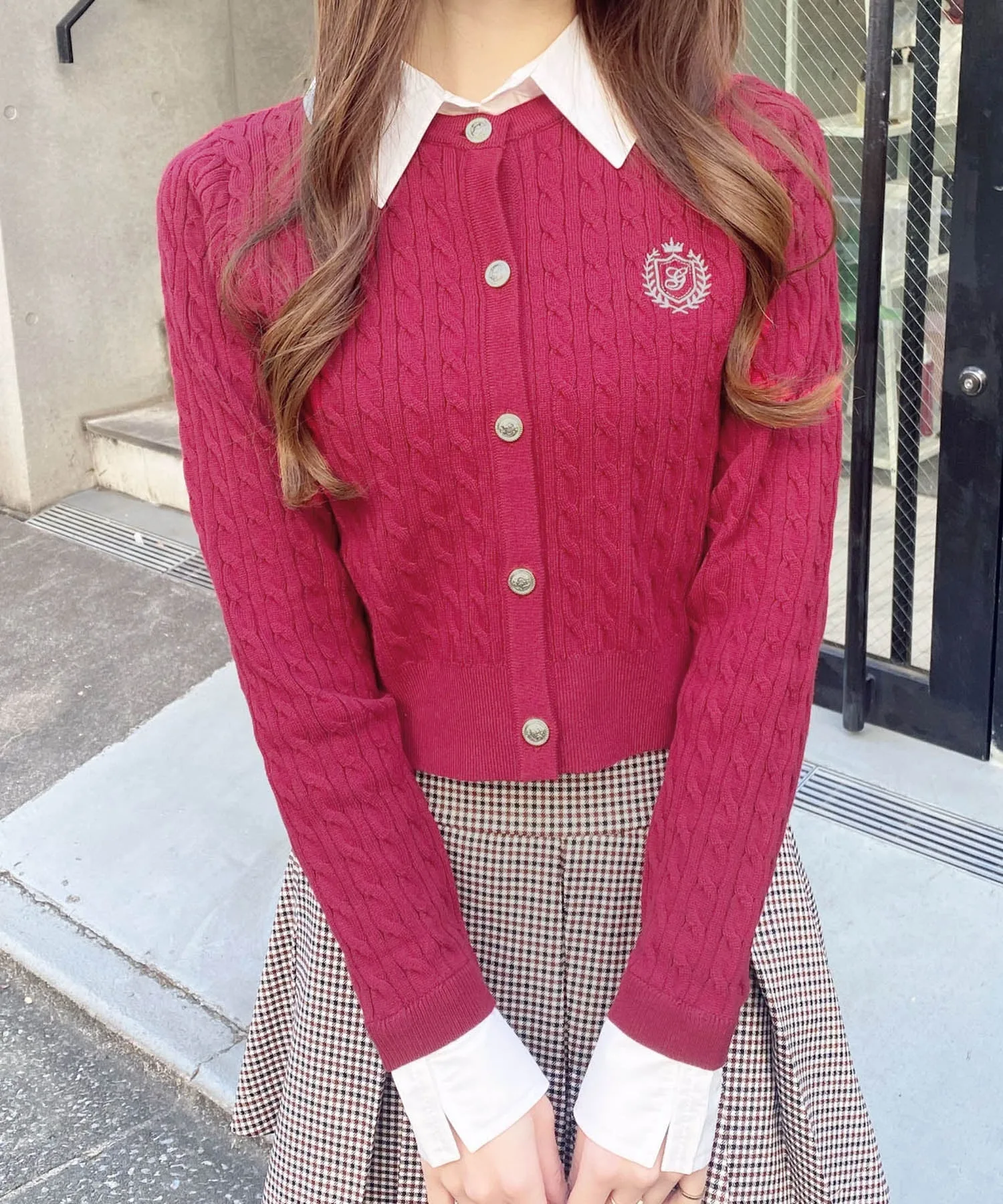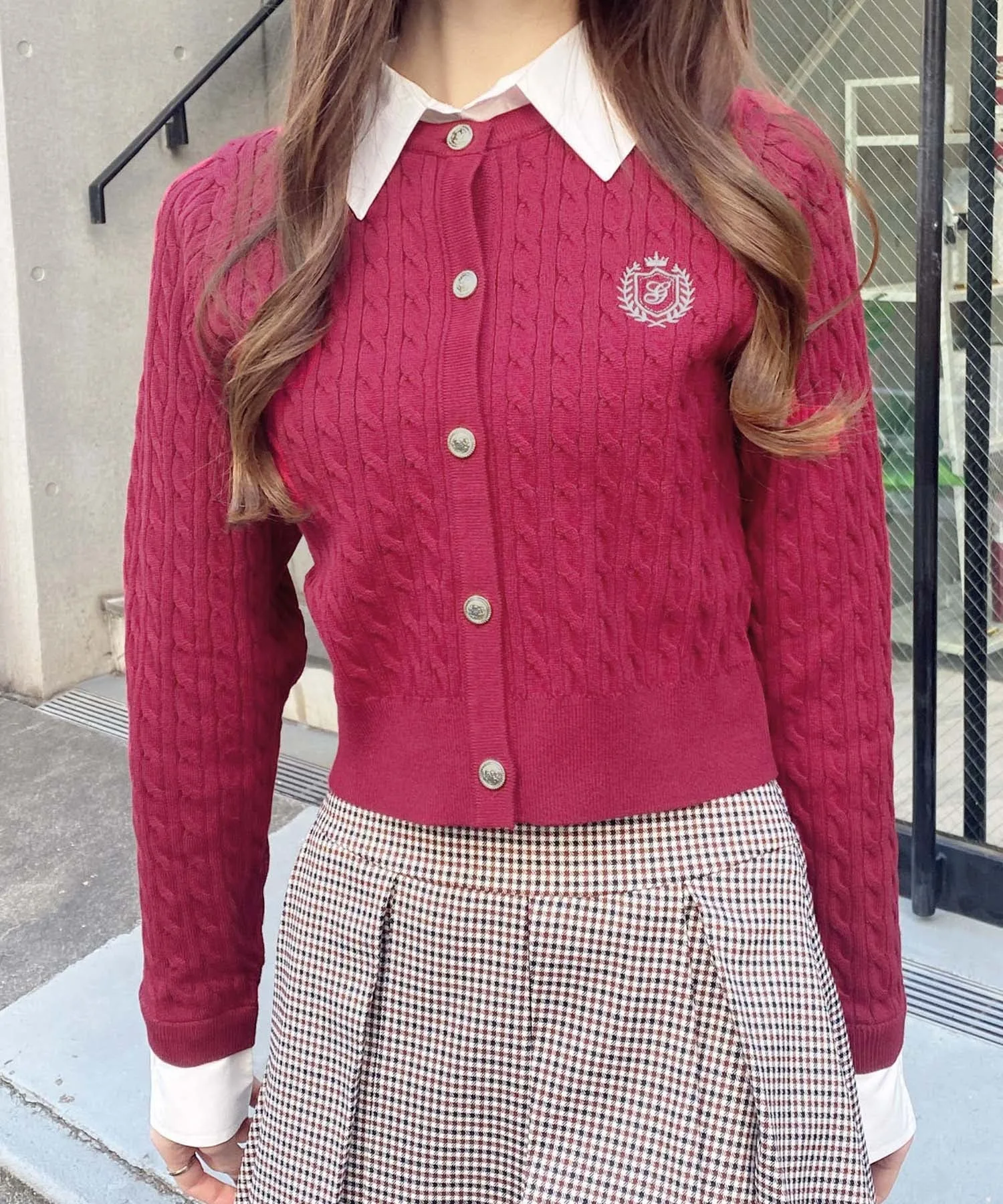 Мягкая, женственная вязаная вещь с вышитым логотипом на груди и металлическими пуговицами в качестве акцентов.