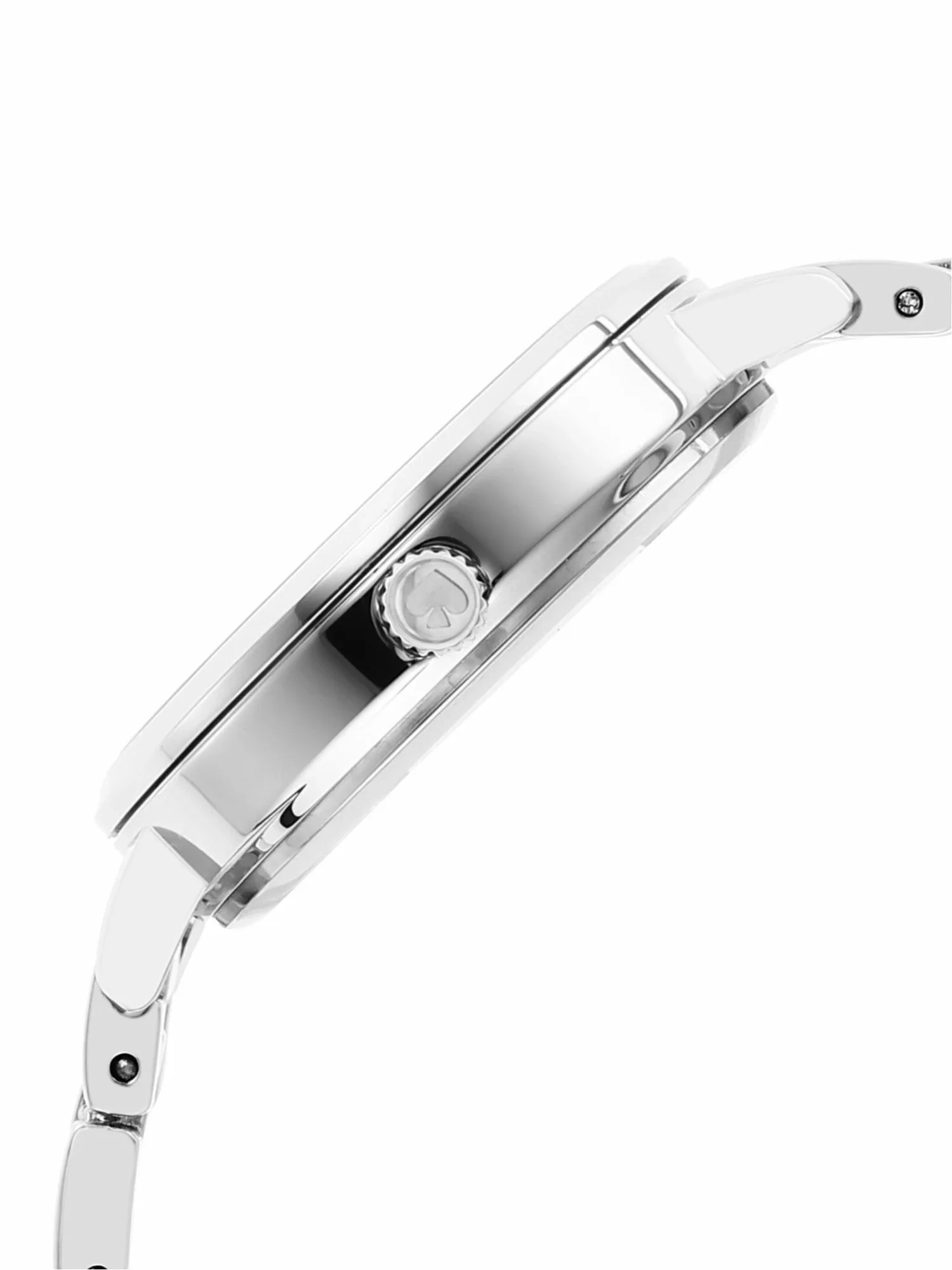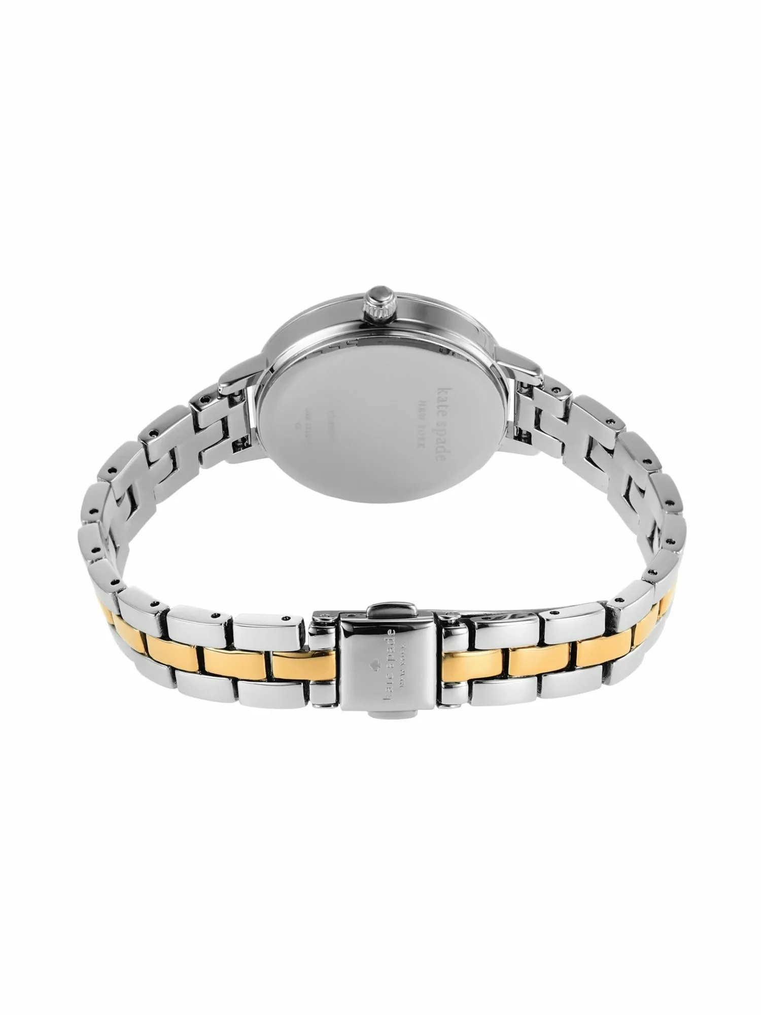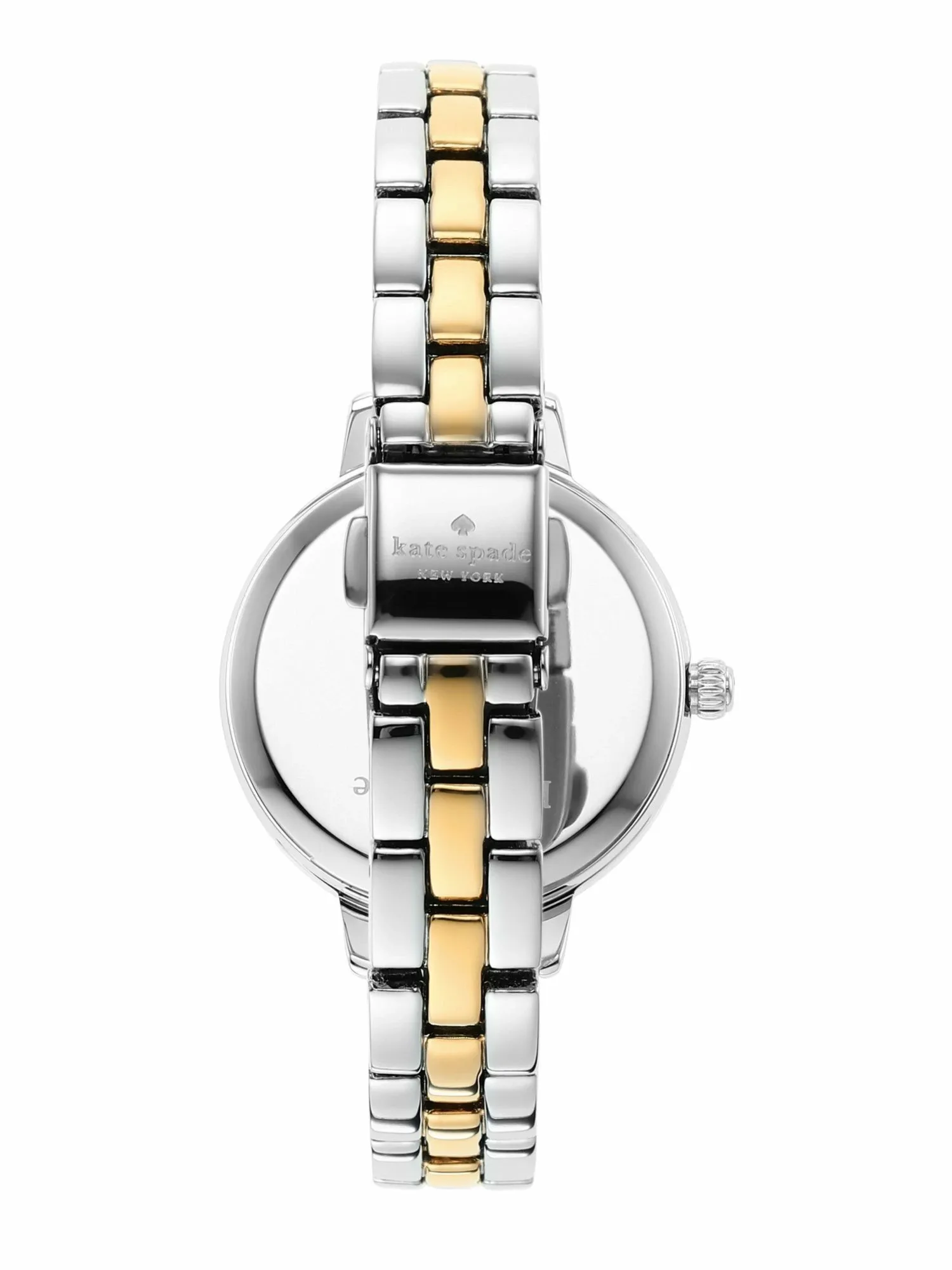 Эти часы Kate Spade METRO оснащены трехстрелочным механизмом в корпусе диаметром 30 мм. Они имеют элегантный белый циферблат с золотистыми индексами и металлический браслет с золотистыми центральными звеньями.