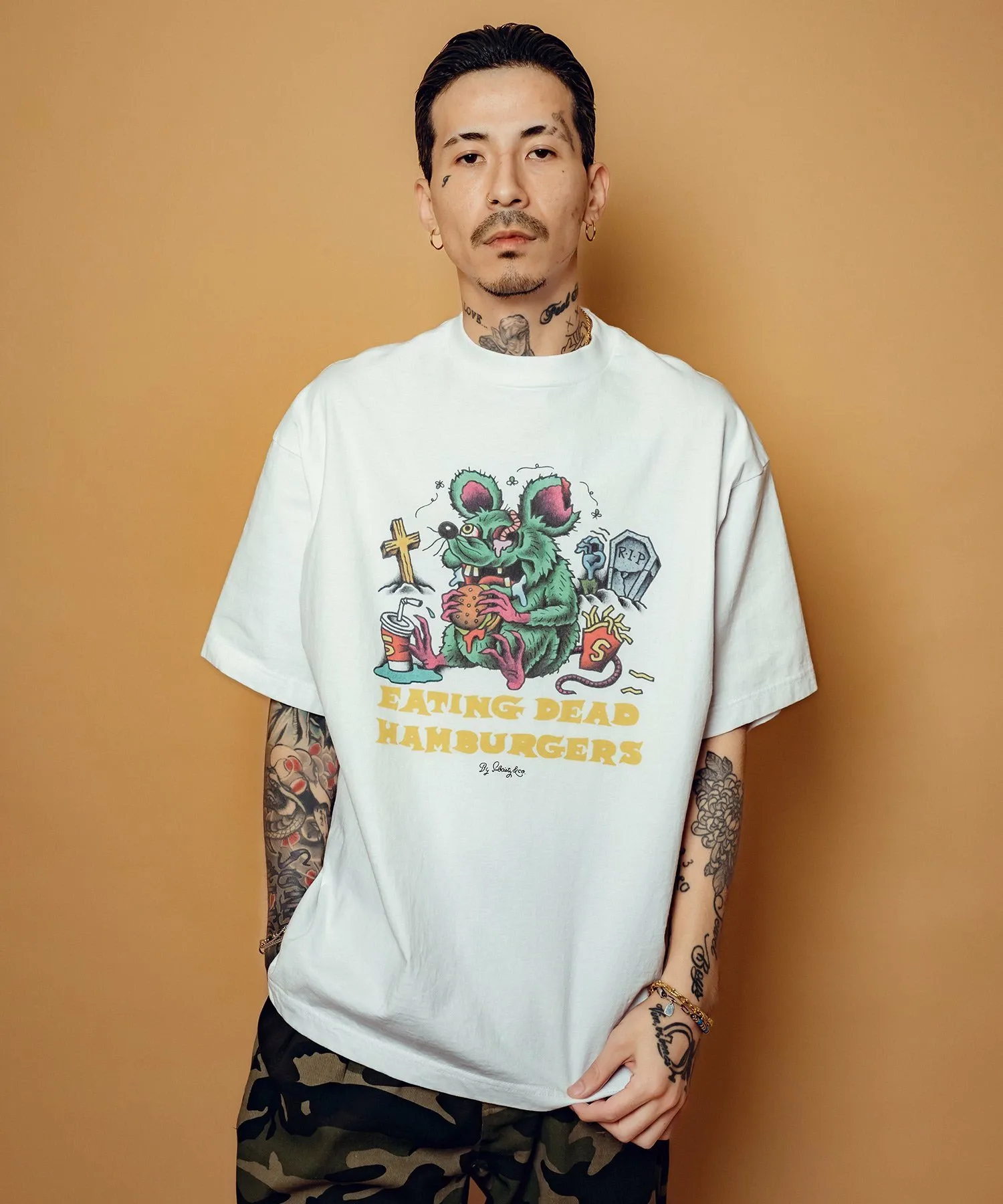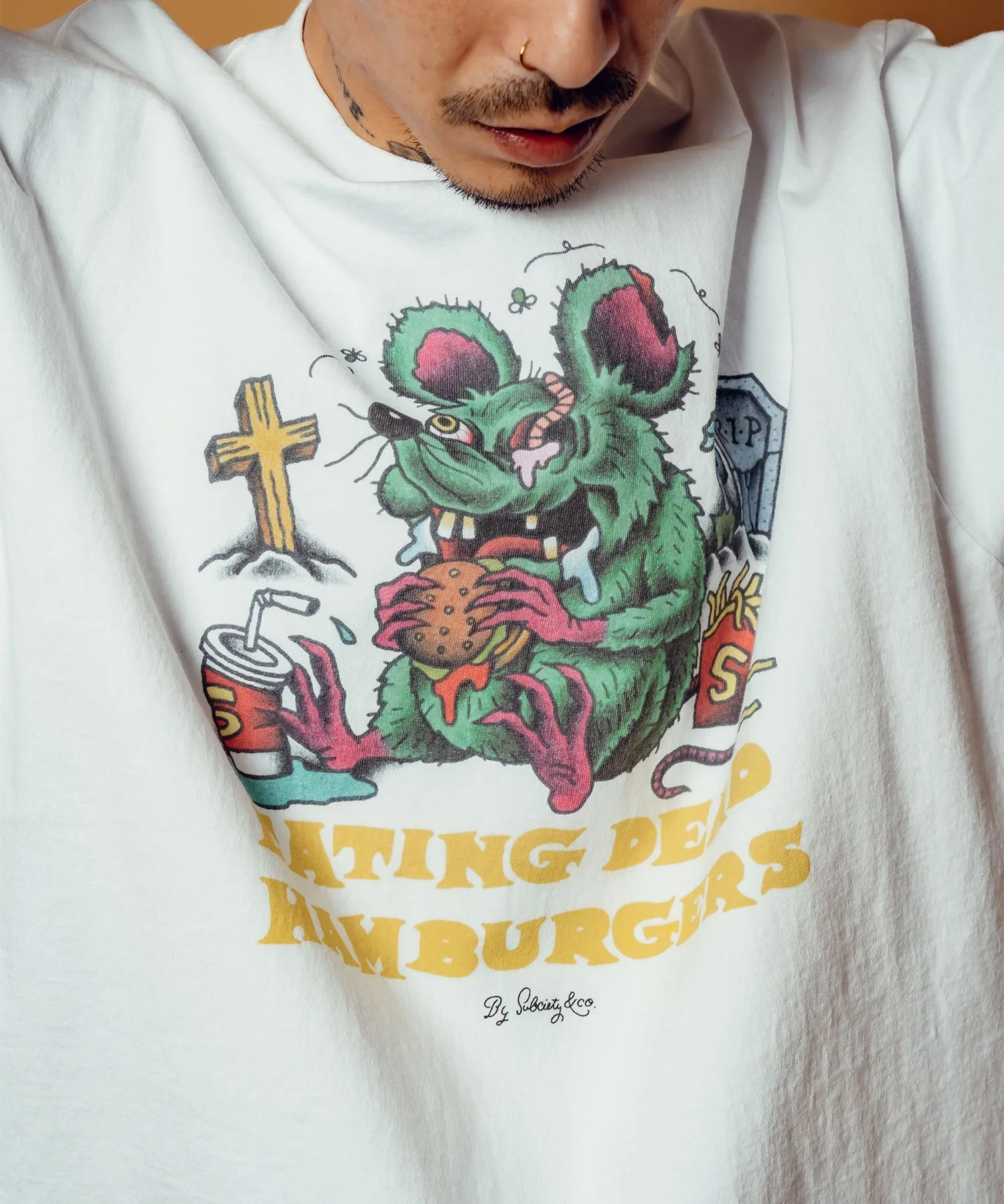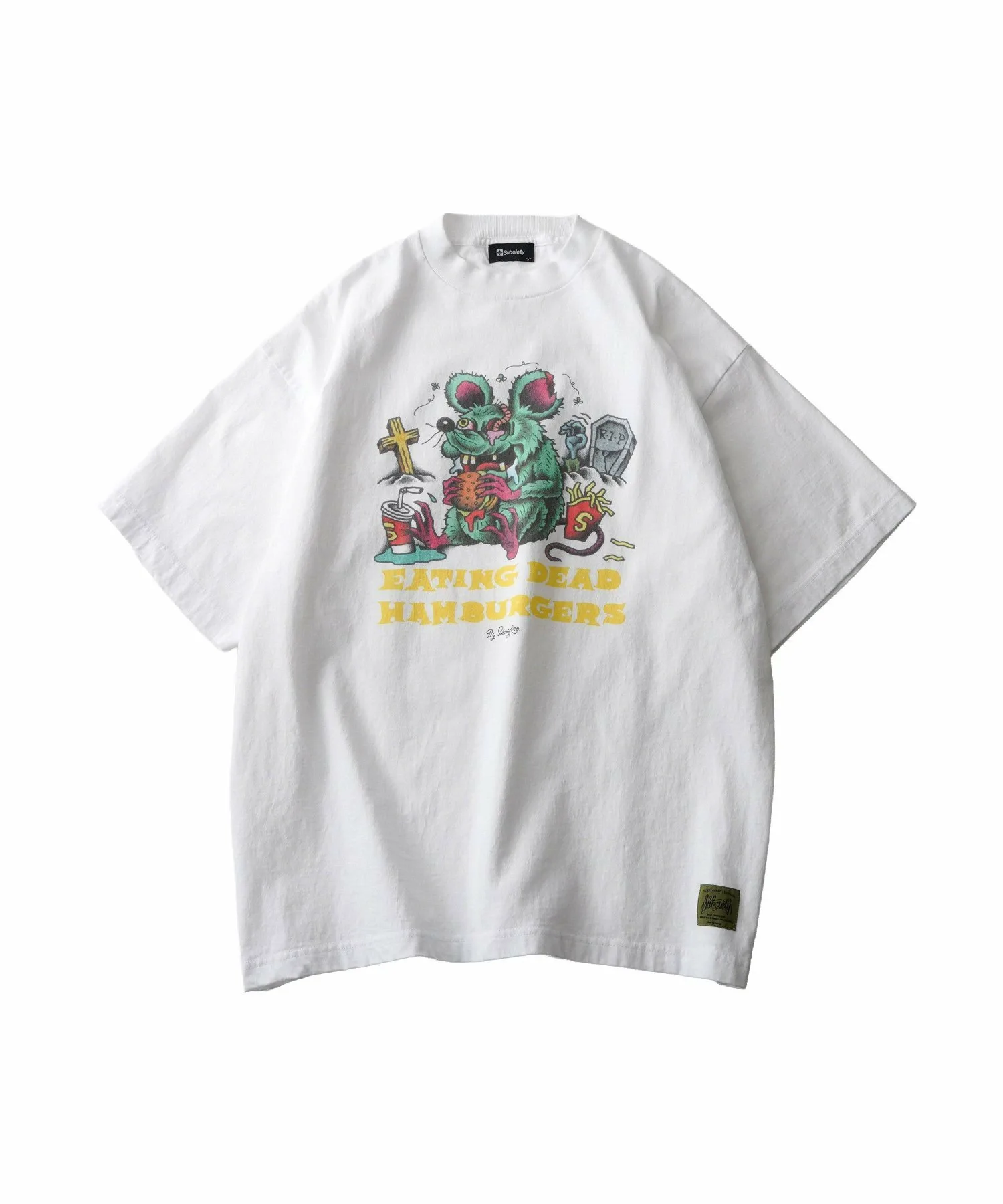 На футболке изображен графический принт, вдохновленный вымышленной бургерной «EATING DEAD HAMBURGERS».