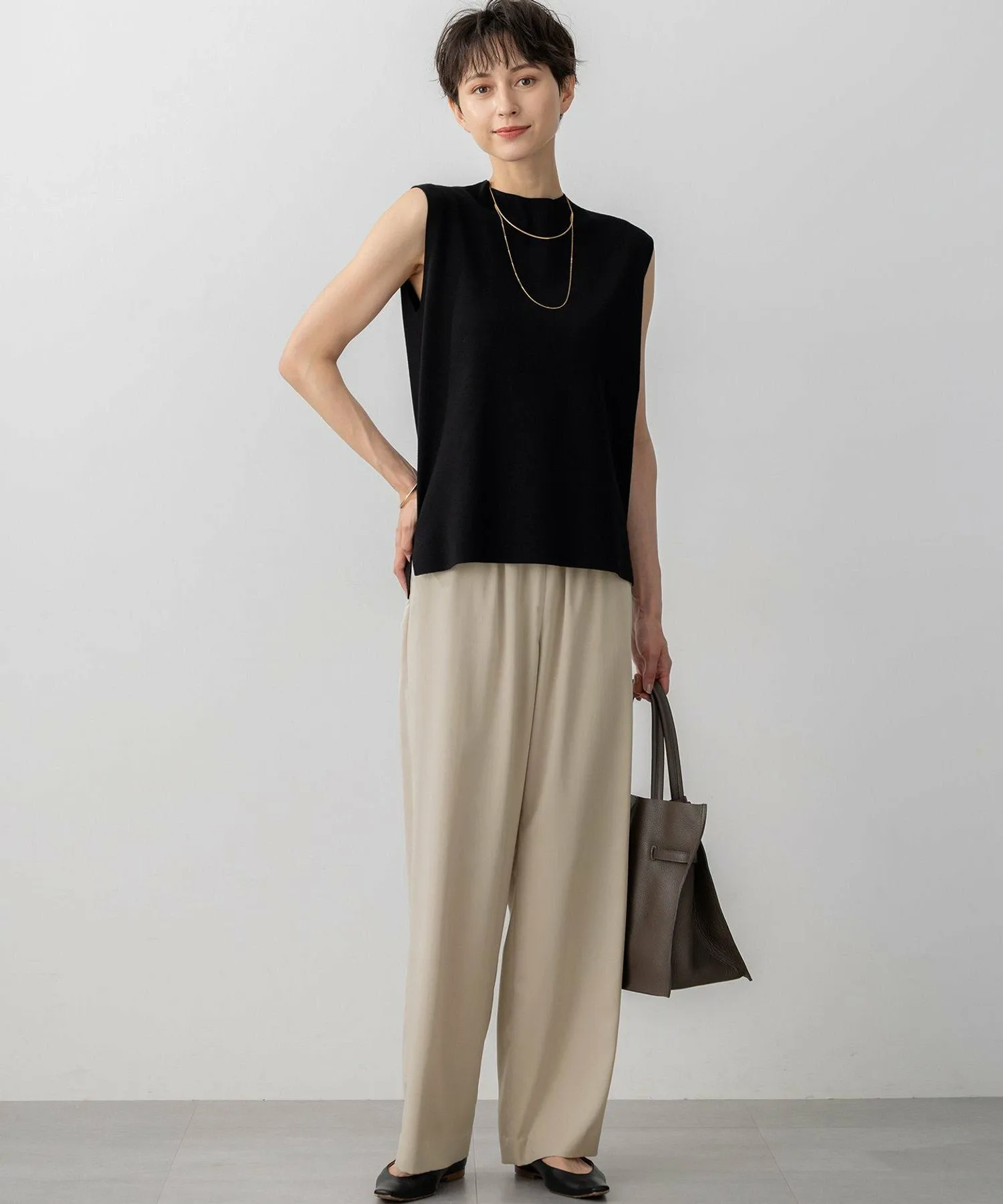 Этот трикотаж без рукавов отличается красивым минималистичным силуэтом, связанным полностью трикотажной вязкой. Идеально подобранный размер скрывает линии тела, создавая обтекаемый вид. Простой воротник-стойка дополняет любой стиль и сам по себе создает изысканный образ. Он идеально сочетается с юбкой или брюками из того же материала для создания гармоничного образа, а также отлично подходит к широким брюкам или объемной юбке. Эта вещь сама по себе завершит изысканный образ ранней осени. Она также хорошо подходит в качестве нижнего слоя под кардиган или жакет и рекомендуется для сочетания с кардиганом из того же материала. Доступен в трех цветах: чистый белый (#001), изысканный серый (#004) и элегантный черный (#005).