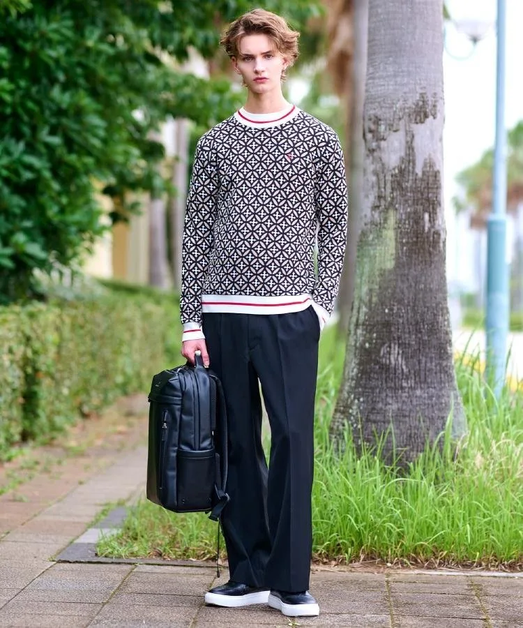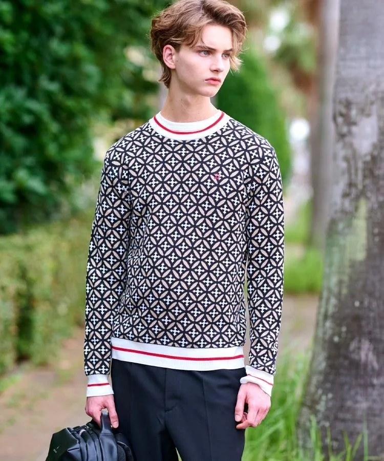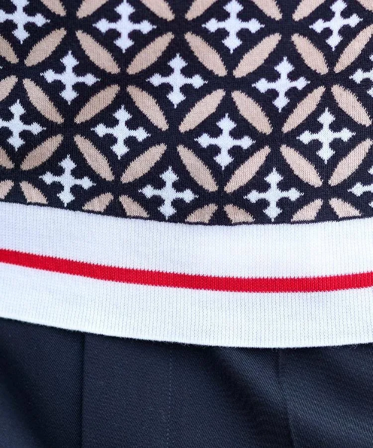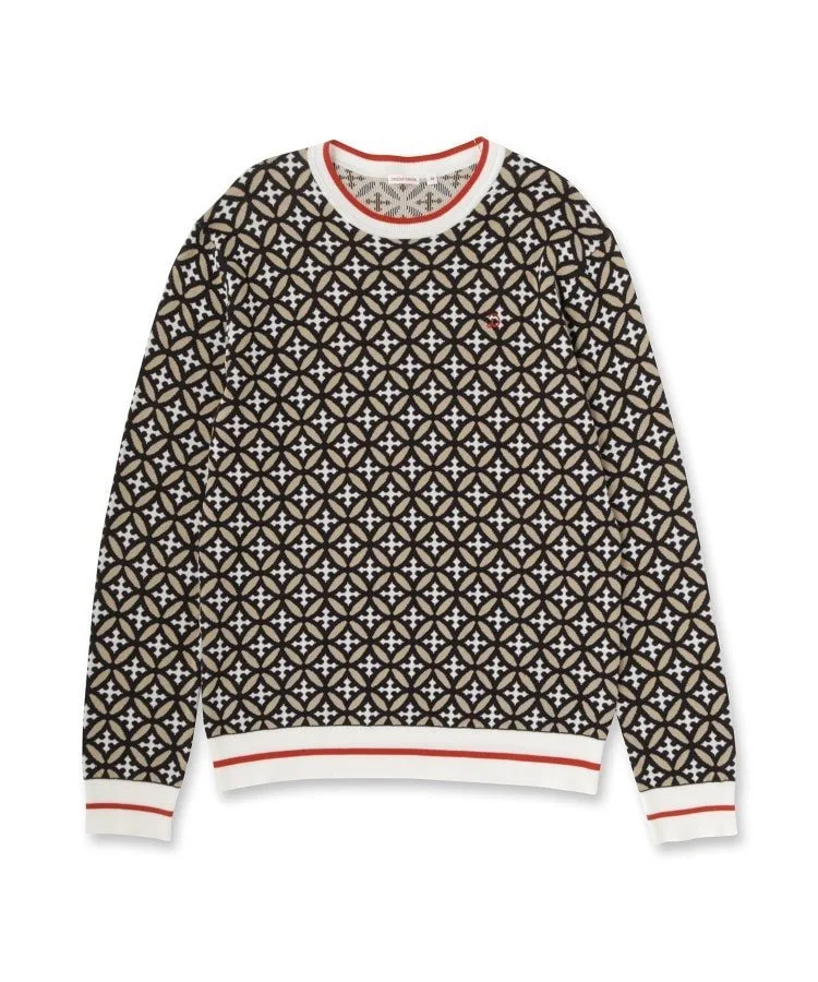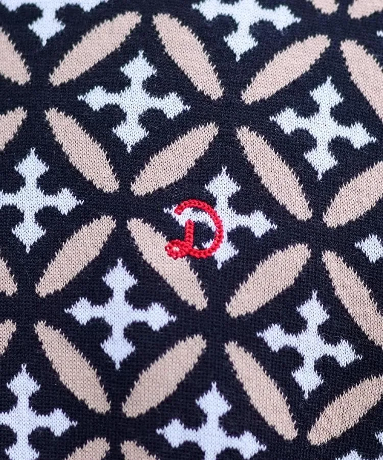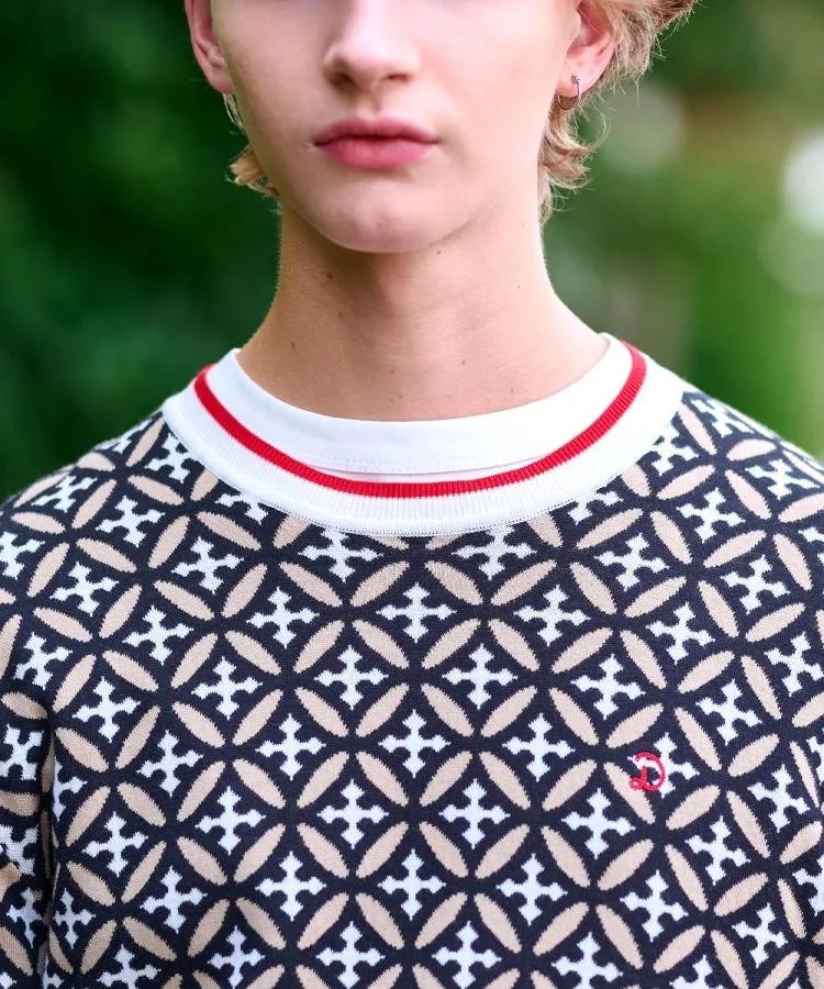 Геометрический узор «Перекрывающиеся круги», состоящий из перекрывающихся колец, сочетается с инициалами Dresssteria, создавая оригинальный графический рисунок, деликатно выраженный в жаккардовом трикотаже.