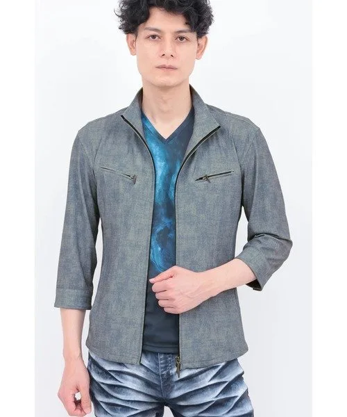Рубашка-блузон с рукавами 3/4 и застежкой-молнией, изготовленная из трикотажной сетки с принтом в стиле джинсовой ткани.
