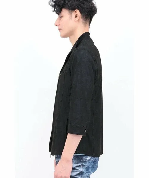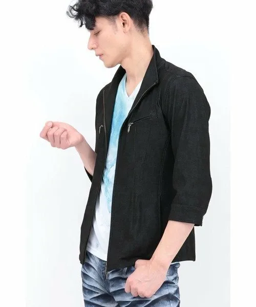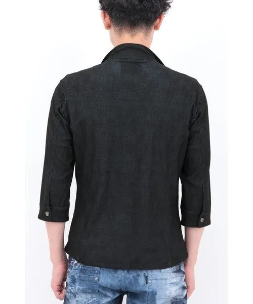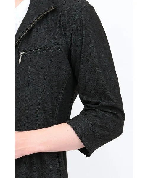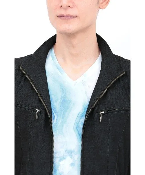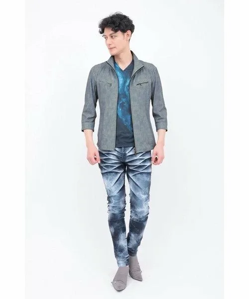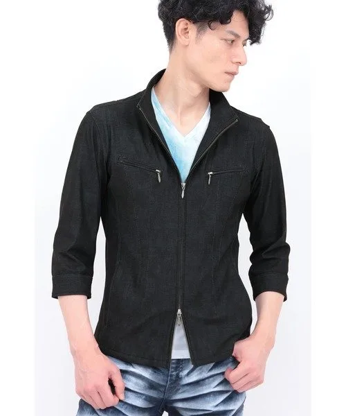 Рубашка-блузон с рукавами 3/4 и застежкой-молнией, изготовленная из трикотажной сетки с принтом в стиле джинсовой ткани.