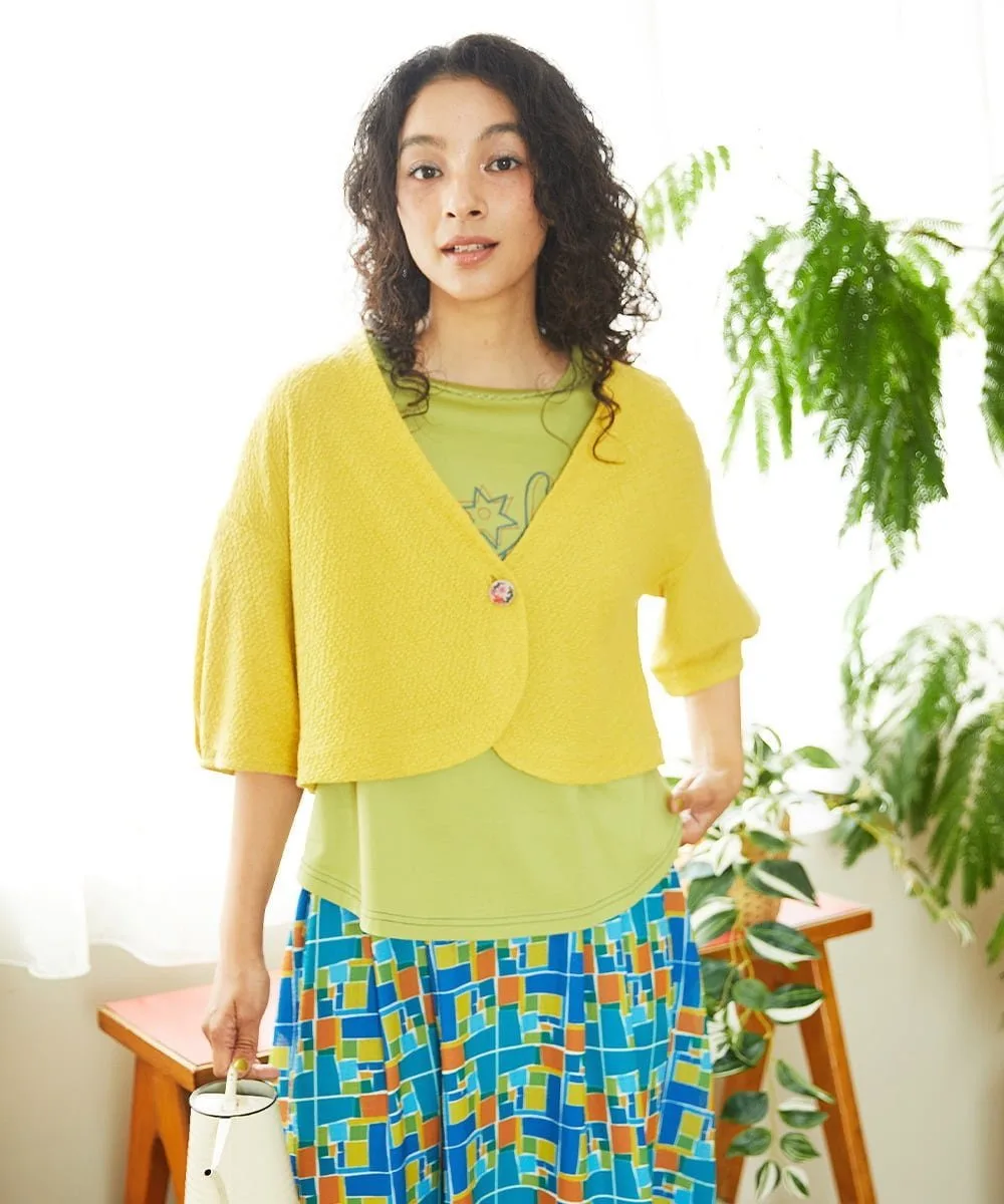 Ослепительно красочный кардиган в стиле болеро. Вдохновлен темой «солнечного желтого». Его свободный силуэт позволяет легко надеть его, а компактная длина выгодно подчеркивает фигуру. V-образный вырез создает лаконичный и стильный образ. Также заслуживают внимания пуговицы из орехового дерева с цветочной вышивкой. Этот универсальный кардиган — обязательный элемент гардероба в этом сезоне.