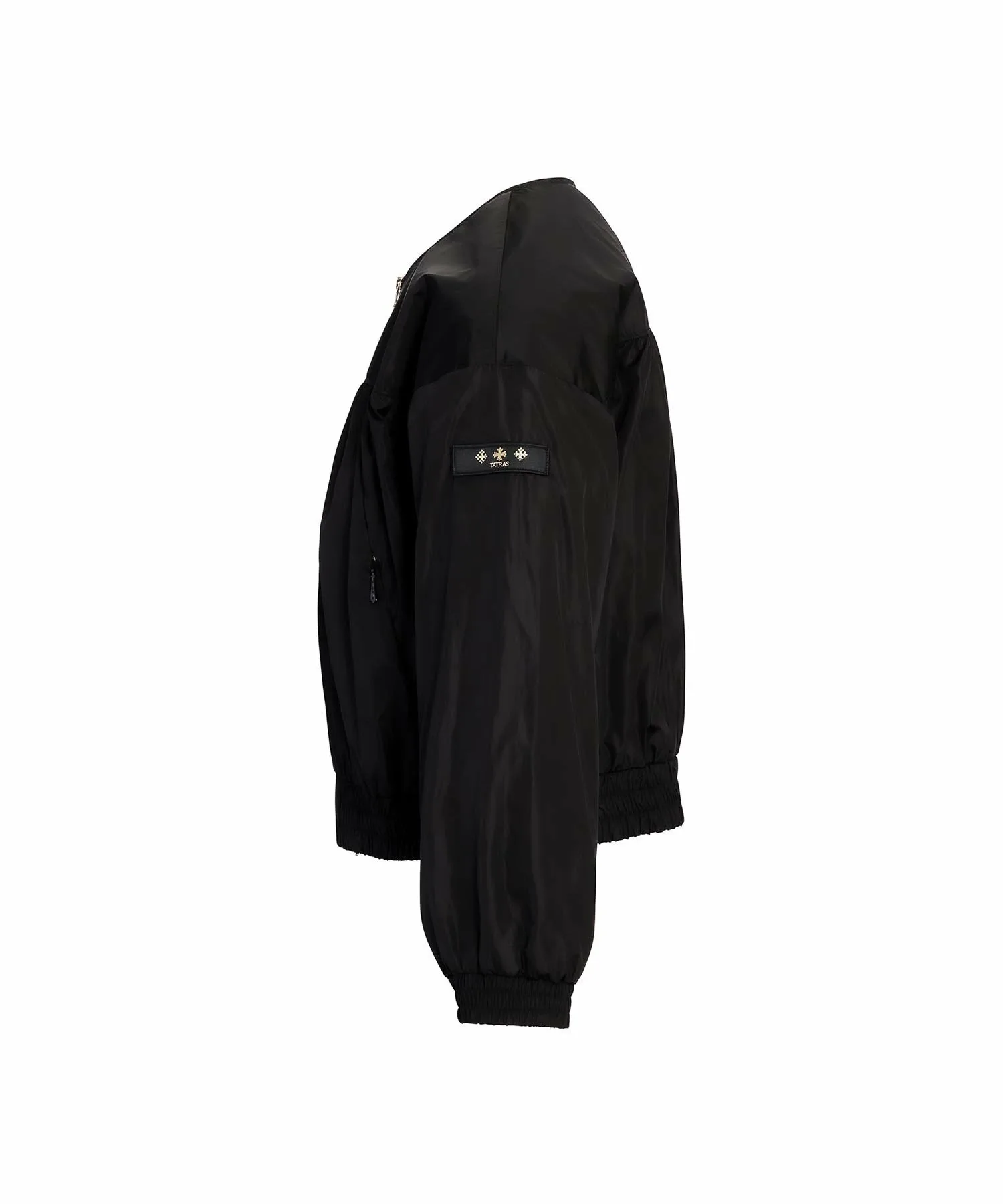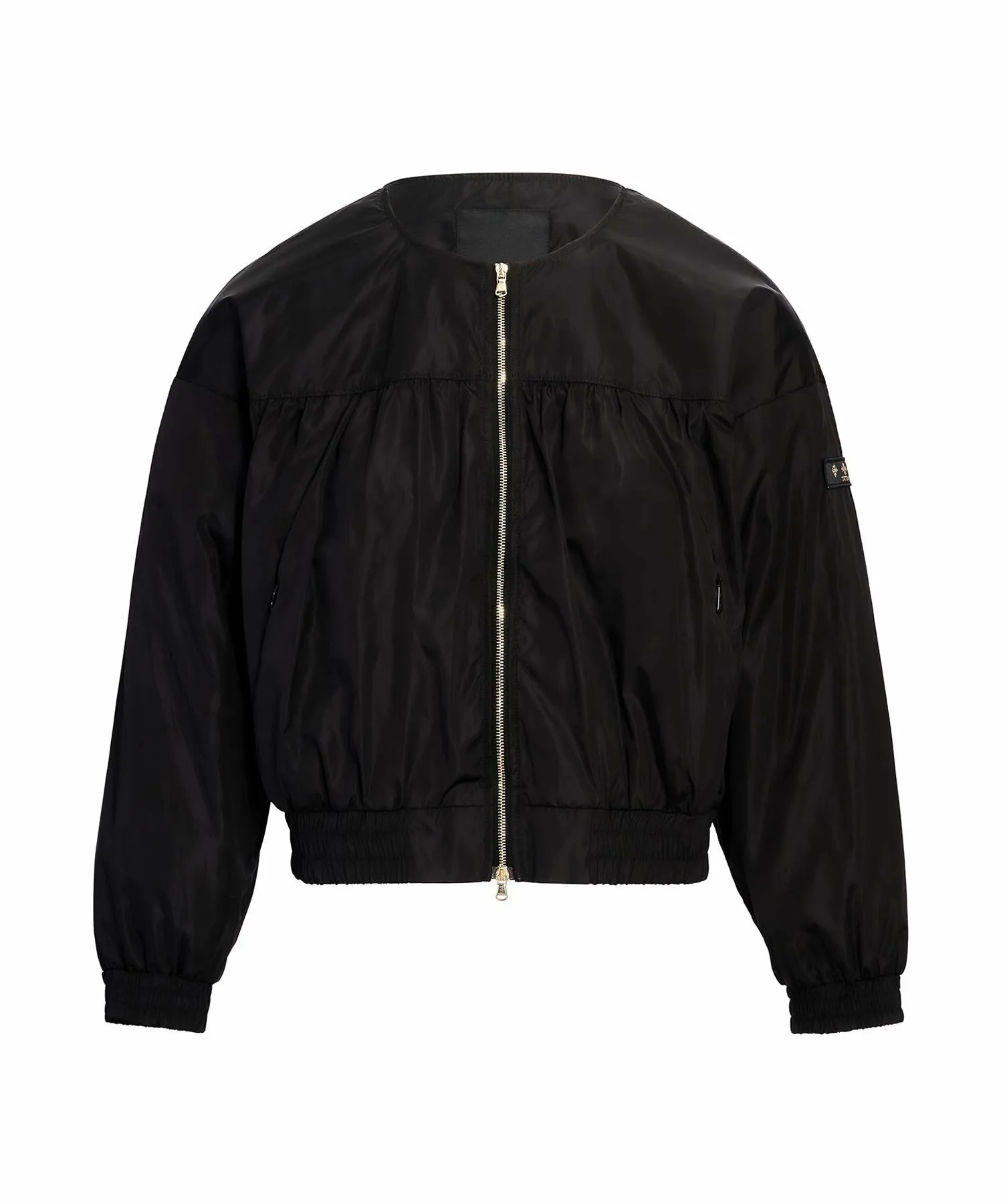 Эта легкая куртка без воротника изготовлена из легкой, водоотталкивающей нейлоновой тафты. Щедро собранные передние и задние швы создают трехмерный эффект. Зауженные манжеты и нижний край формируют четкий силуэт. Короткая длина позволяет легко сочетать ее с любыми брюками или юбками. Двойная металлическая молния добавляет элегантности дизайну. Эта куртка без подкладки легкая и удобная в носке. [Примечание]