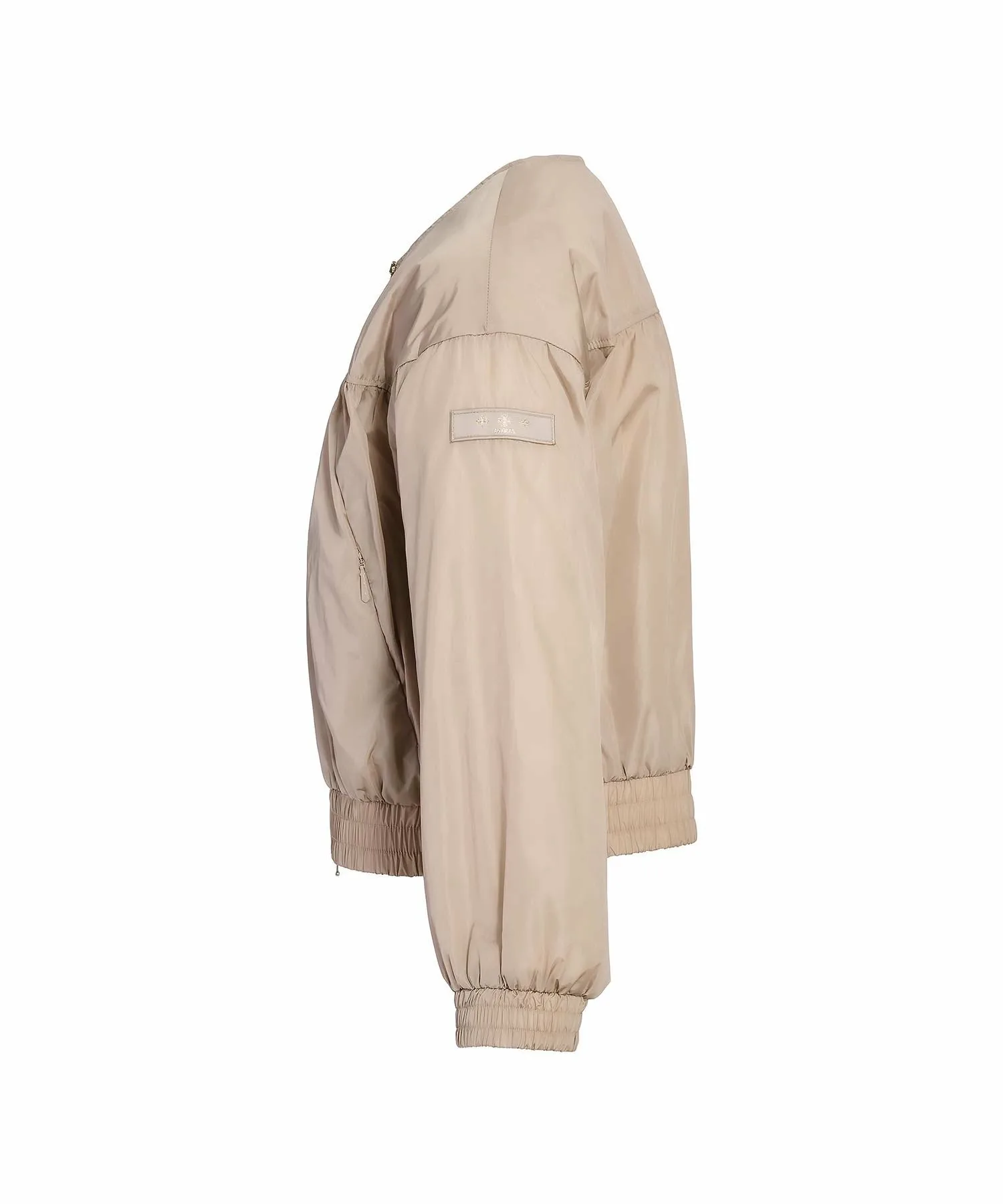 Эта легкая куртка без воротника изготовлена из легкой, водоотталкивающей нейлоновой тафты. Щедро собранные передние и задние швы создают трехмерный эффект. Зауженные манжеты и нижний край формируют четкий силуэт. Короткая длина позволяет легко сочетать ее с любыми брюками или юбками. Двойная металлическая молния добавляет элегантности дизайну. Эта куртка без подкладки легкая и удобная в носке. [Примечание]