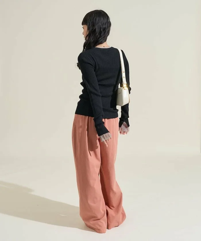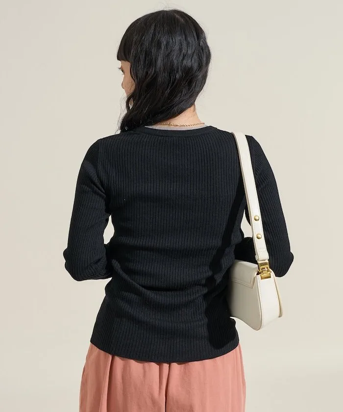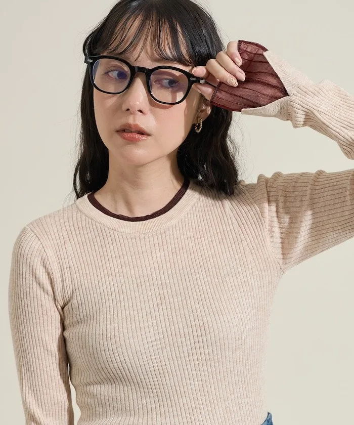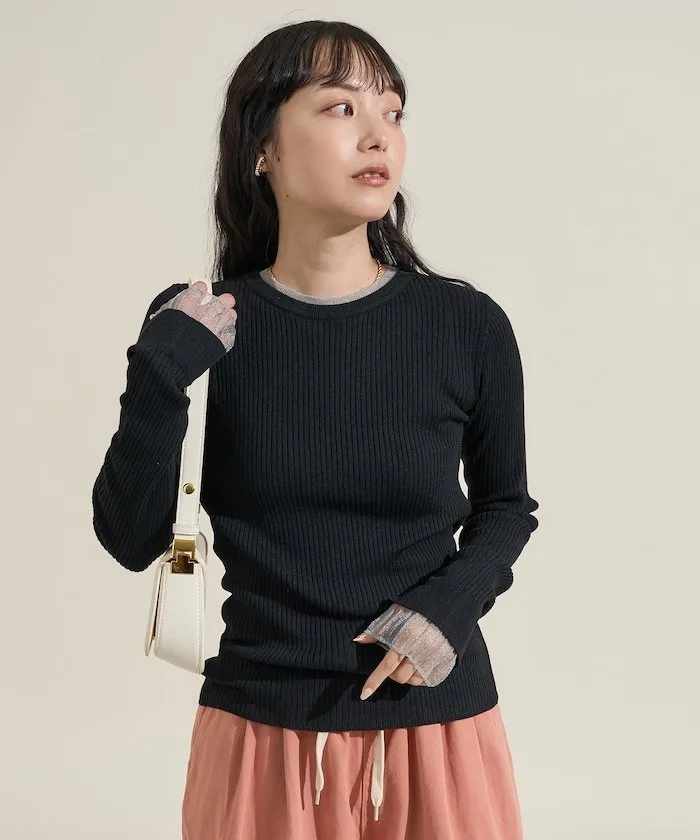 ●Этот ребристый трикотаж имеет привлекательный дизайн, создающий впечатление, будто он надет поверх прозрачной блузки.