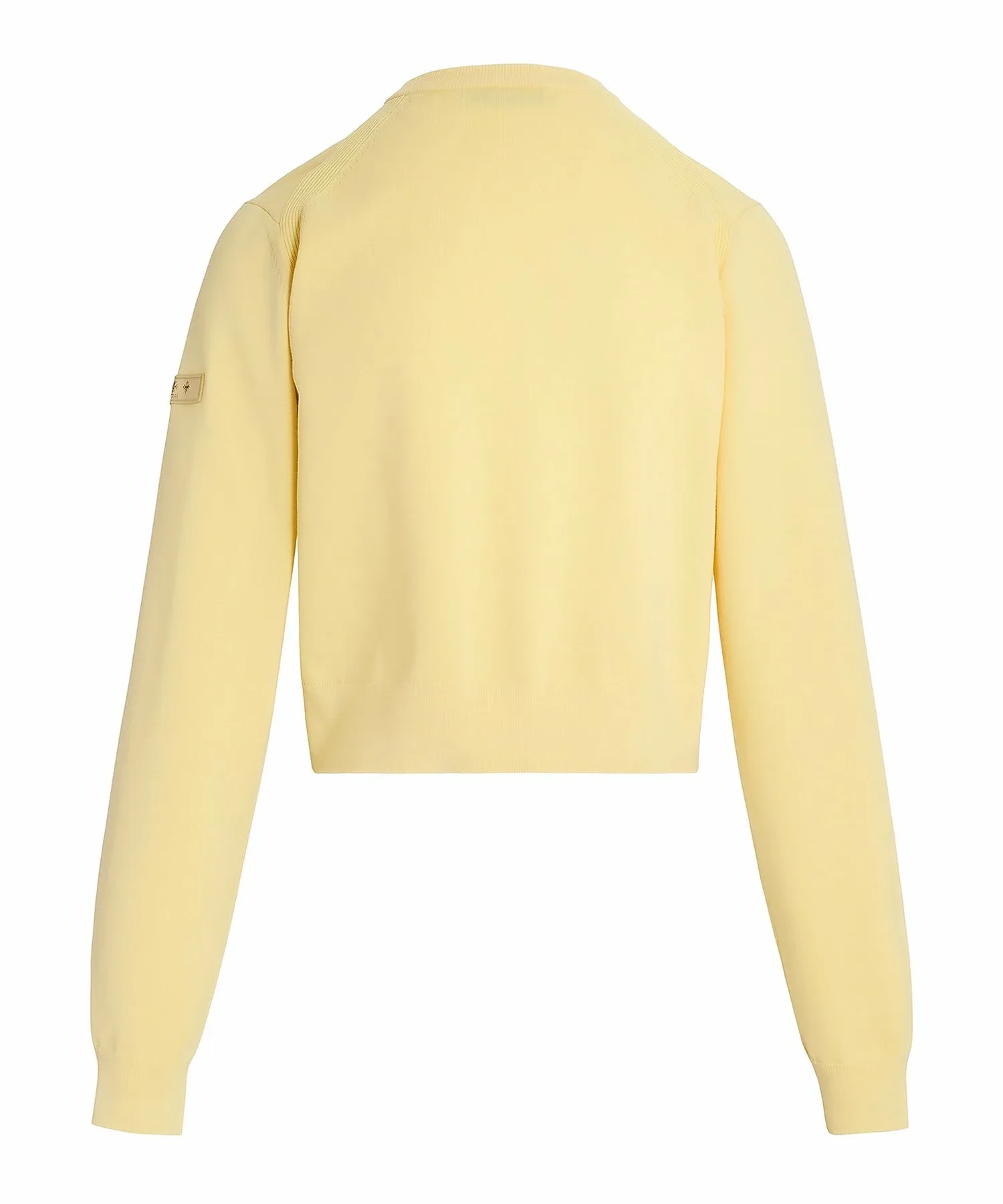 Кардиган с круглым вырезом, изготовленный из плотной хлопковой смеси.