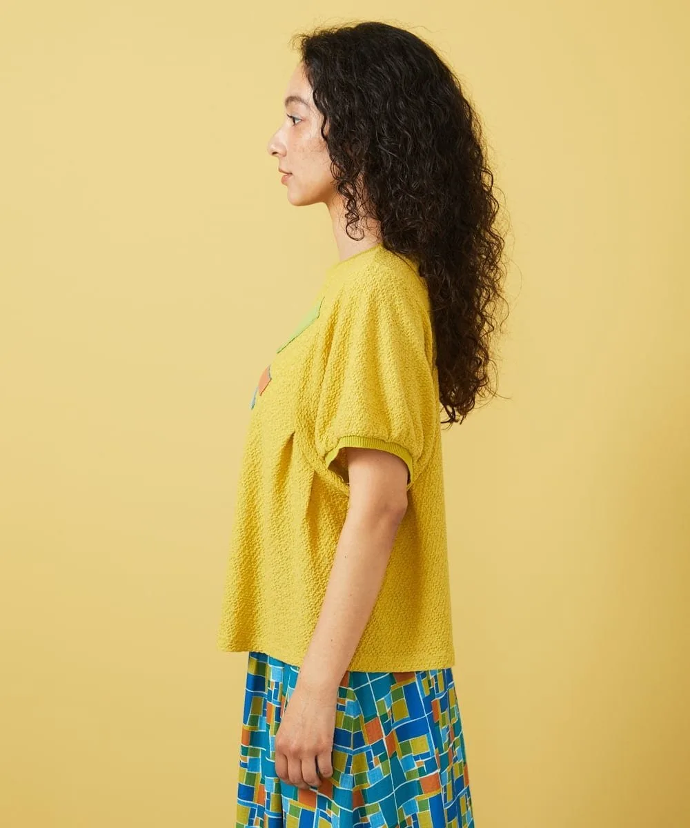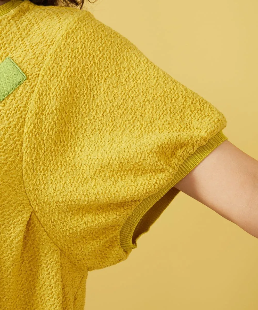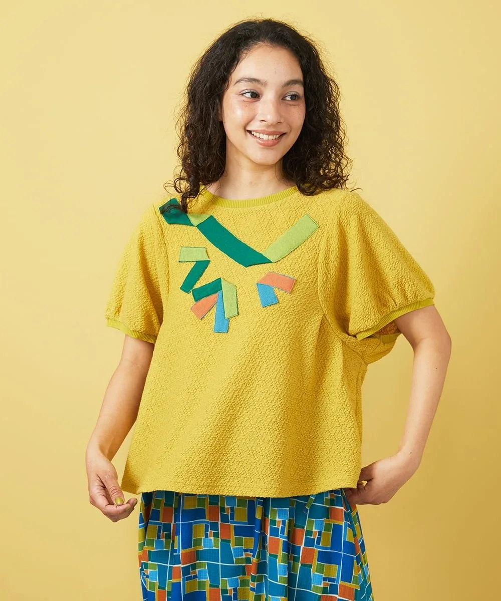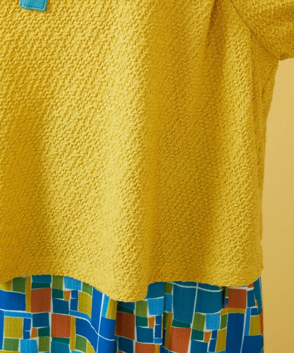 Ослепительно яркий крой. Вдохновлен темой «солнечного желтого». Свободный силуэт удобен даже в жаркие дни. В области груди присутствует трикотажный элемент в цветовой гамме, характерной для HOKOMOMORA, создающий уникальный дизайн. Мягкие рукава-фонарики придают ему зрелый и милый вид. Его можно носить как блузку, что делает его центральным элементом любого образа. Этот тщательно сшитый крой — наш лучший выбор в этом сезоне.