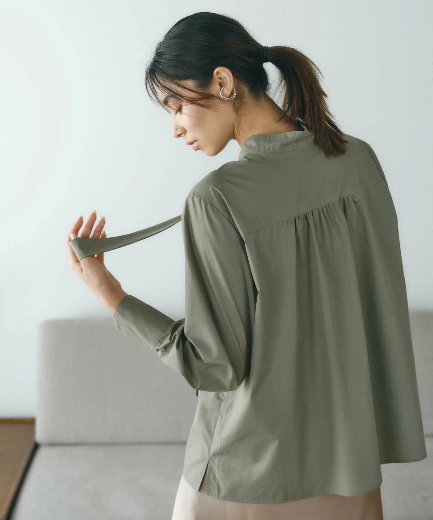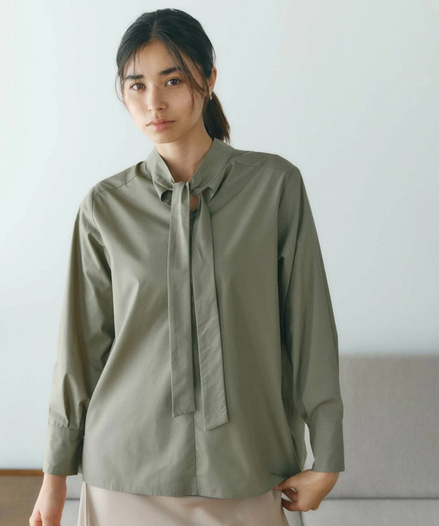 Эта блузка украшена деталями в виде банта, которые добавляют модный штрих. Двусторонний дизайн позволяет носить ее как спереди, так и сзади. Элегантный, большой бант и стильный воротник-стойка позволяют менять образ в зависимости от настроения и наряда. Также отлично подходит в качестве нижнего слоя и прекрасно смотрится в сочетании с курткой или кардиганом.