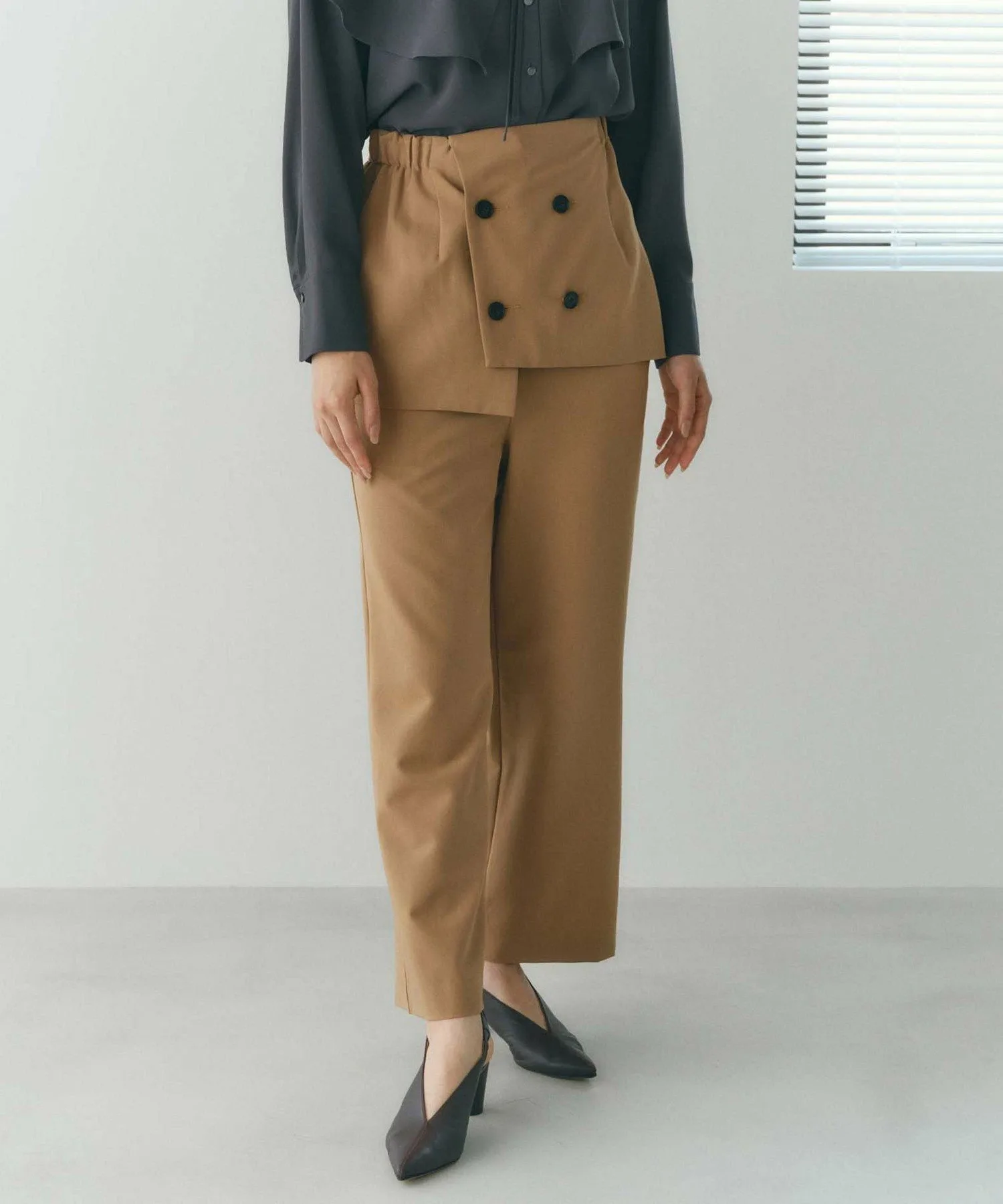 Хотя эти брюки выглядят как простые прямые брюки, они имеют съемную накидку. Накидку можно надеть поверх верхней части тела как бюстье, обернуть вокруг талии как юбку поверх брюк или снять и носить как простые брюки. Пояс брюк полностью эластичный для комфортной посадки. Даже при ношении в качестве бюстье эластичные вставки по бокам обеспечивают плотное прилегание, не стесняя движений. Свободный прямой силуэт сочетает в себе модный стиль и универсальность.