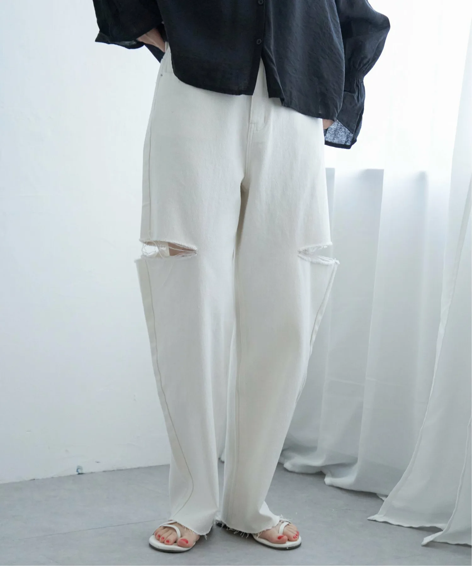 Широкие джинсы с выразительными потертостями с обеих сторон.