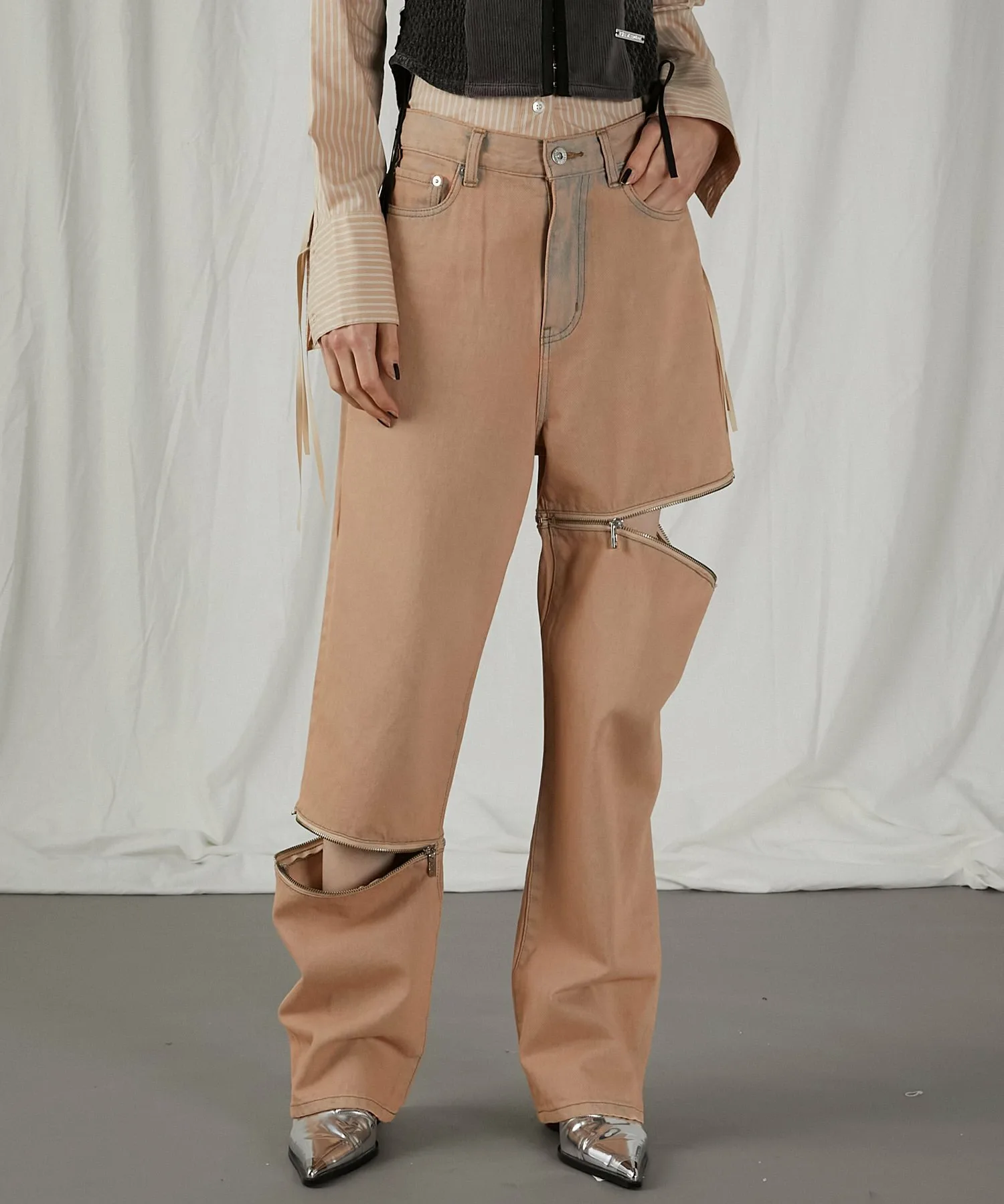 Дизайн джинсов с асимметричной молнией для дерзкого образа.