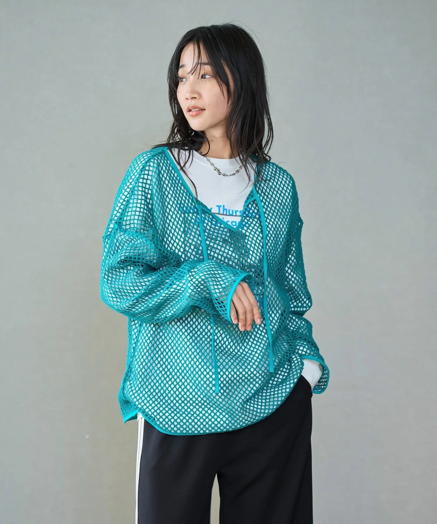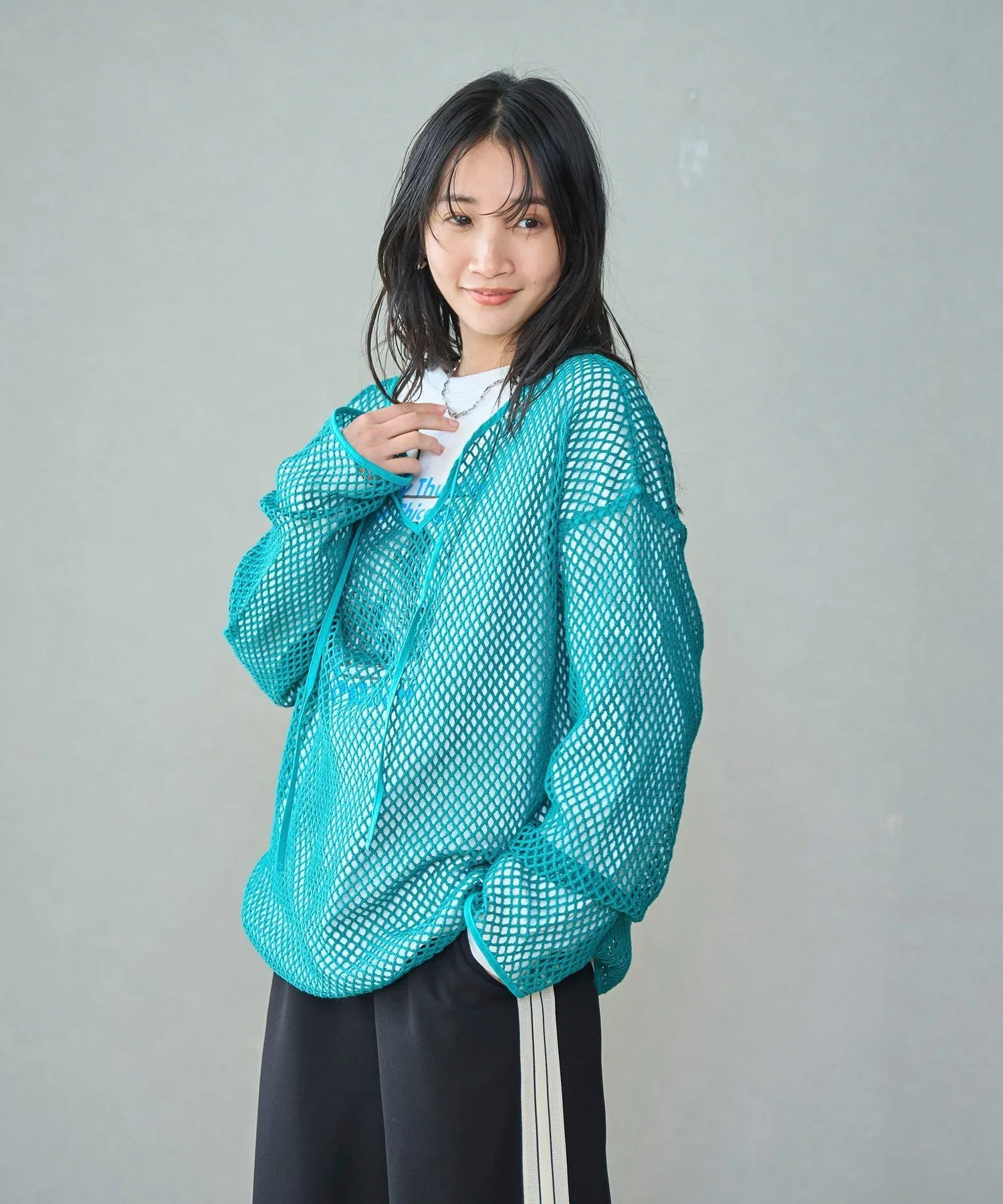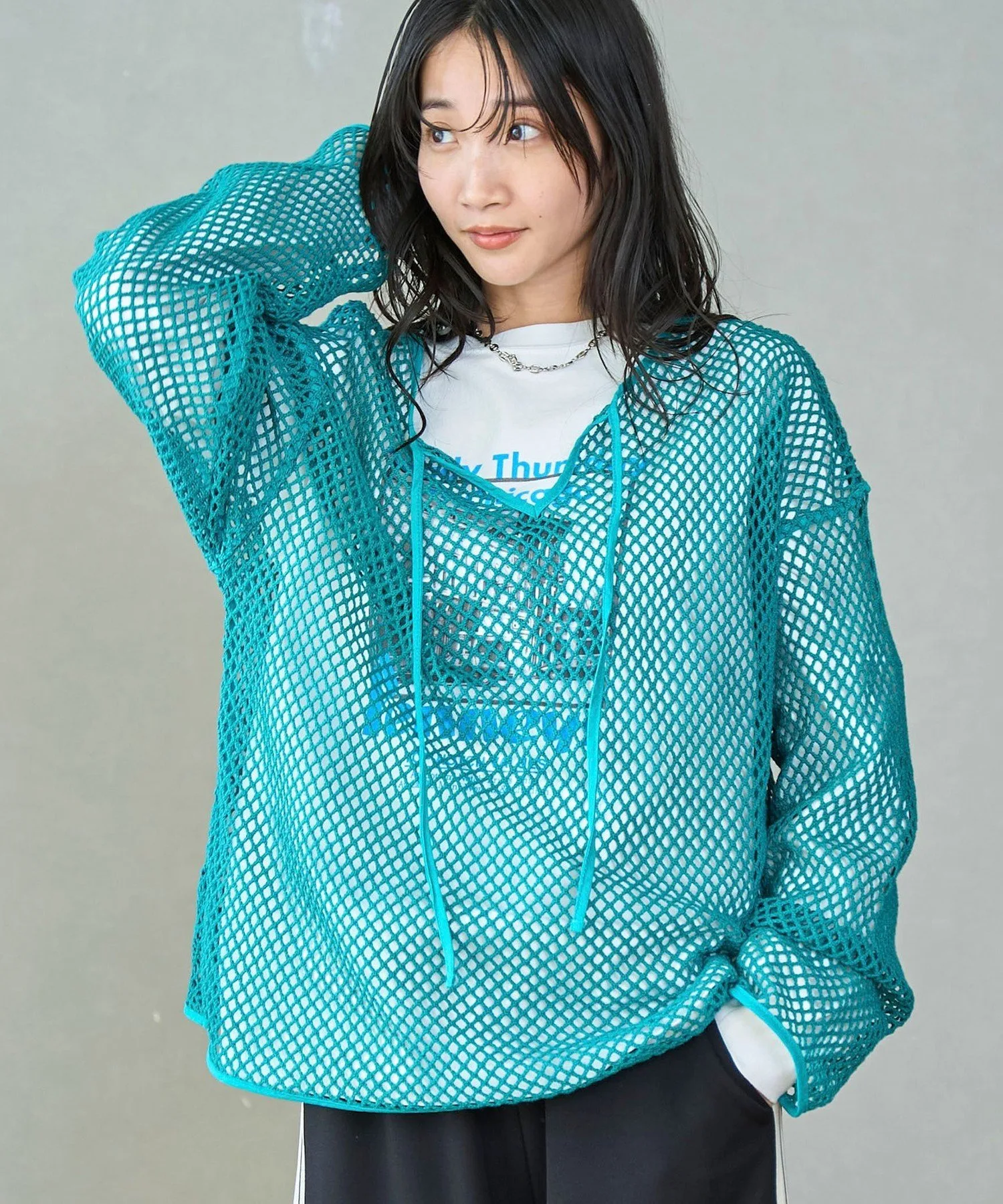 Этот пуловер выполнен из плотной сетки, что позволяет создавать разнообразные многослойные образы.