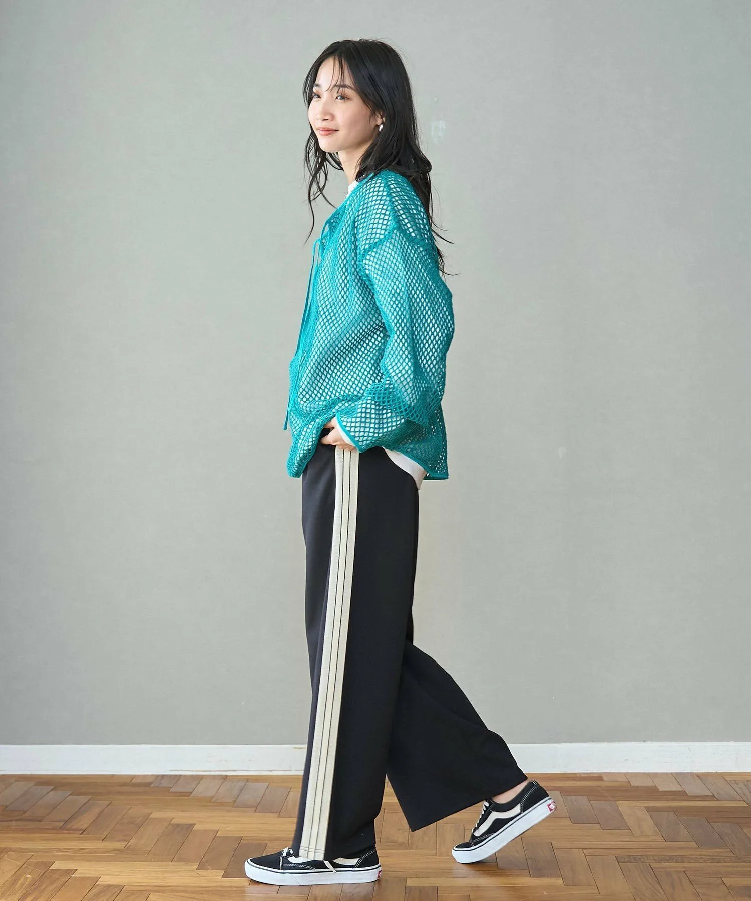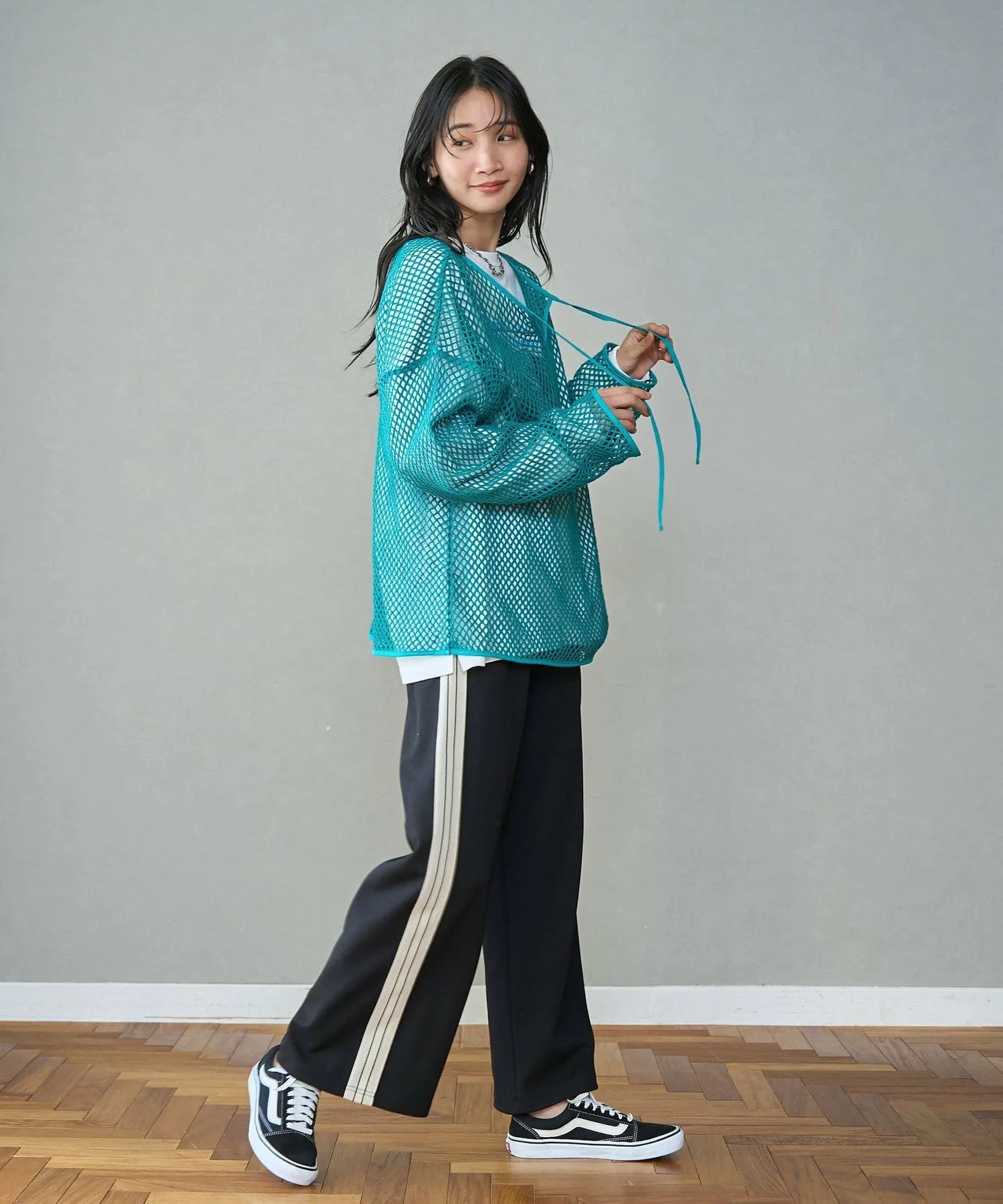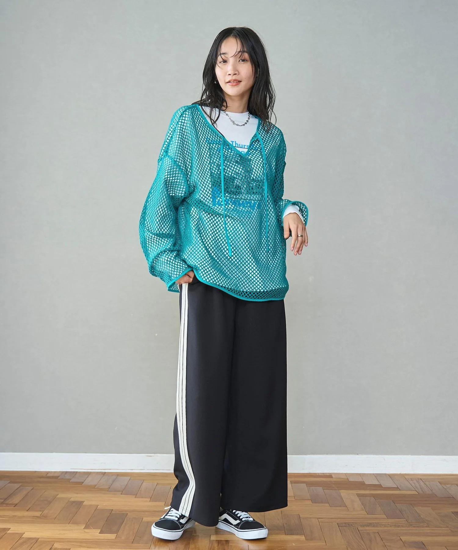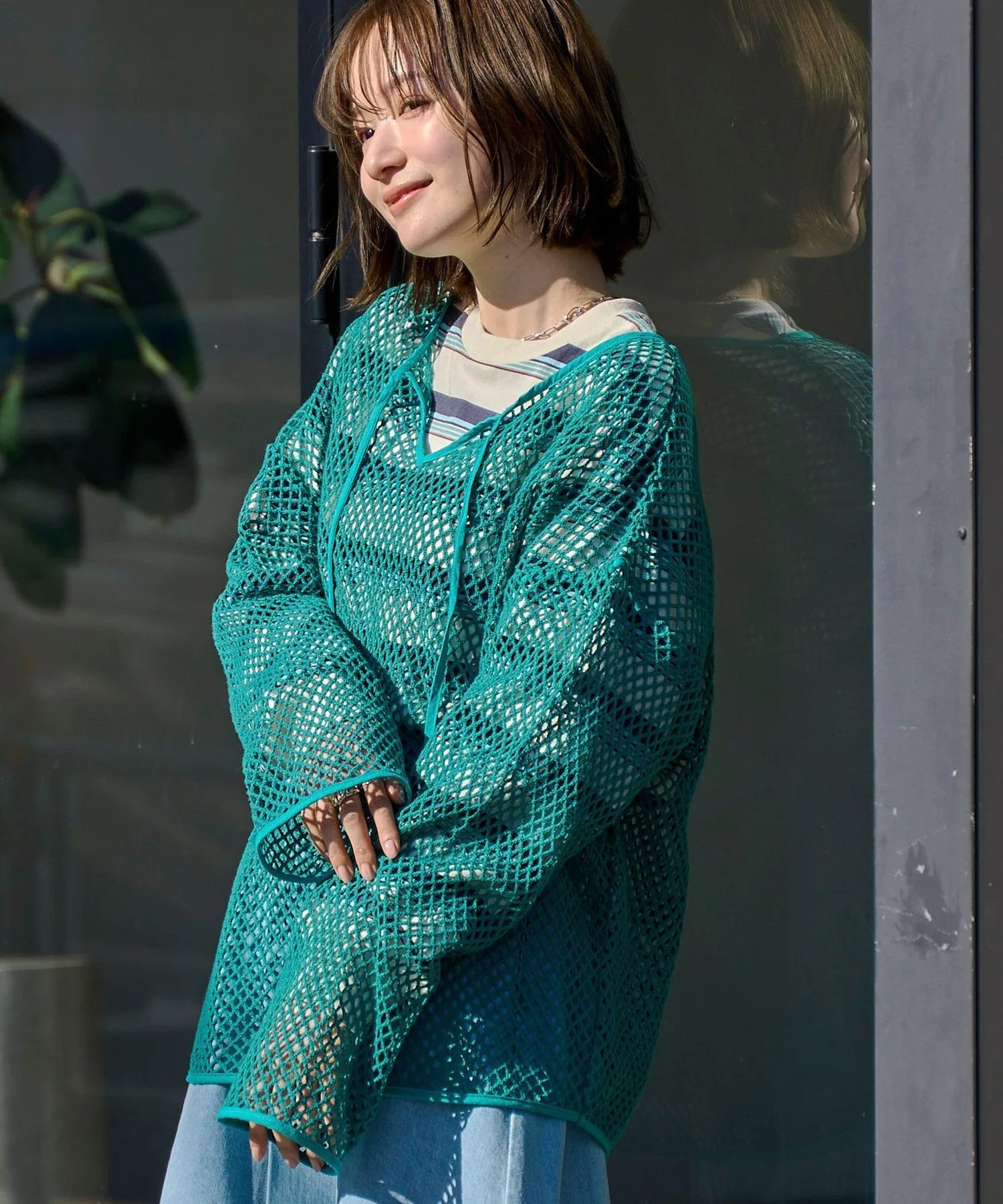Этот пуловер выполнен из плотной сетки, что позволяет создавать разнообразные многослойные образы.