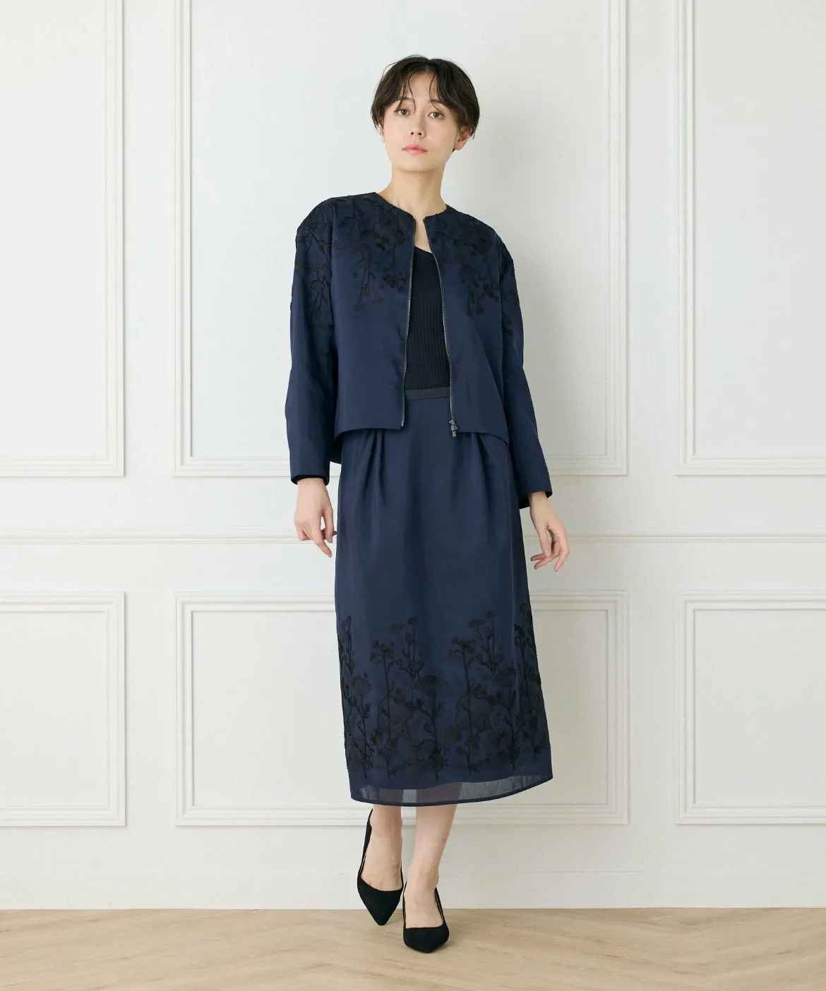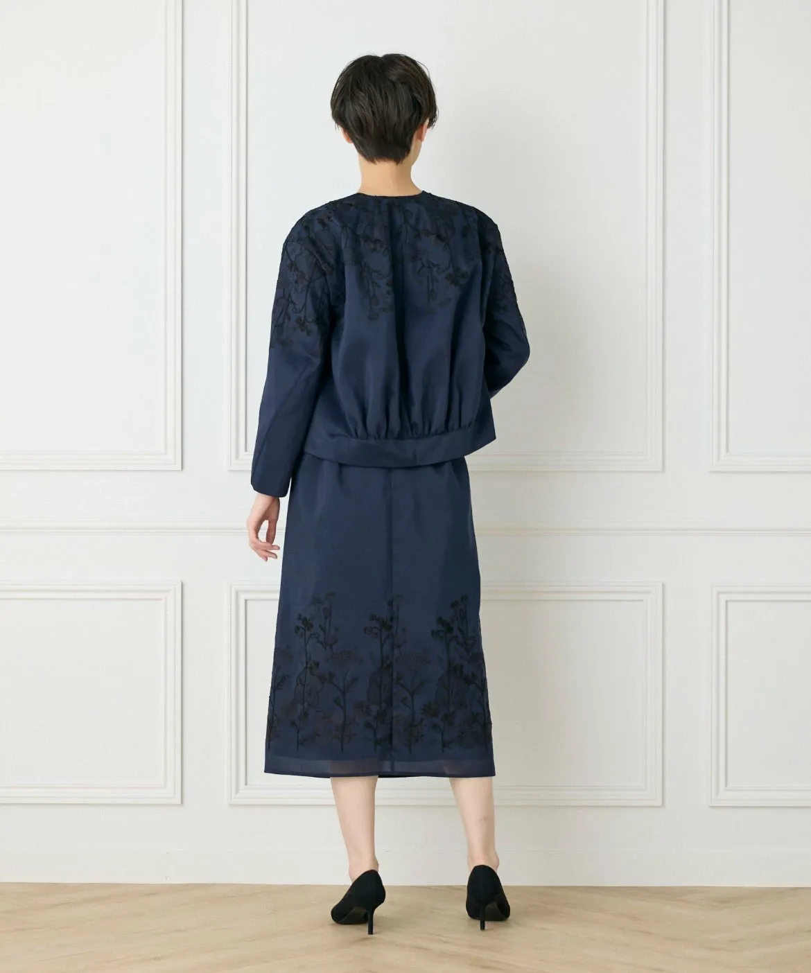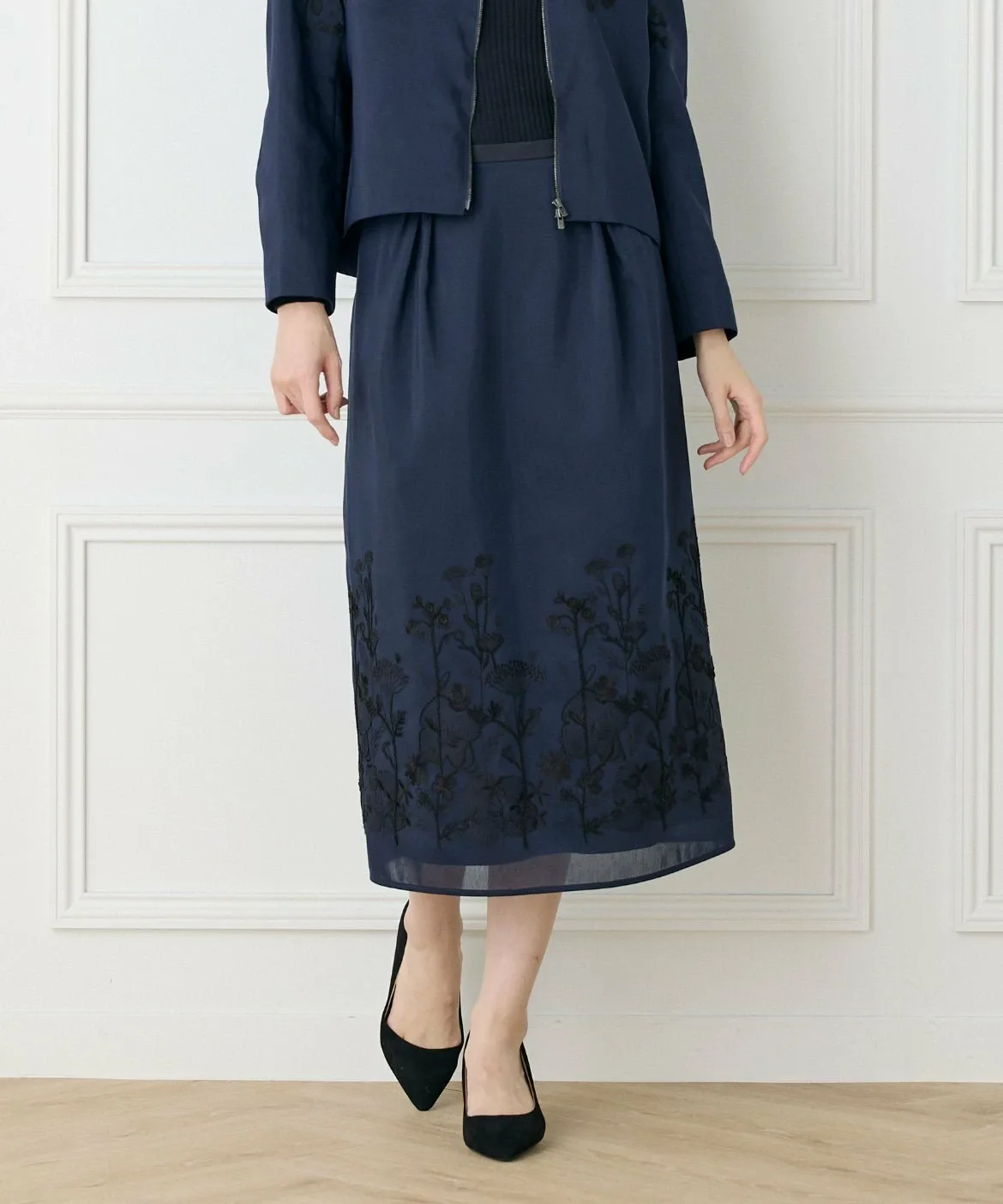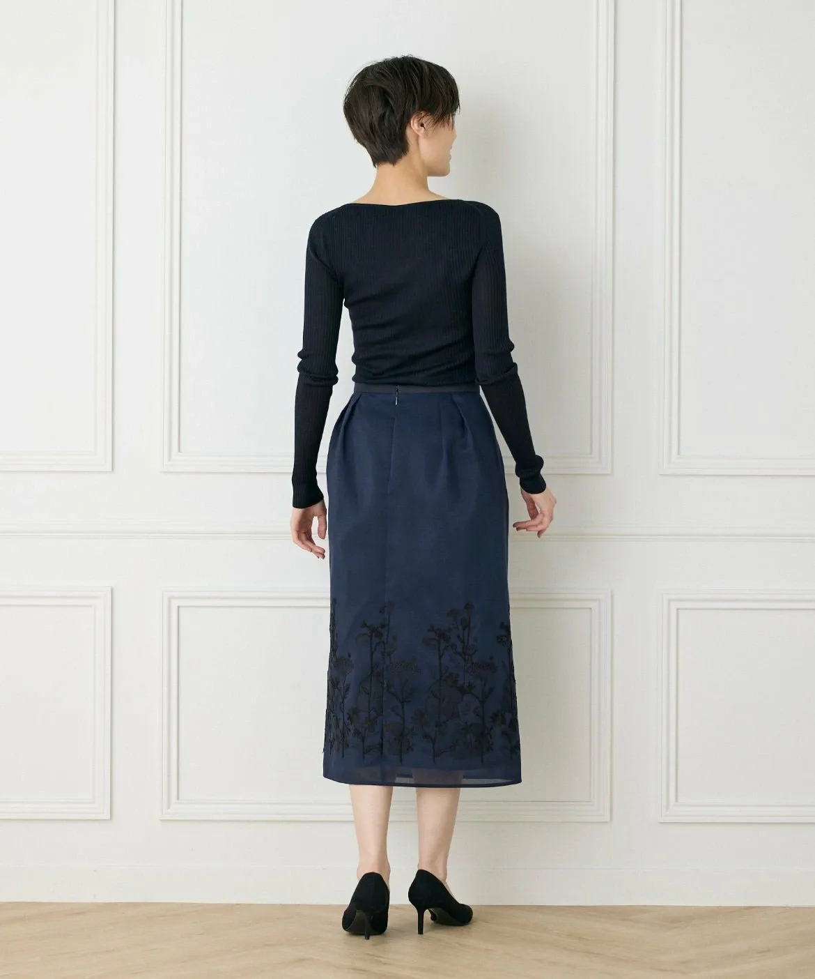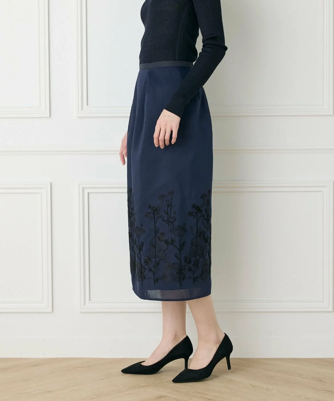 Длина макси подчеркивает вертикальные линии, делая это изделие стильным. Органза, отличающаяся своей плотностью и естественным видом, представляет собой трехмерную вышитую ткань, выполненную из плетеной нити. Вышивка по низу создает великолепный эффект. Мы также рекомендуем сочетать его с блузоном из того же материала.