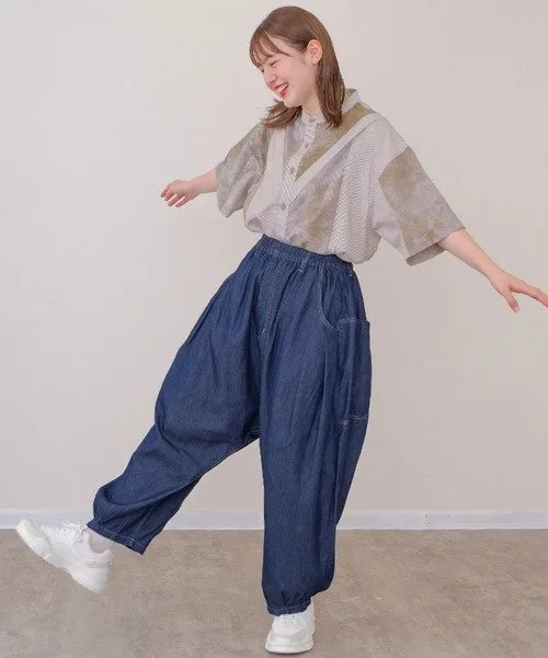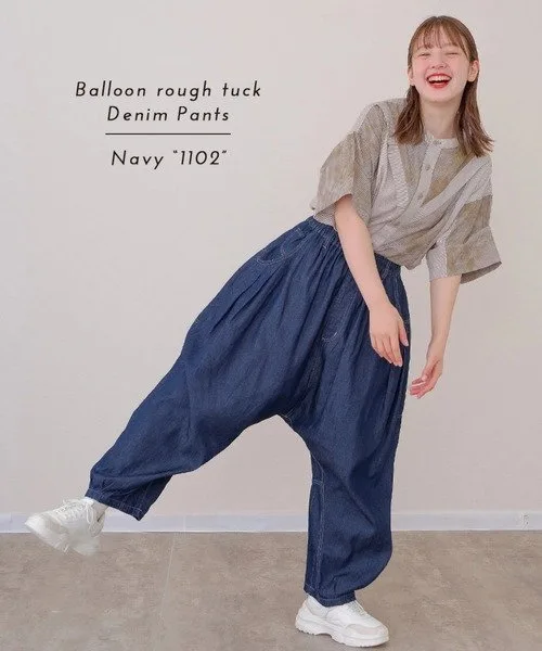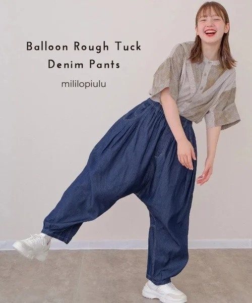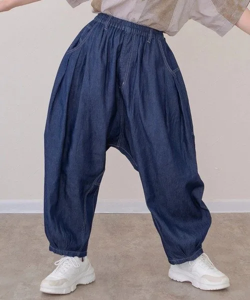 Свободные брюки из легкого денима. Полностью эластичный пояс делает их удобными в ношении.