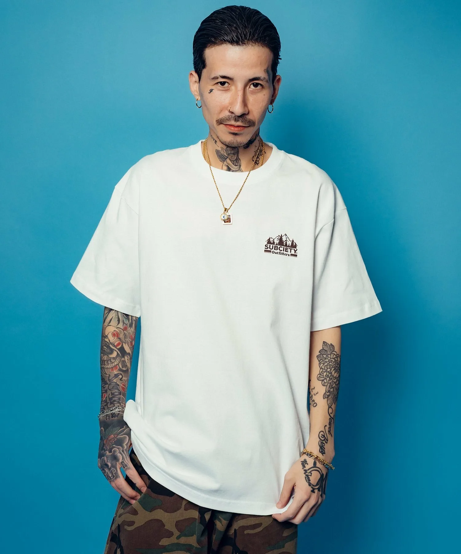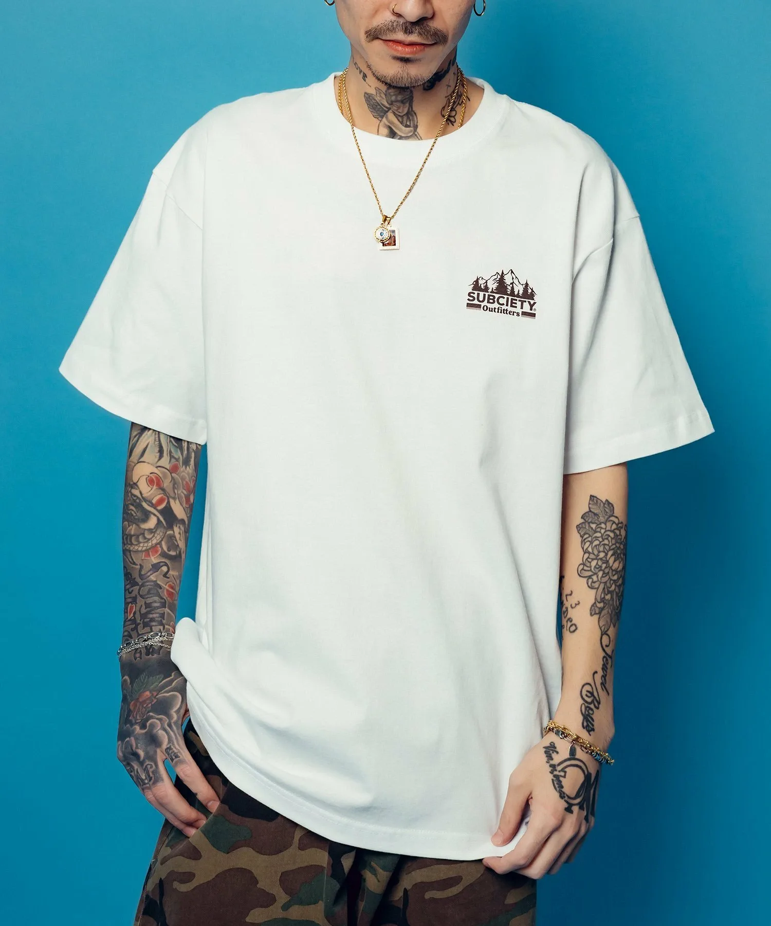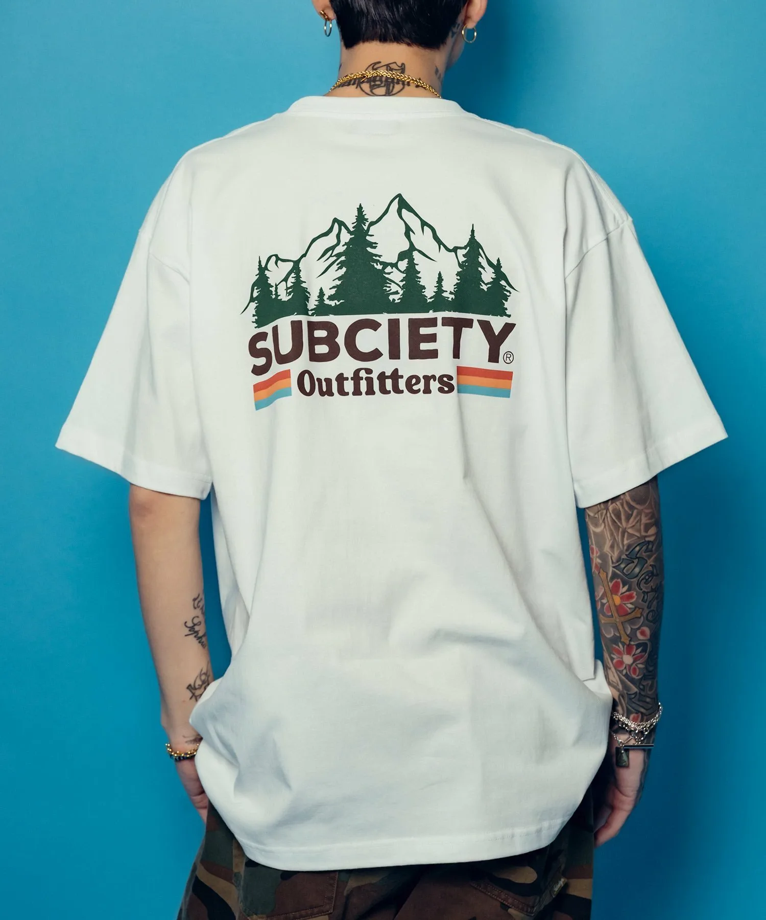 Графический рисунок «Outfitters» с изображением деревьев и природных цветов создает атмосферу природы и напечатан на левой стороне груди и спине.