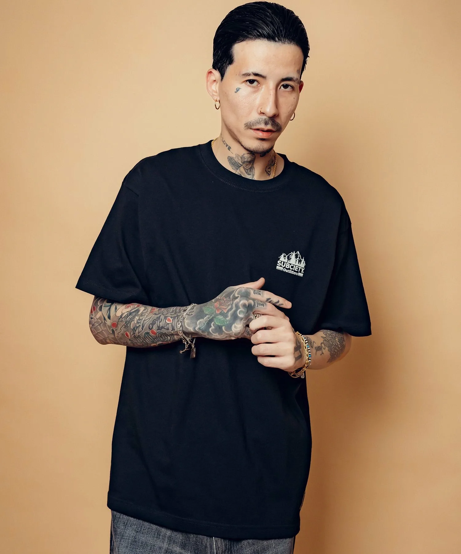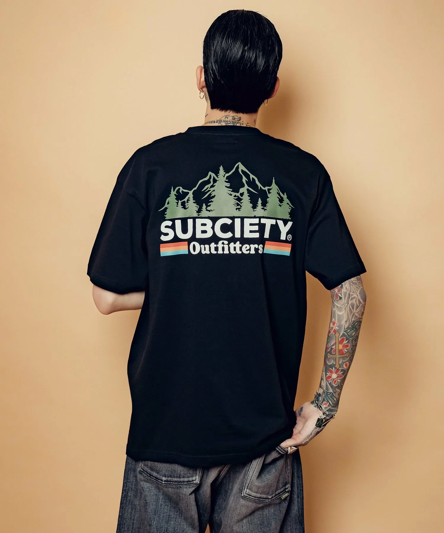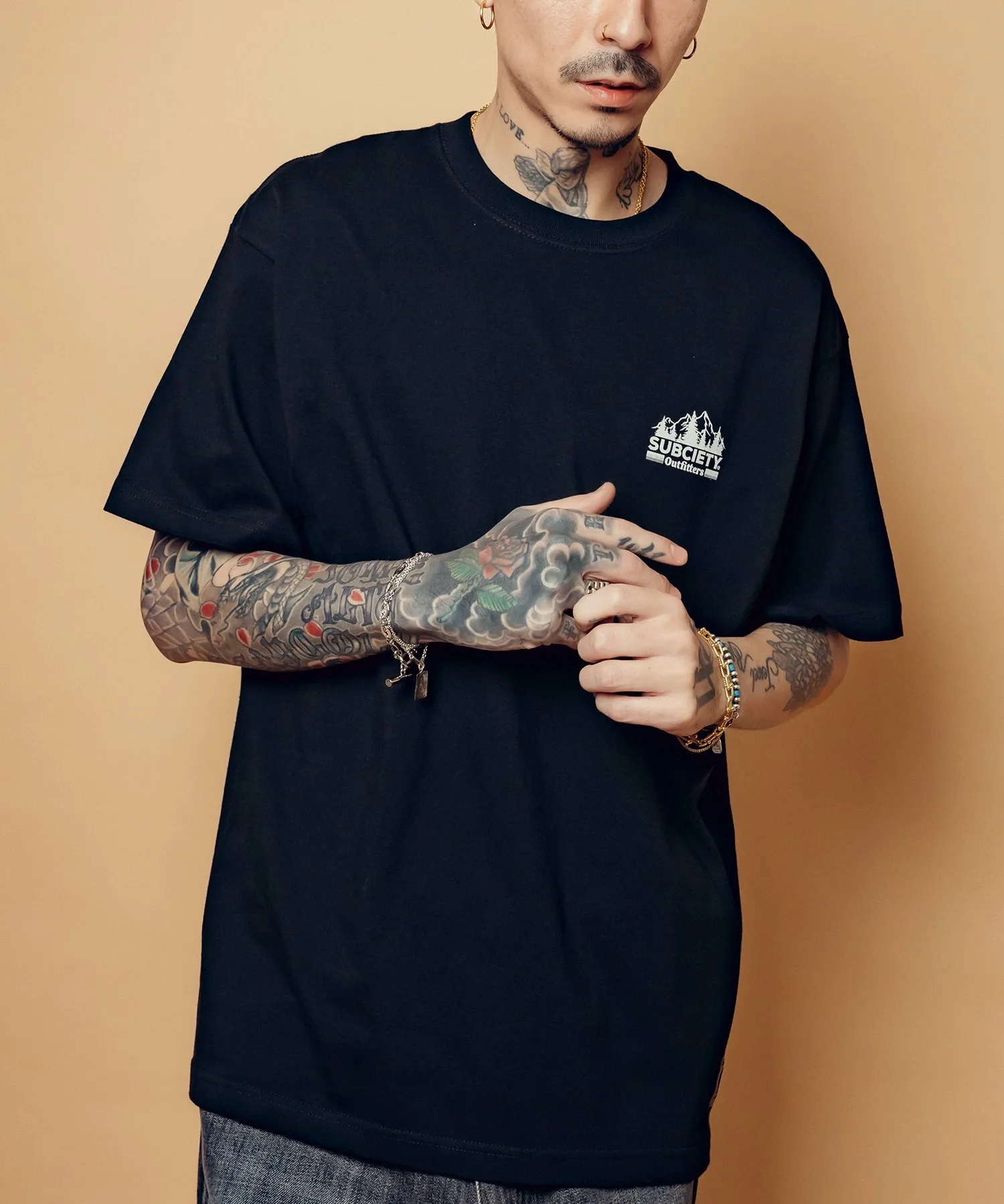 Графический рисунок «Outfitters» с изображением деревьев и природных цветов создает атмосферу природы и напечатан на левой стороне груди и спине.