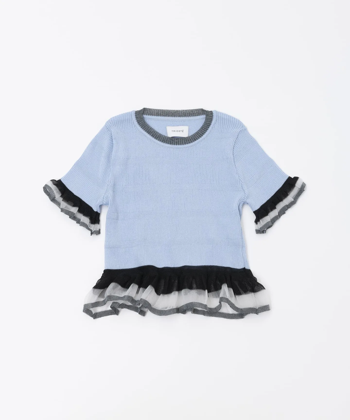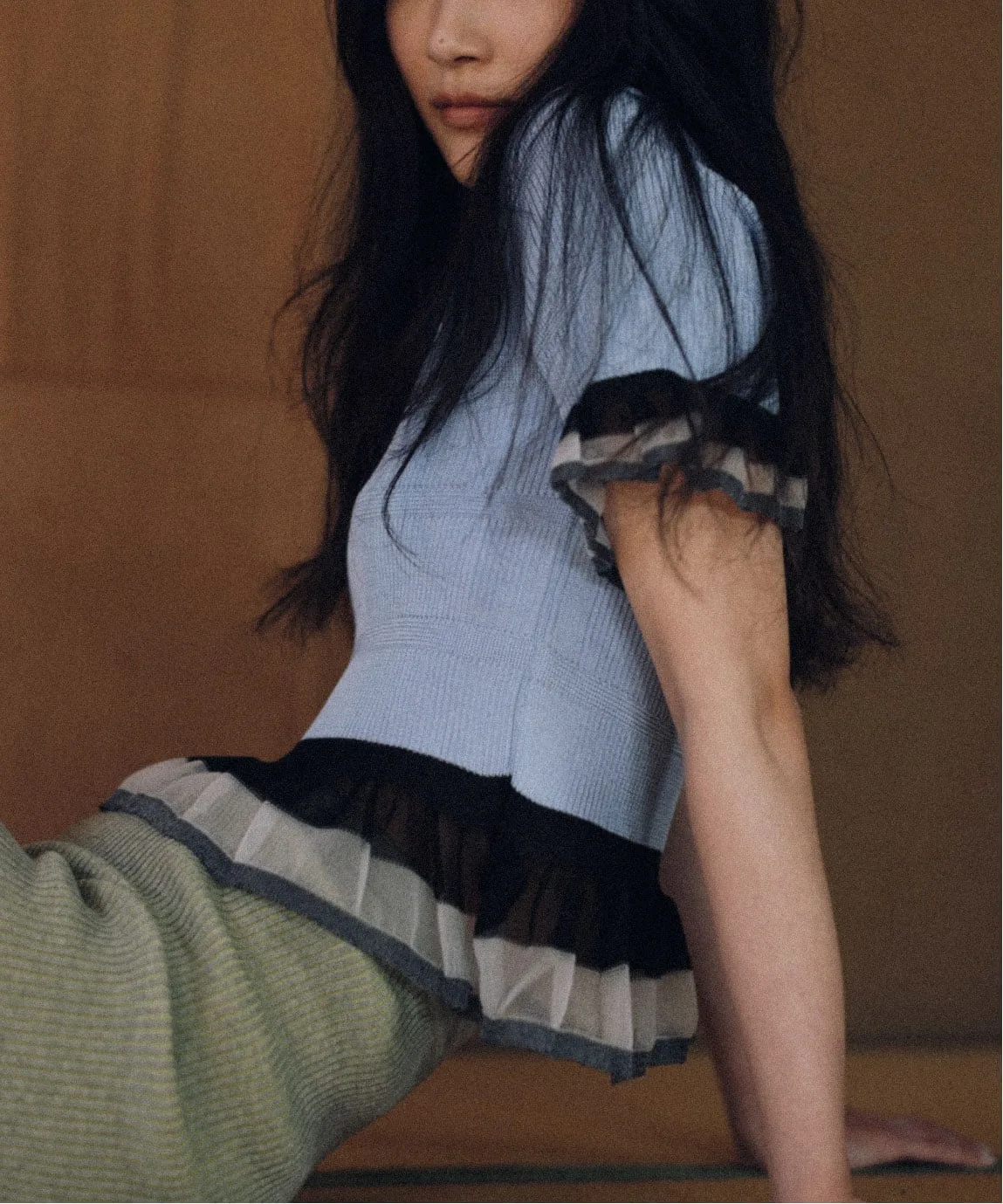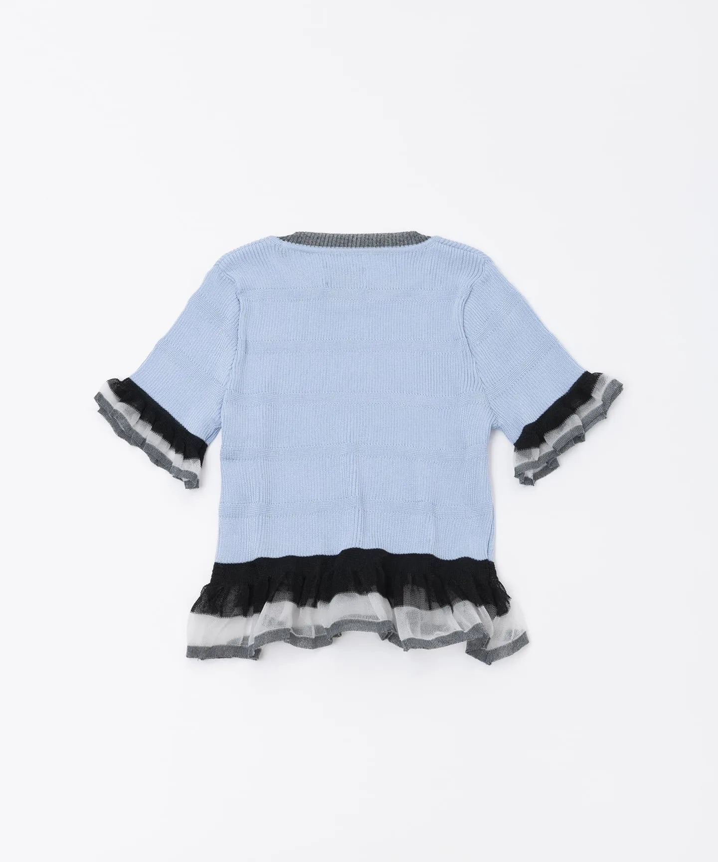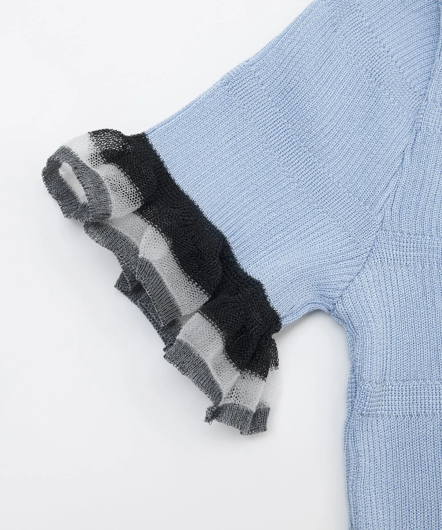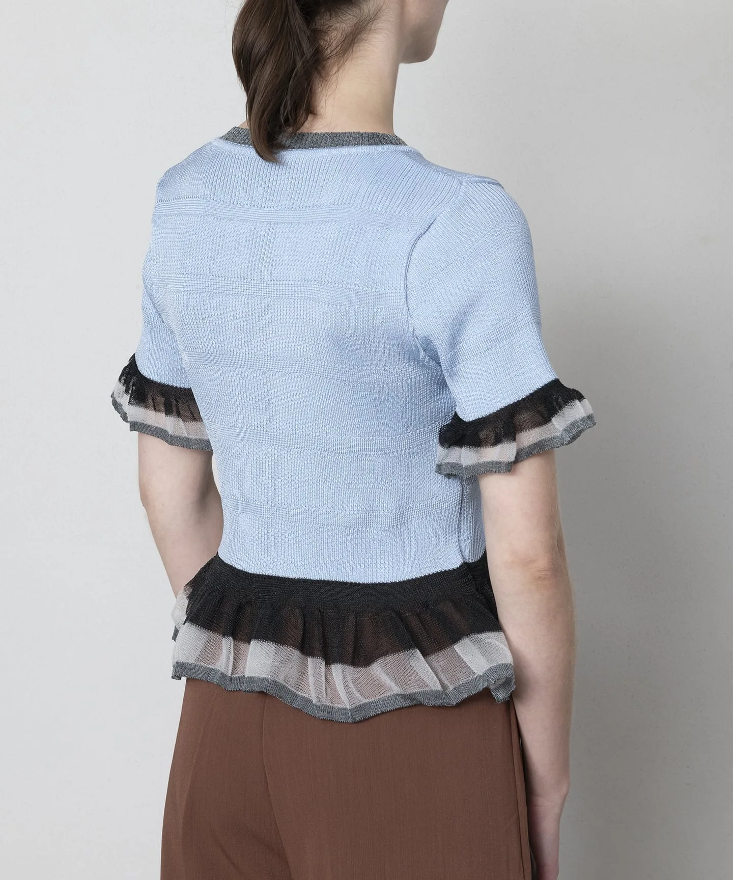 Этот трикотаж выполнен из блестящего материала с прозрачными оборками. Мягкая ткань идеально облегает фигуру. Элегантный блестящий материал является изюминкой, придавая изделию женственный вид.