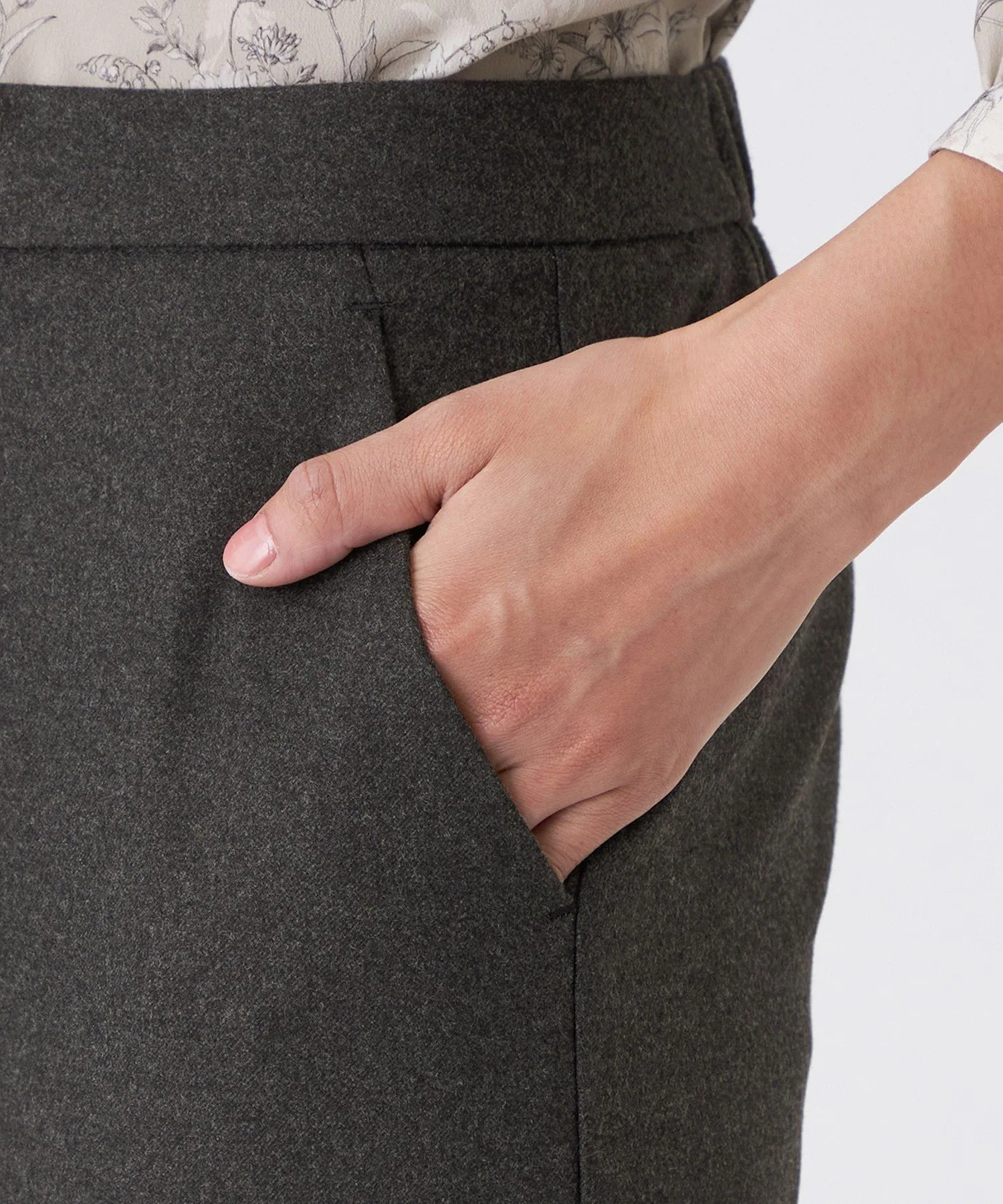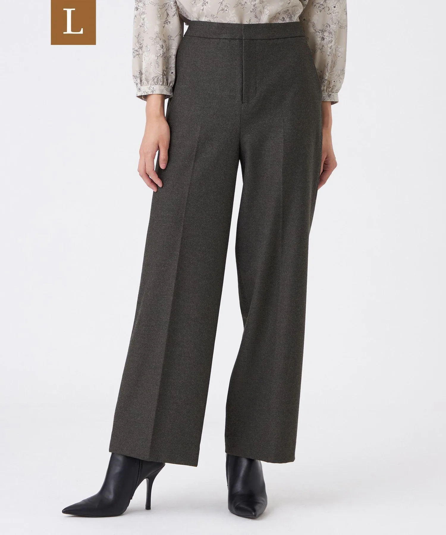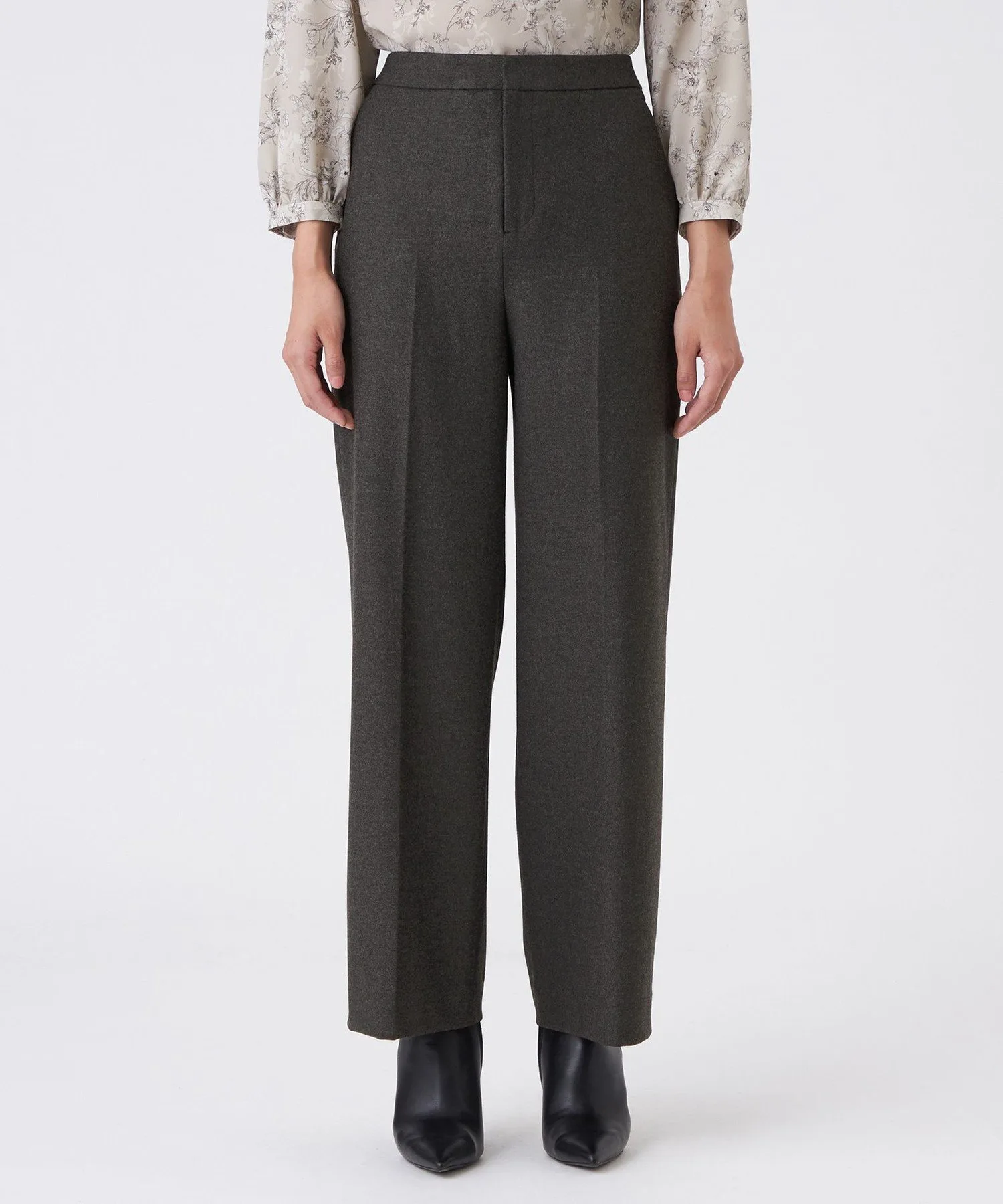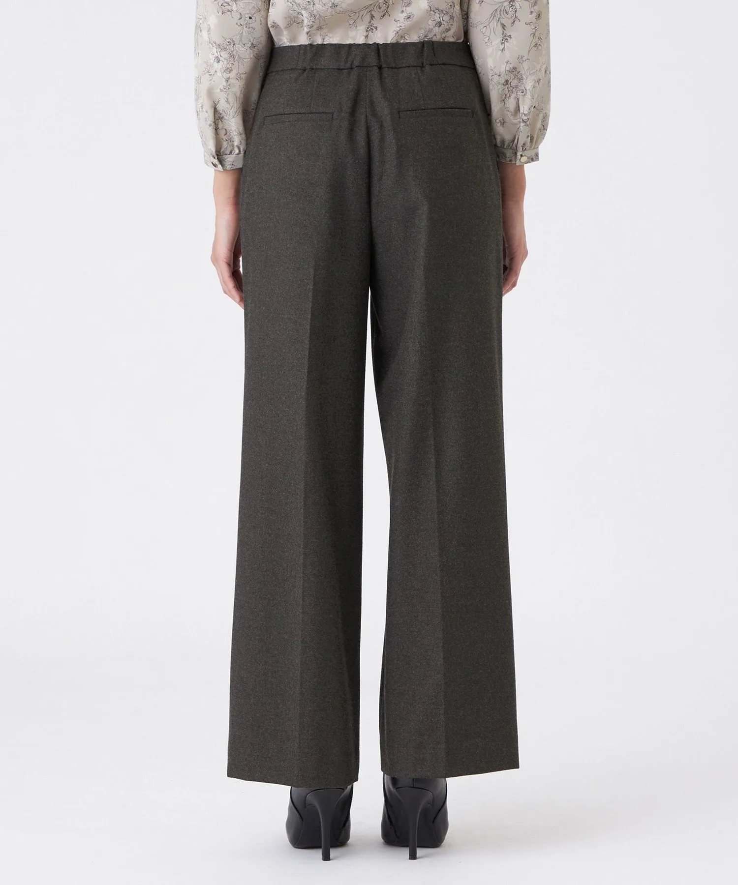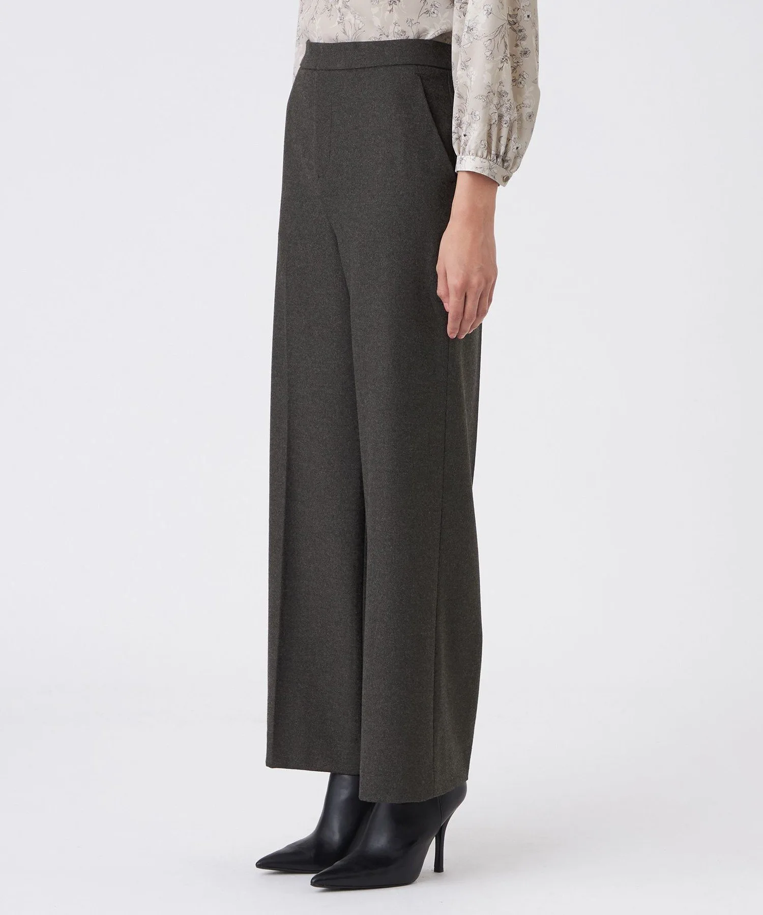 Широкий силуэт визуально удлиняет ноги. Отсутствие складок создает эффект стройности в области талии. Центральная складка формирует прямую, красивую форму штанин.