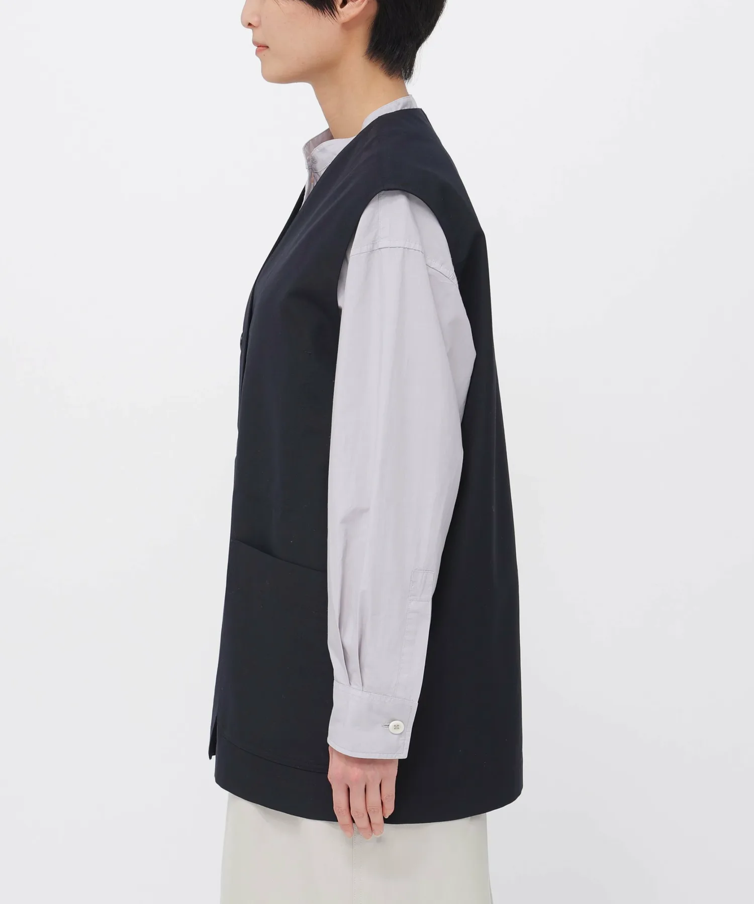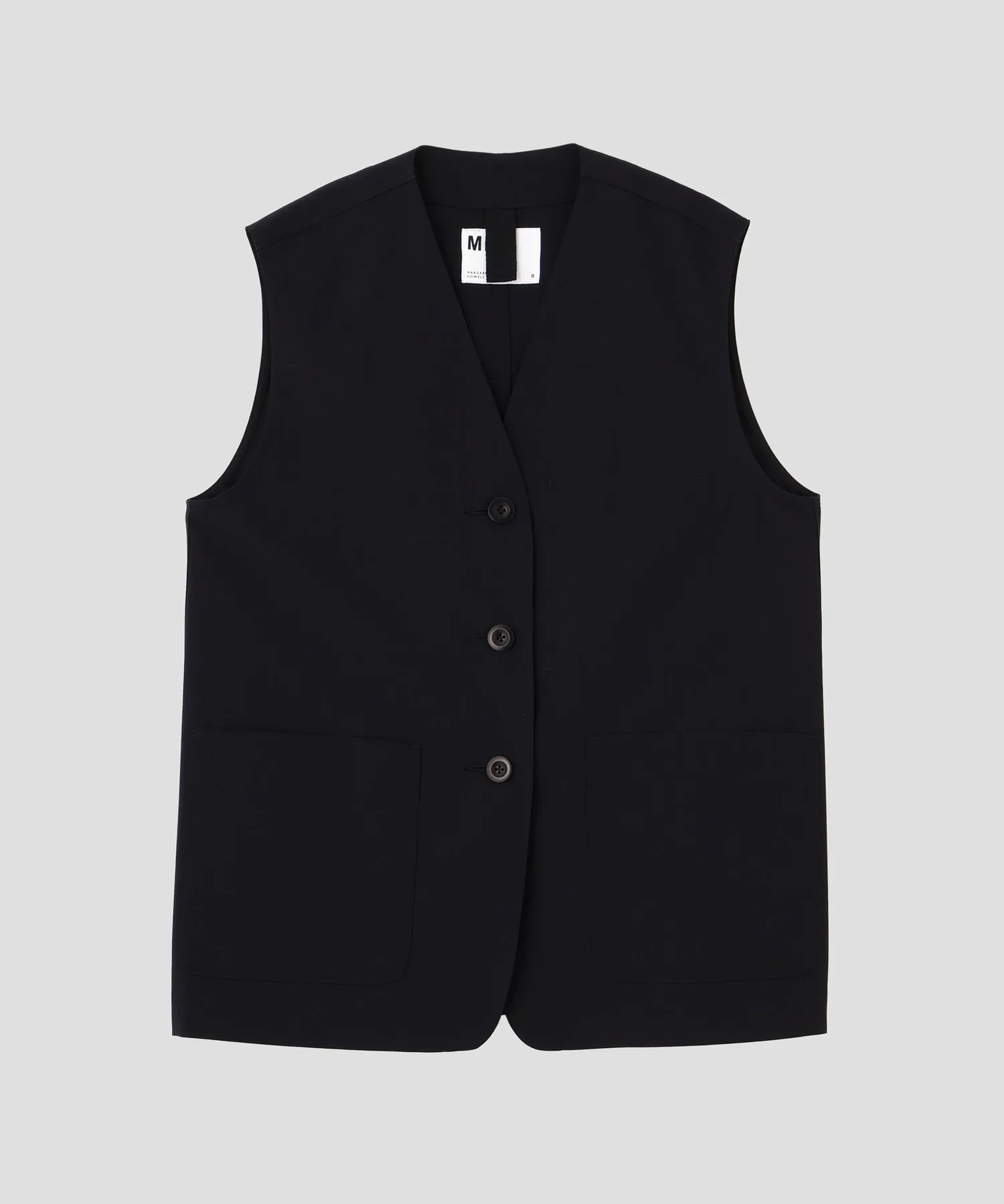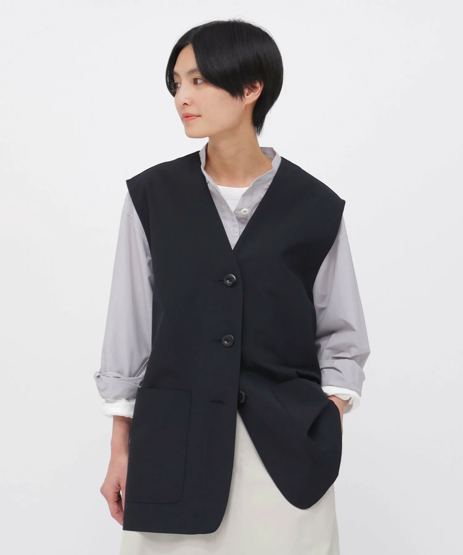 Дизайн жилета, напоминающего куртку, имеет удлиненный крой, благодаря чему он выглядит как мужская куртка, накинутая поверх него. Неглубокий V-образный вырез, большие карманы на поясе и разрезы сзади придают ему простой, но эффектный вид. Мы также рекомендуем сочетать его с брюками из того же материала.